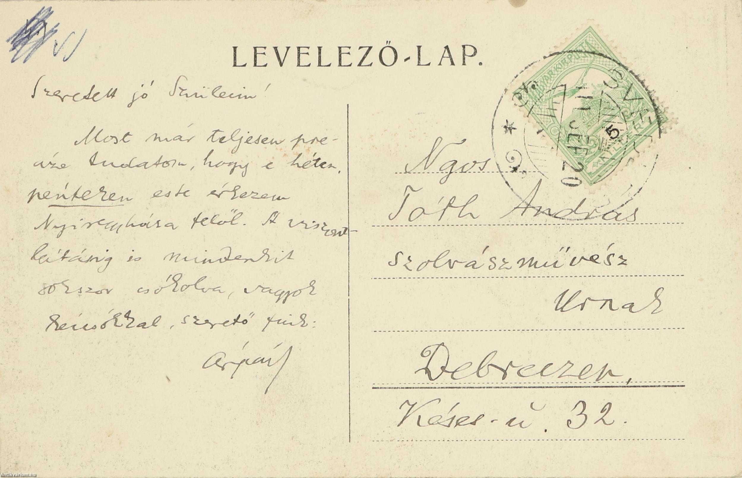 A lap címzése: „Ngos / Tóth András / szobrászművész / urnak / Debreczen. / Késes-u. 32.” A keltezetlen levél megírásának dátumáról pedig a feladási postabélyegző tanúskodik: Svedlér, 1911. szeptember 11.