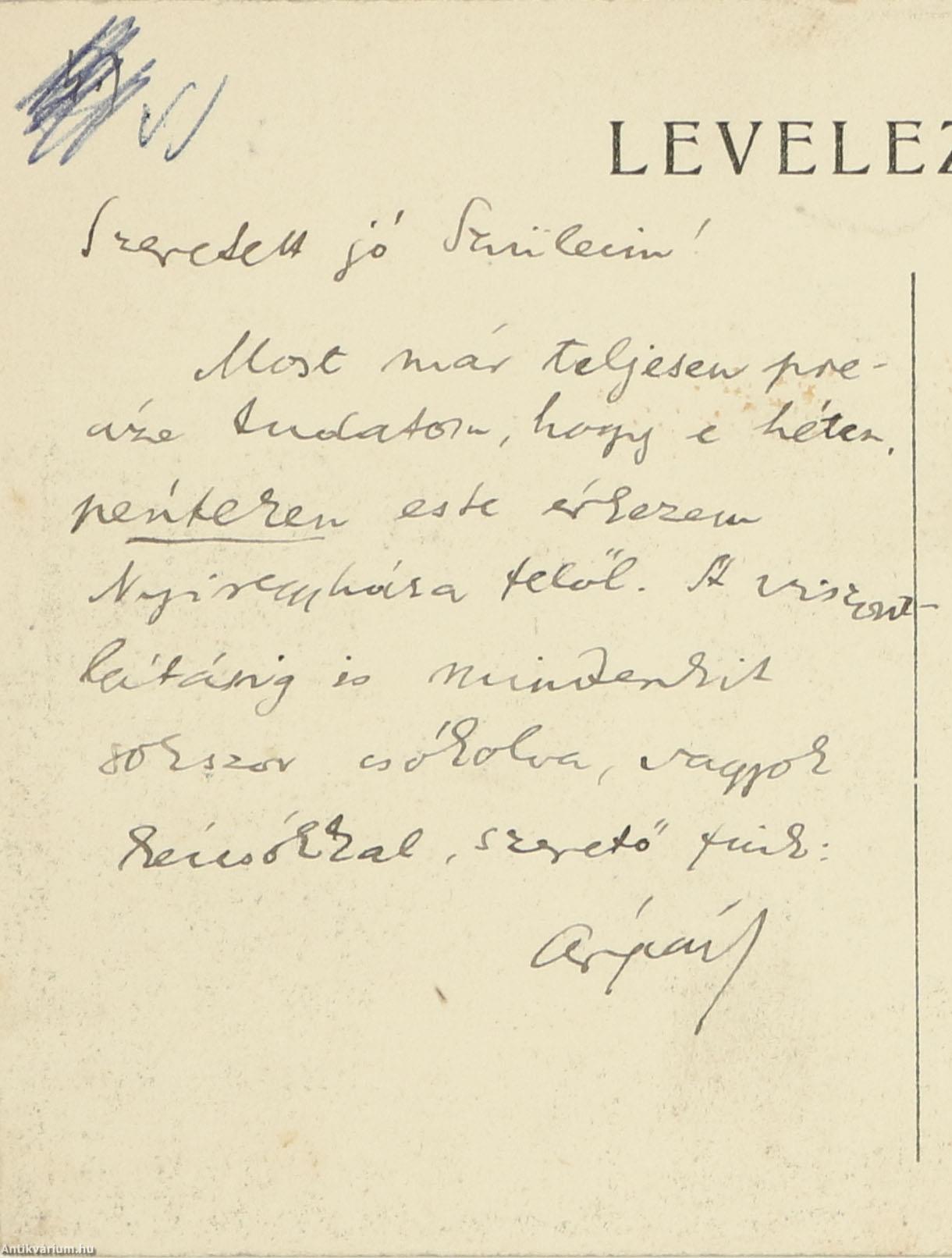 Most már teljesen precíze tudatom, hogy e héten, pénteken este érkezem Nyíregyháza felől. A viszontlátásig is mindenkit sokszor csókolva, vagyok kézcsókkal, szerető fiuk: