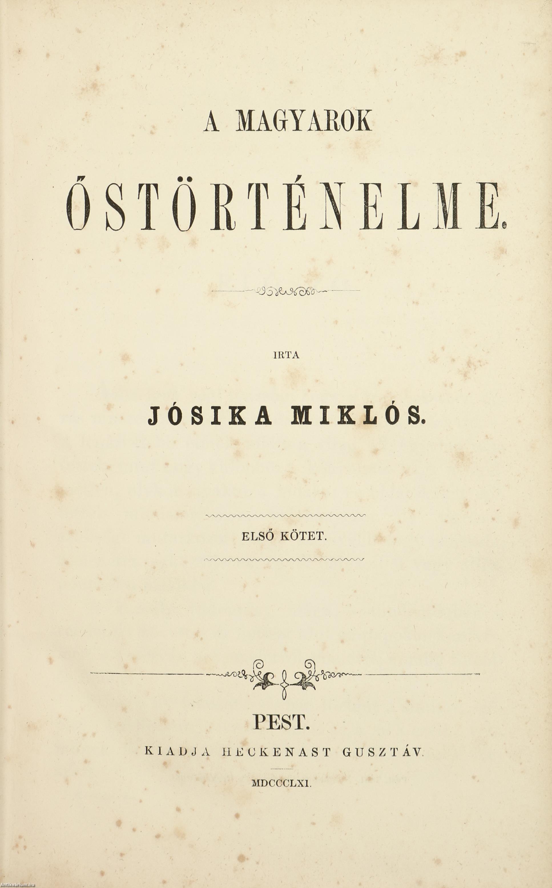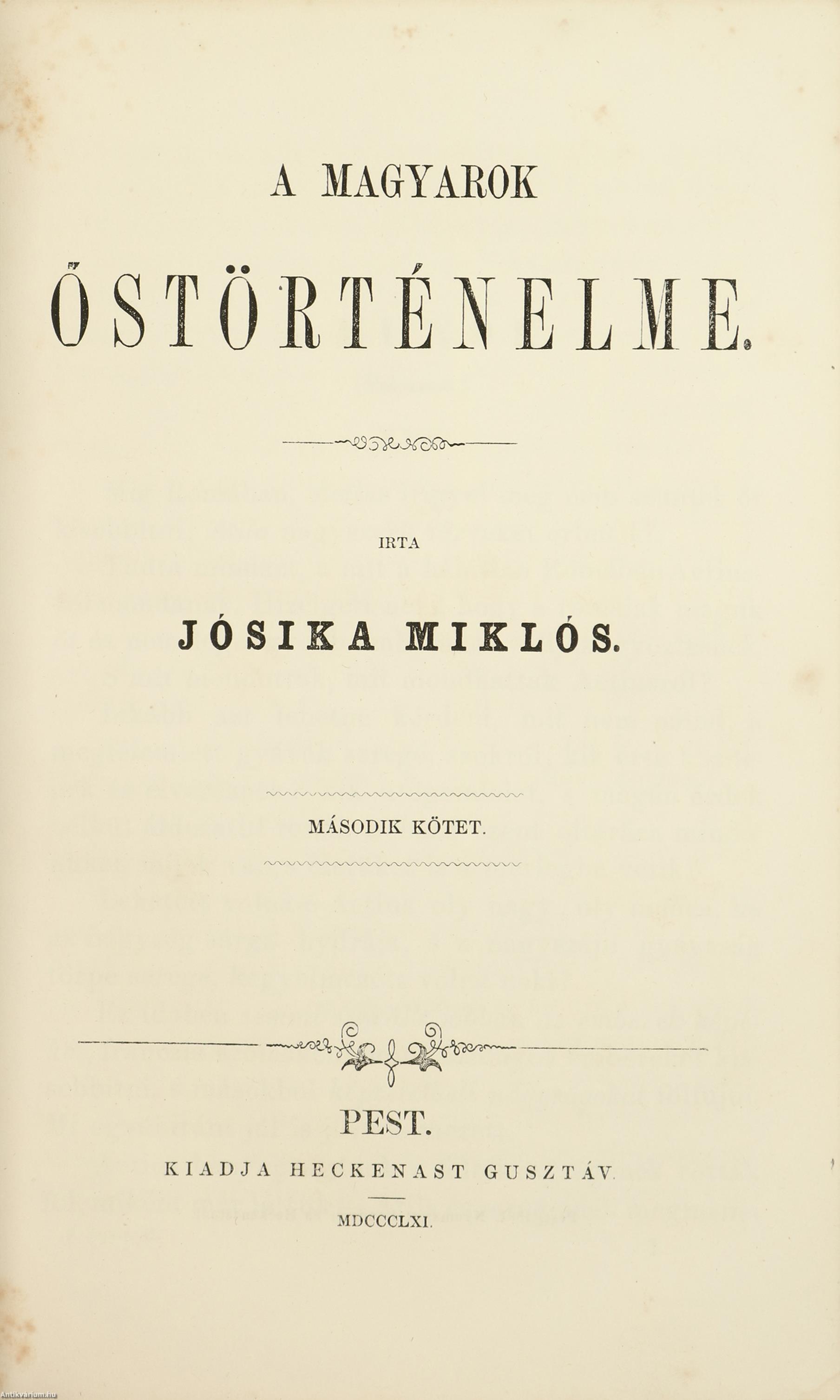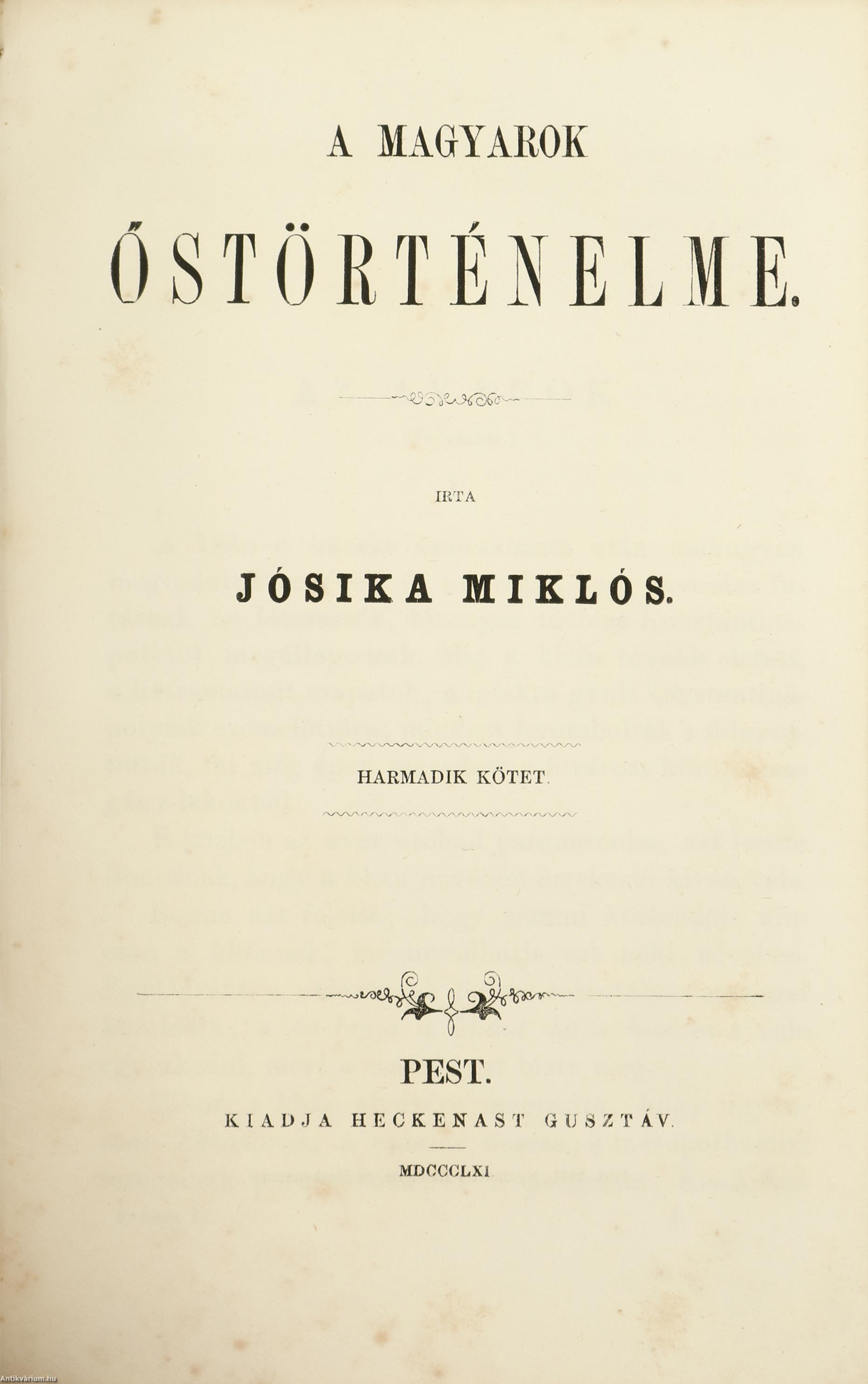 Első kiadás. A magyarok őstörténelme I-III. (Három kötet egy könyvben.) Írta: Jósika Miklós.