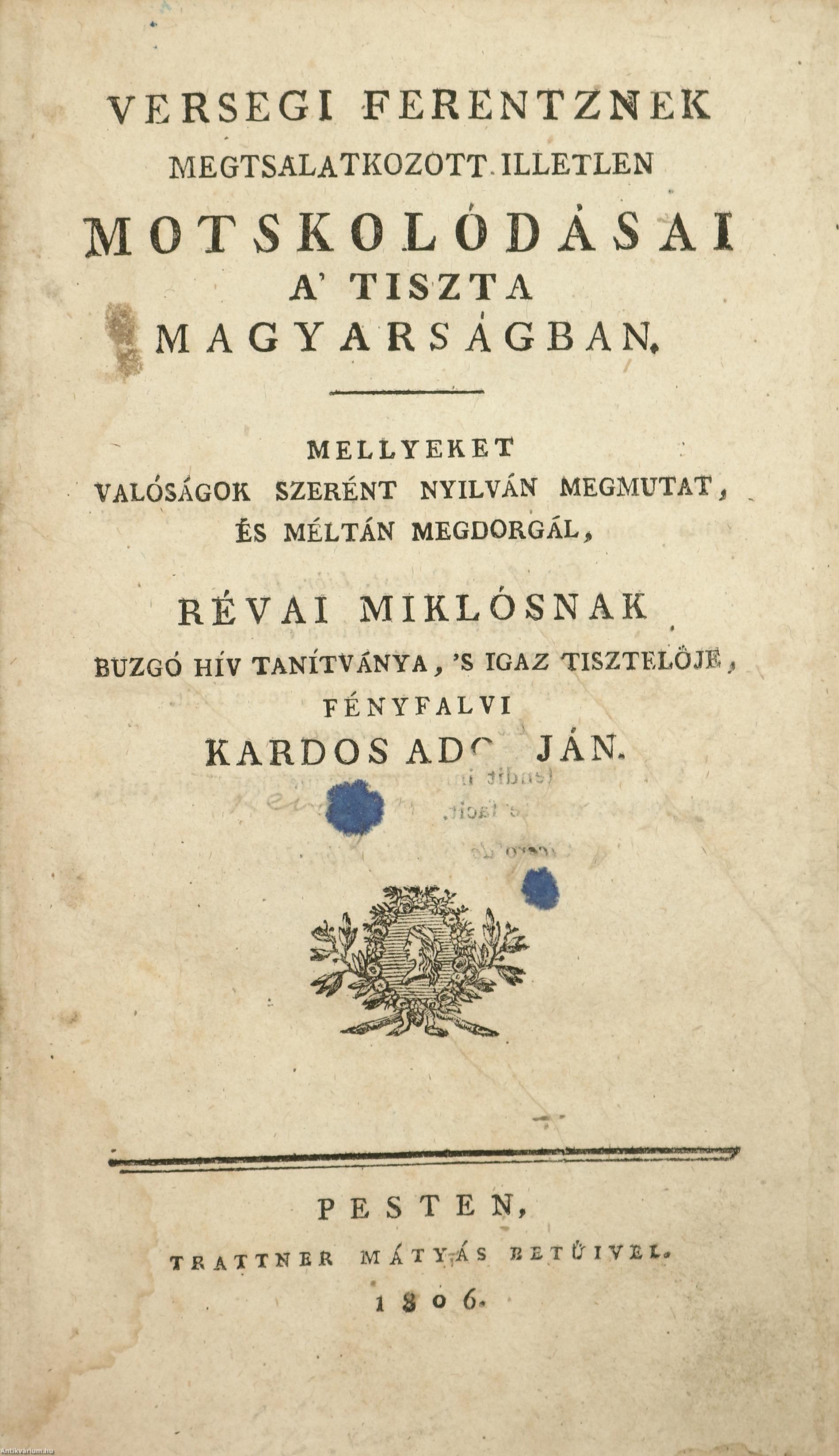 1.) Versegi Ferentznek megtsalatkozott illetlen motskolódásai a' tiszta magyarságban. Mellyeket valóságok szerént nyilván megmutat, és méltán megdorgál, Révai Miklósnak buzgó hív tanítványa, 's igaz tisztelője, fényfalvi Kardos Adorján [Révai Miklós].