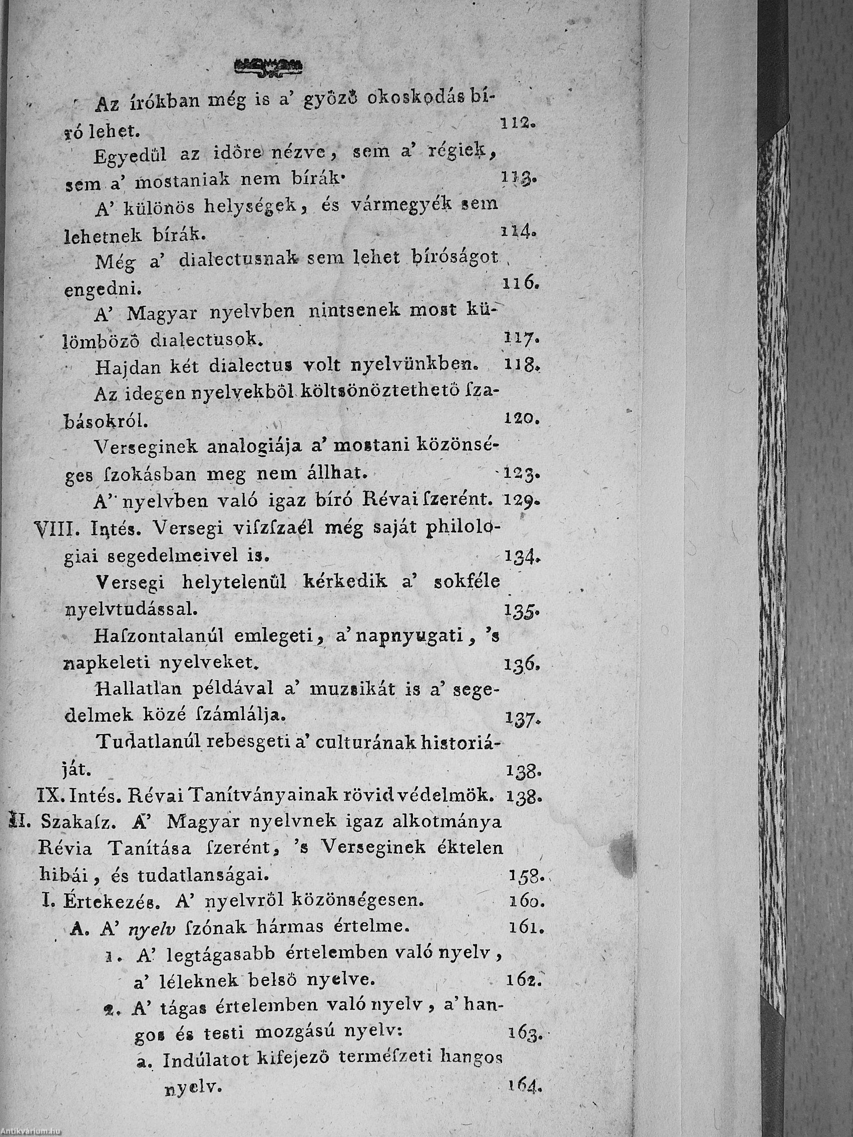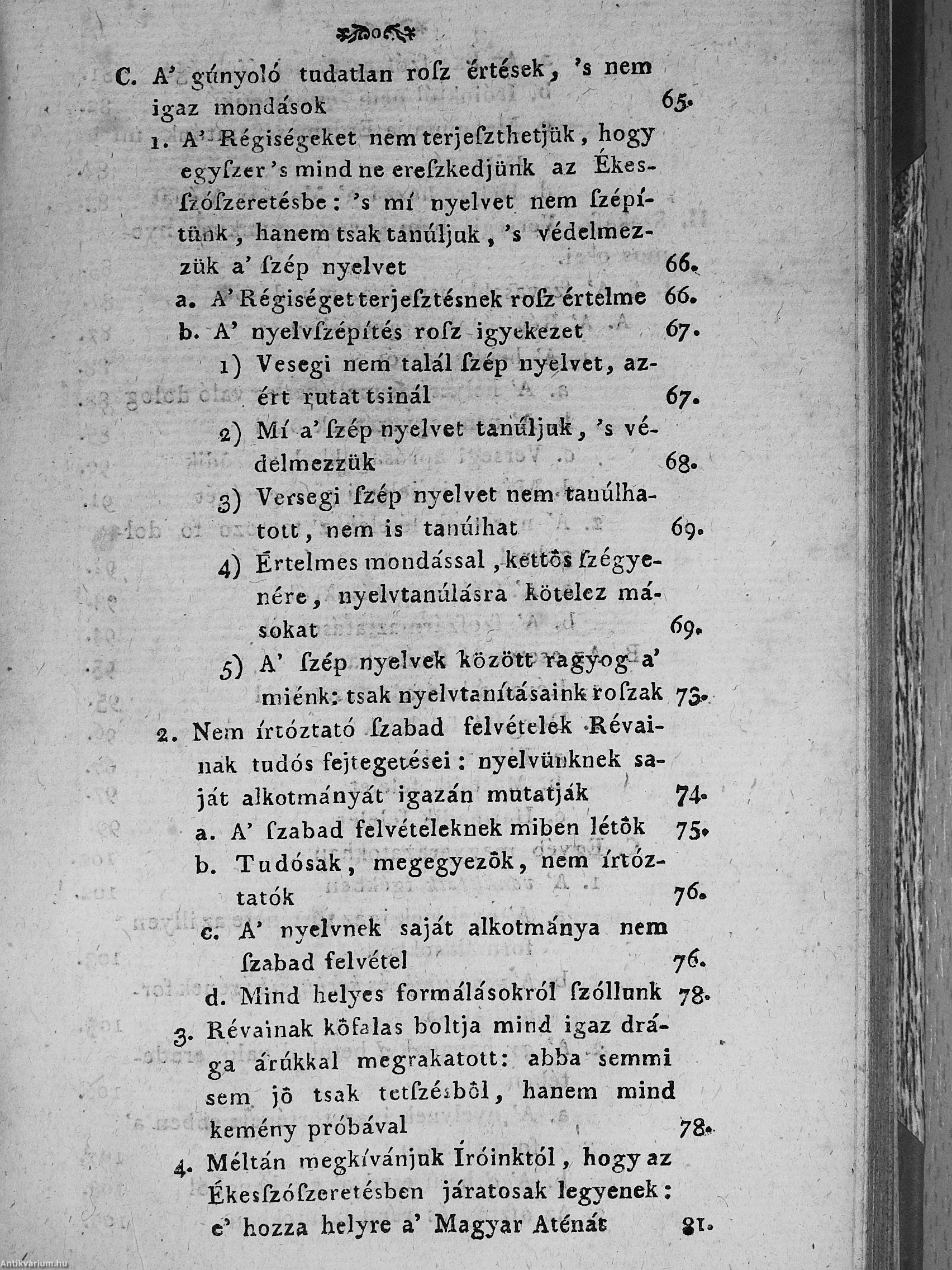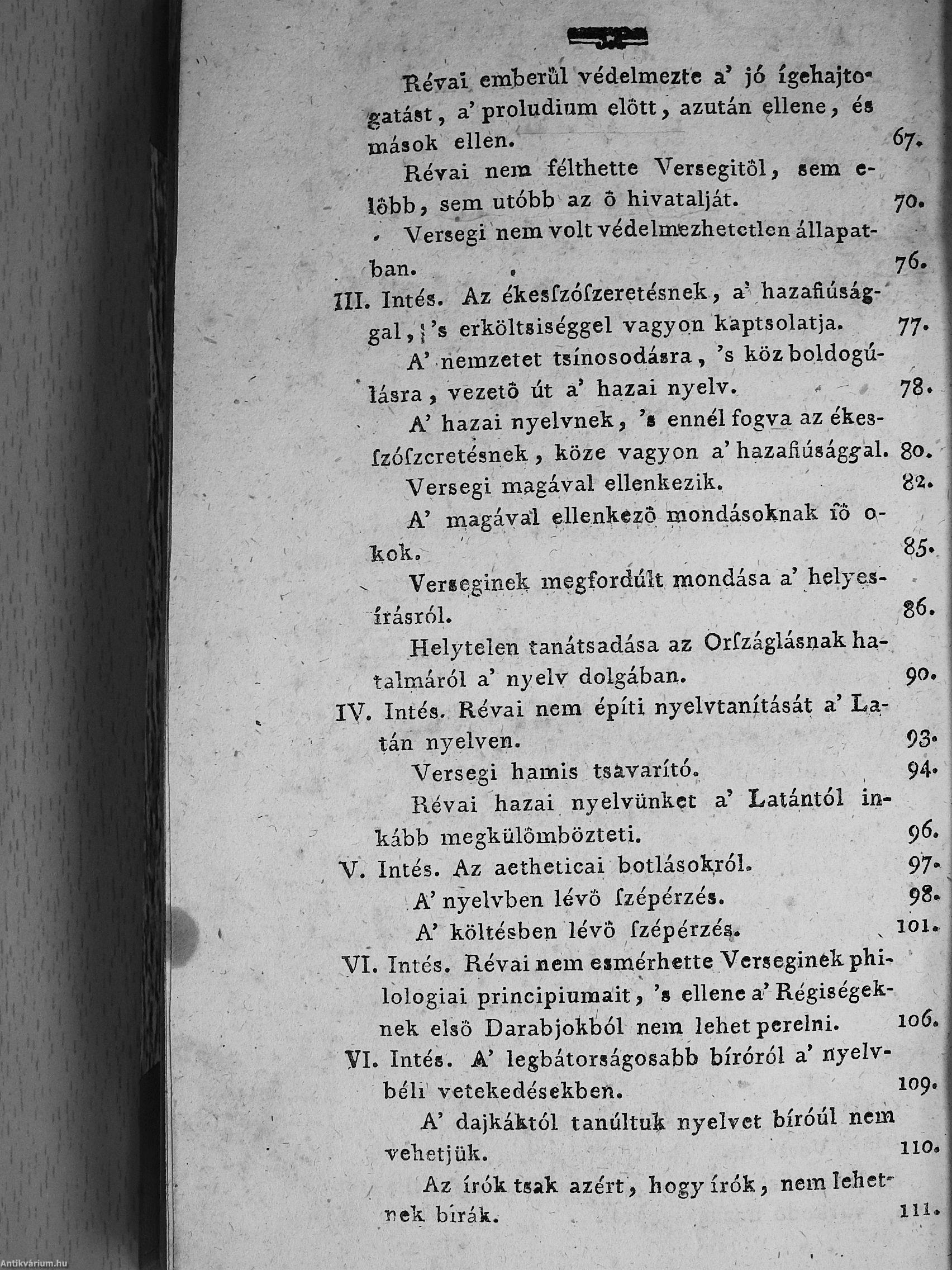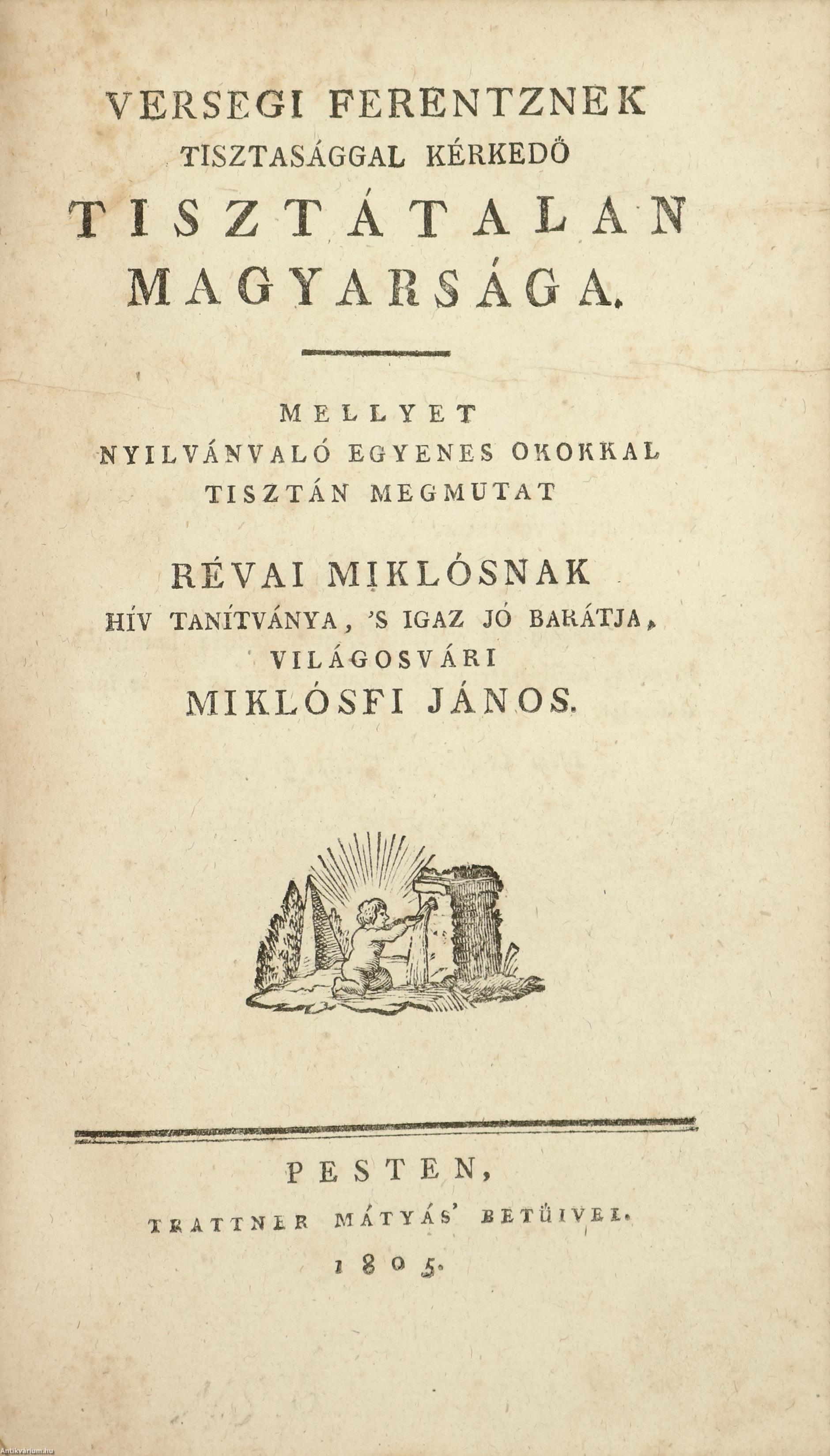 2.) Versegi Ferentznek tisztasággal kérkedő tisztátalan magyarsága. Mellyet nyilvánvaló egyenes okokkal tisztán megmutat Révai Miklósnak hív tanítványa, 's igaz jó barátja, világosvári Miklósfi János [Révai Miklós].