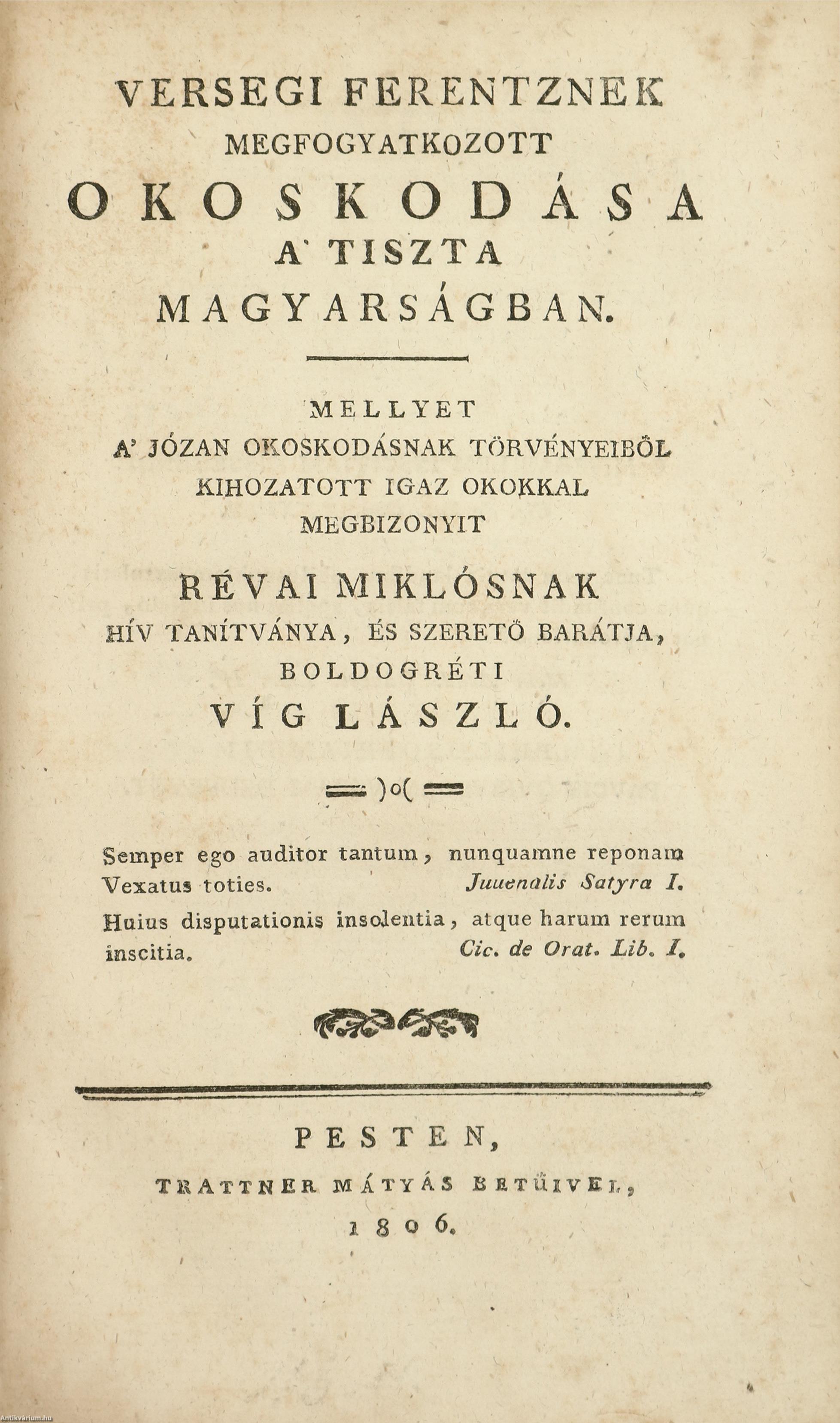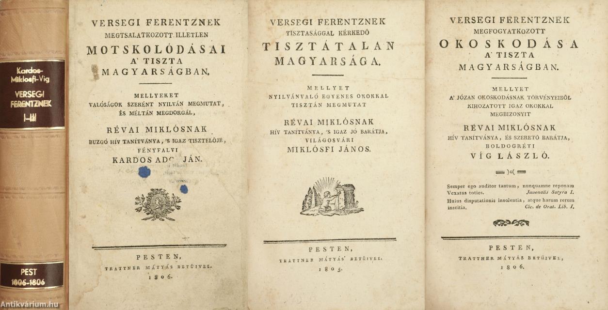 3.) Versegi Ferentznek megfogyatkozott okoskodása a' tiszta magyarságban. Mellyet a' józan okoskodásnak törvényeiből kihozatott igaz okokkal megbizonyit Révai Miklósnak hív tanítványa, és szerető barátja, boldogréti Víg László [Horvát István].