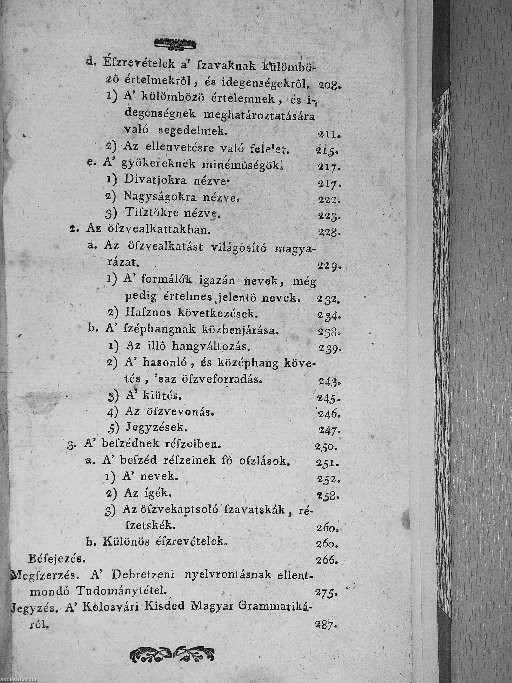 A kötet tartalmazza a "Megszerzés. A' debretzeni nyelvrontásnak ellent mondó tudomány tétel", valamint a "Jegyzés a' kolosvári kisded magyar grammaticáról" című kiegészítéseket is.