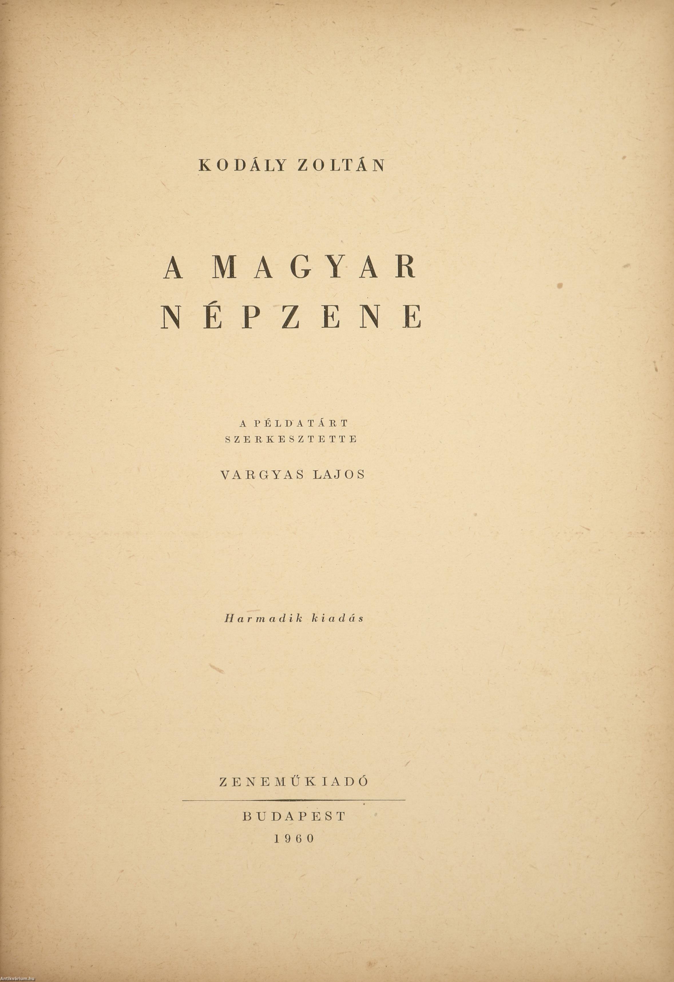 A magyar népzene. Írta: Kodály Zoltán. A példatárat szerkesztette: Vargyas Lajos. Harmadik kiadás. 6 fekete-fehér képtáblával, számos szöveg közti kottával, kötetvégi dallam- és szövegmutatóval, valamint tartalomjegyzékkel. Nyomtatta a Révai Nyomda, Budapesten. A kötethez tartozik egy különálló, tűzött függelék is 7 oldal terjedelemben ("Függelék. Kiegészítések és változtatások Kodály-Vargyas: A magyar népzene c. művéhez").