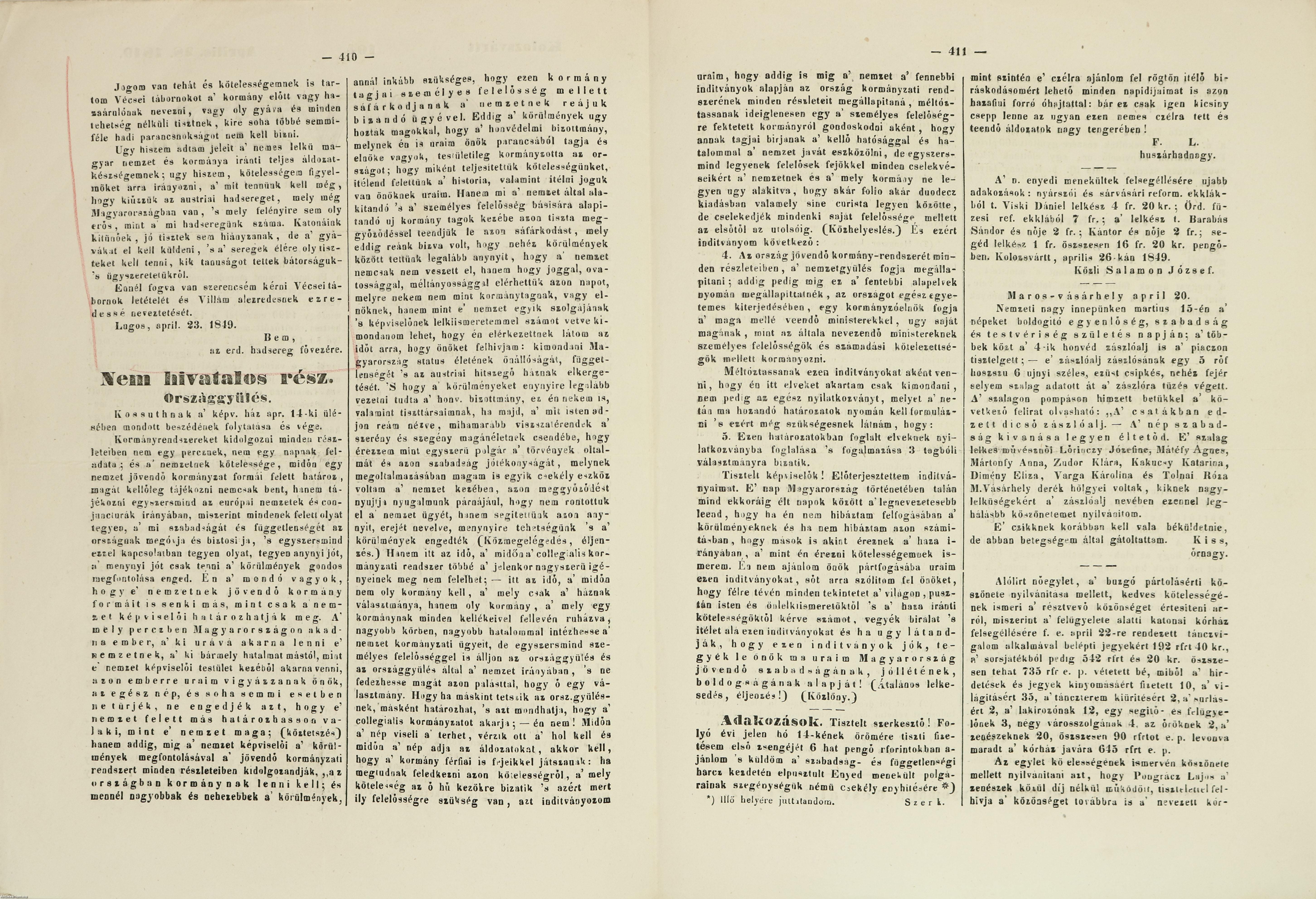 Hiánytalan, jó állapotban megőrzött időszaki kiadvány, középen hajtásnyomokkal, Bem levelének szövege mellett színes ceruzás kiemeléssel.