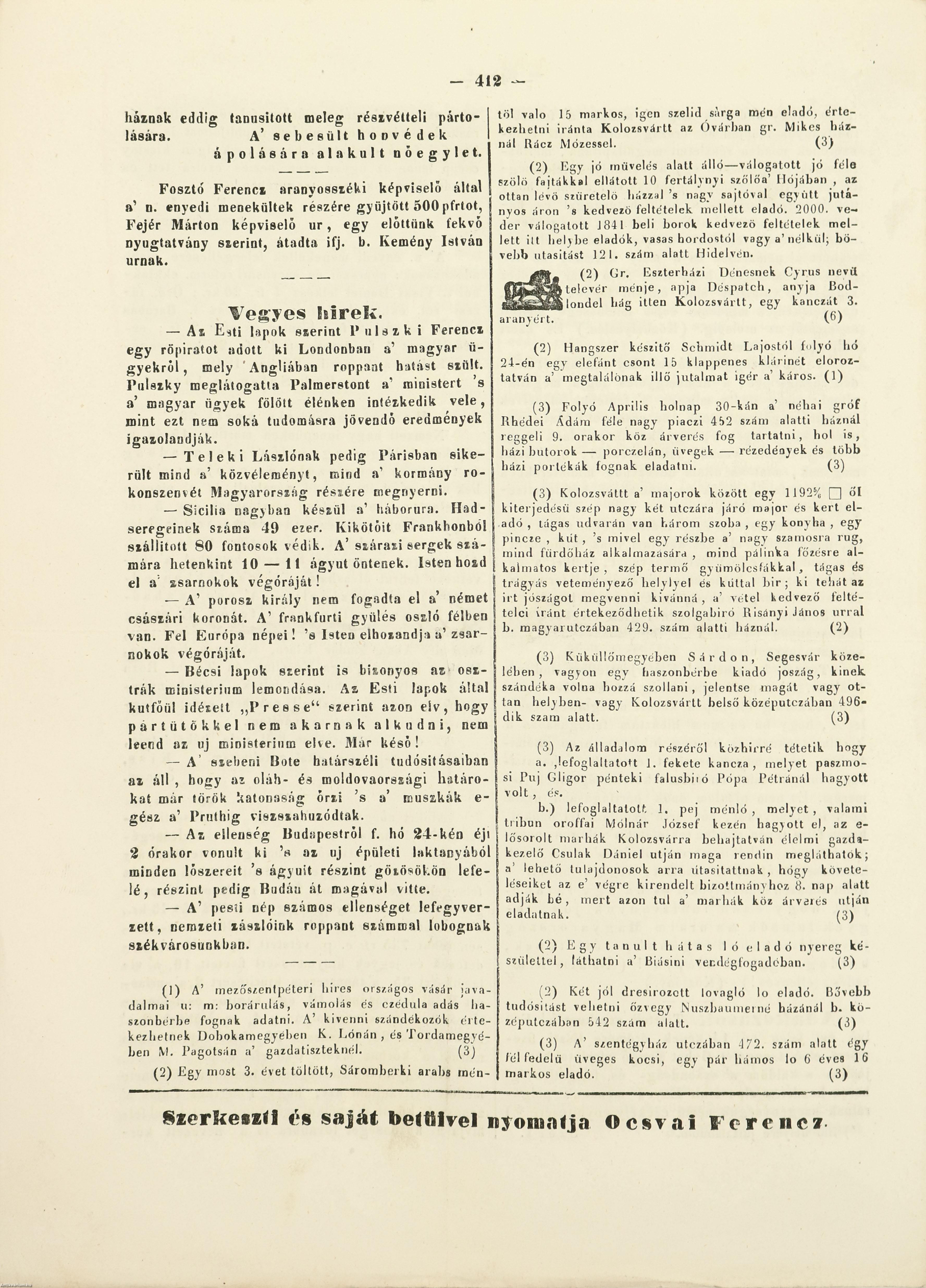 Kolozsvártt, 1849, Ocsvai Ferencz, [409]-412 p.