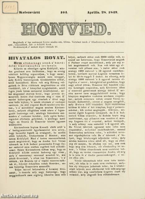 Honvéd. 1849. Aprilis 28. 104. szám. Szerkeszti és saját betűivel nyomatja: Ocsvai Ferencz.