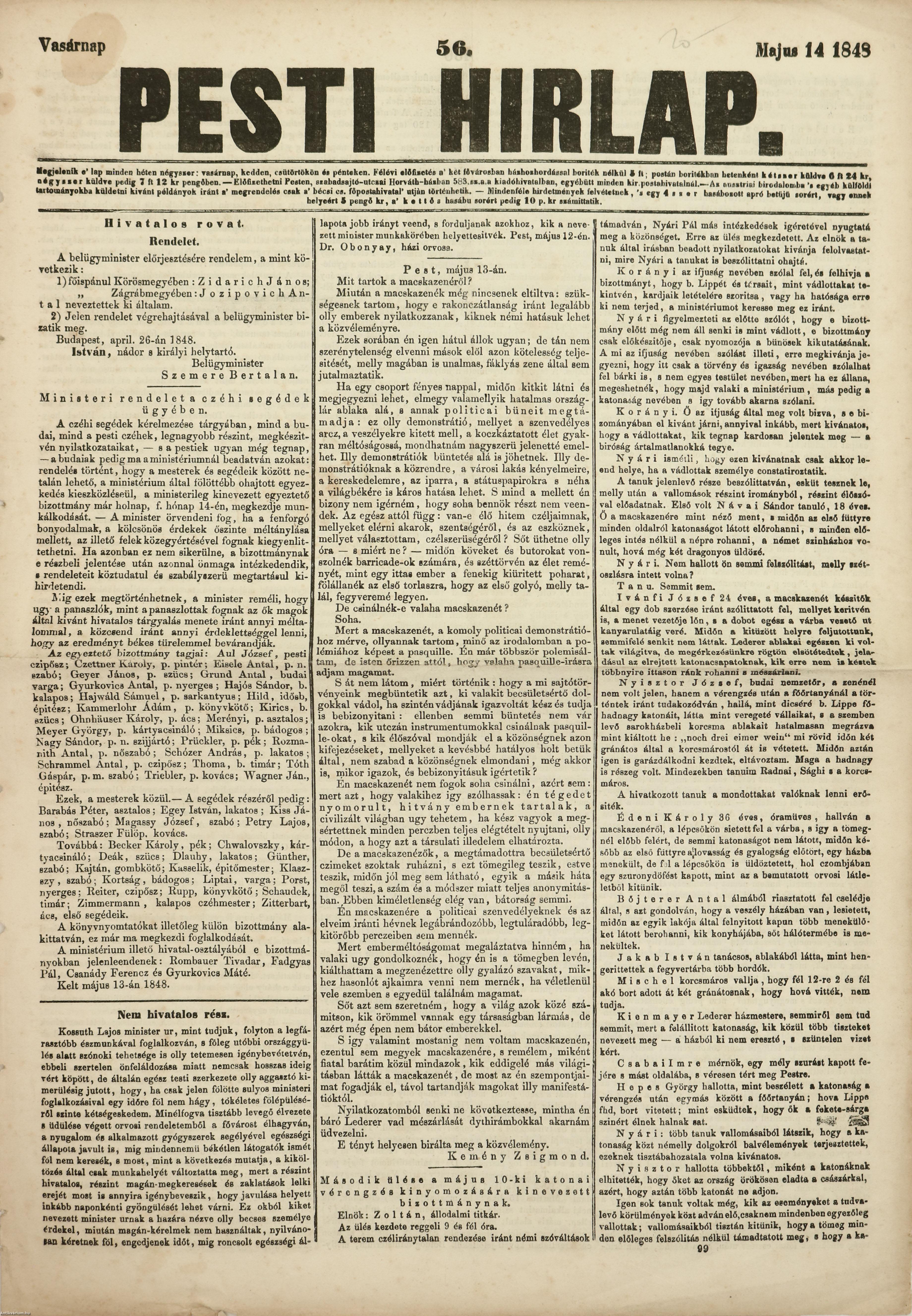 Pesti Hirlap. 1848. Majus 14. 56. szám. Szerkeszti: Csengery Antal.
