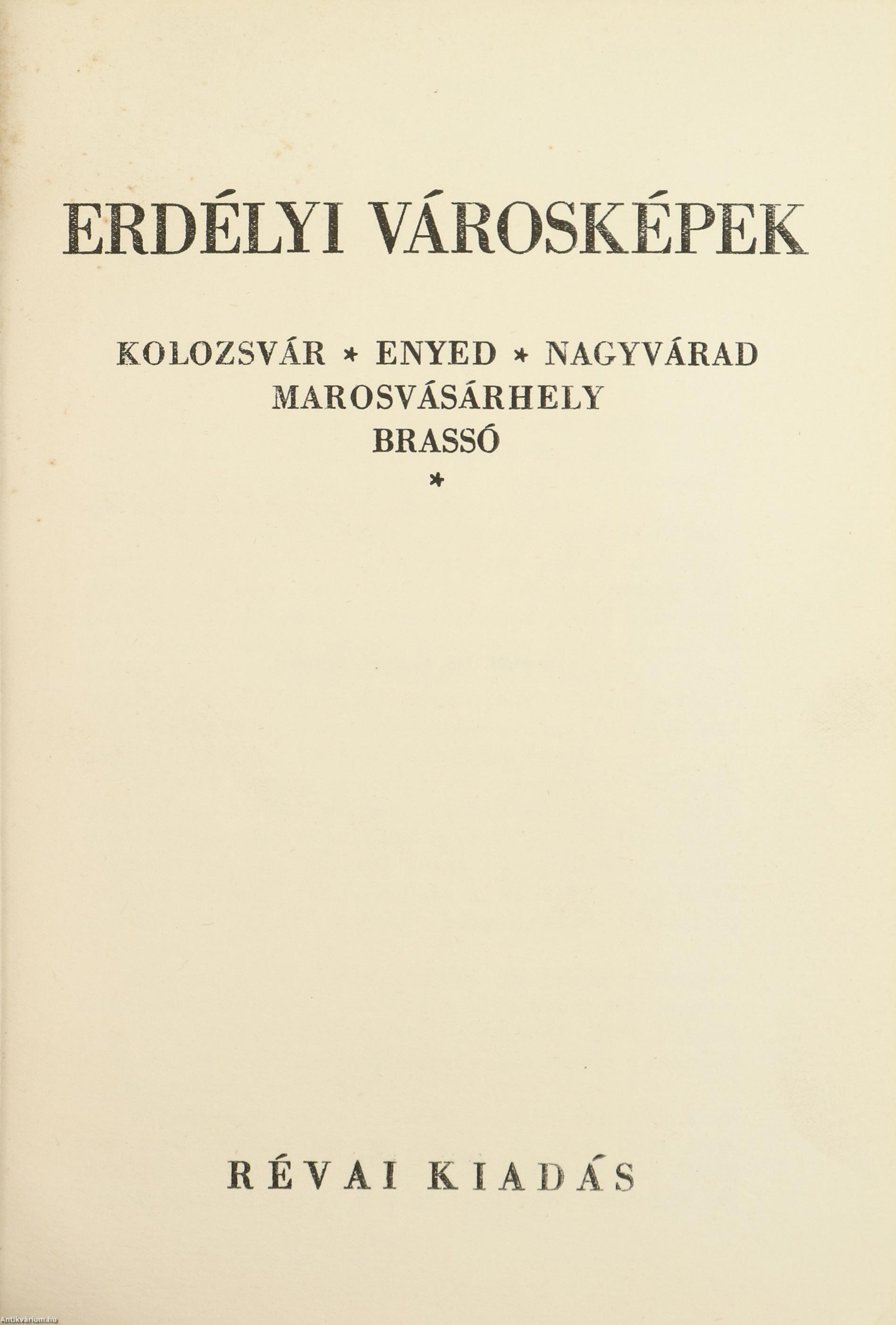 Erdélyi városképek. Kolozsvár, Enyed, Nagyvárad, Marosvásárhely, Brassó. Írták: Maksay Albert, Tabéry Géza, Berde Mária, Molter Károly és Szemlér Ferenc.