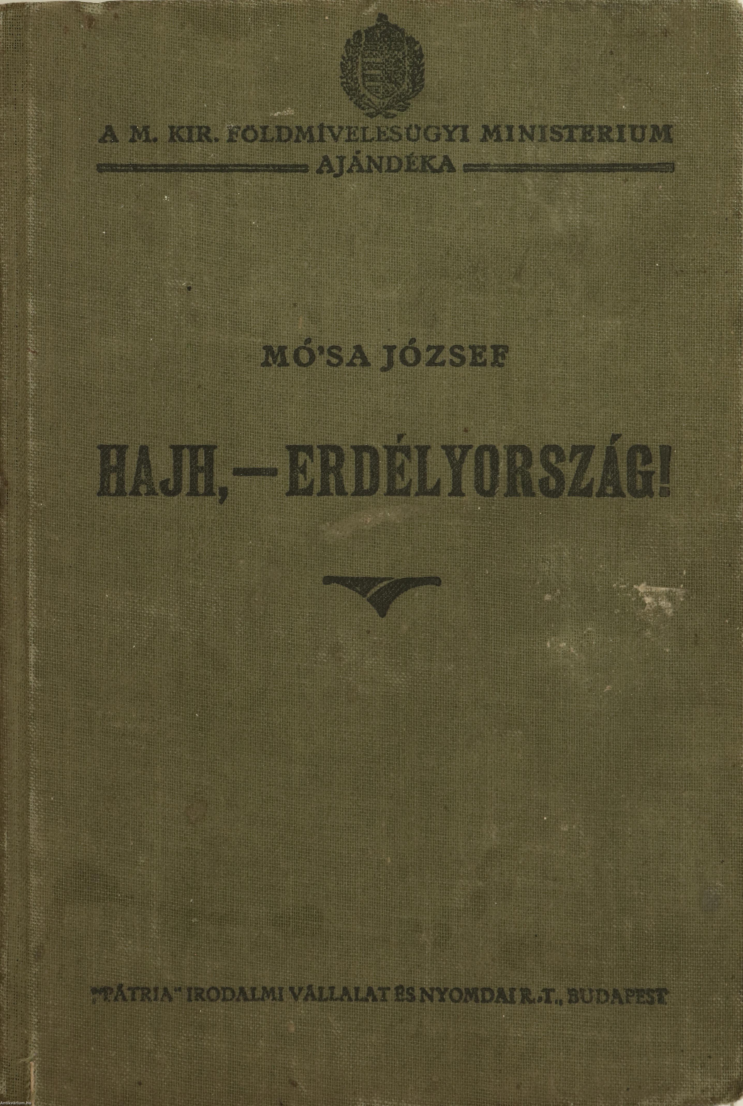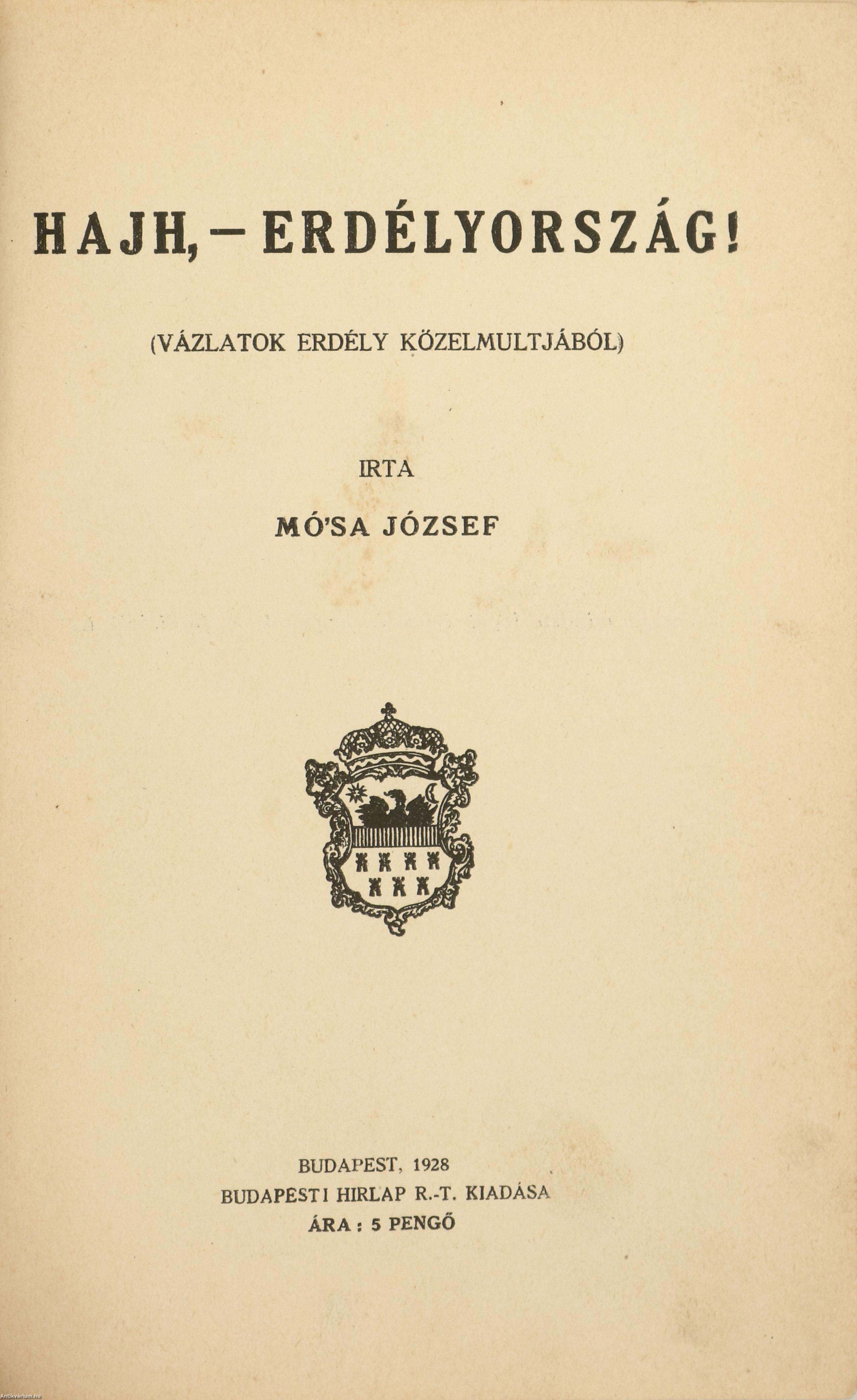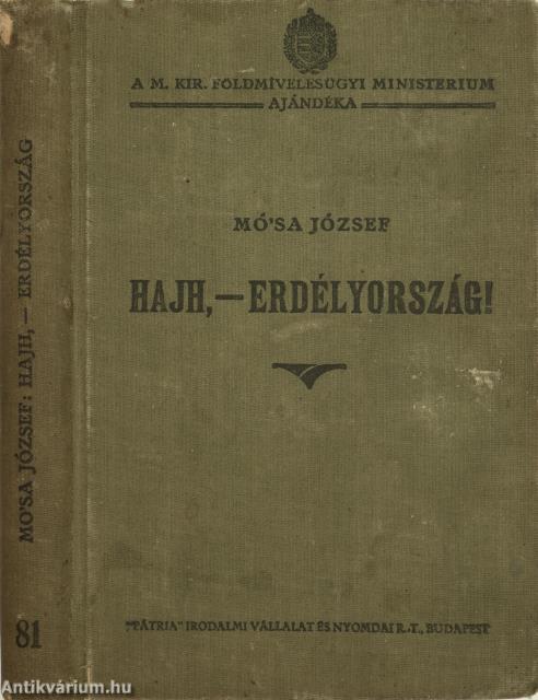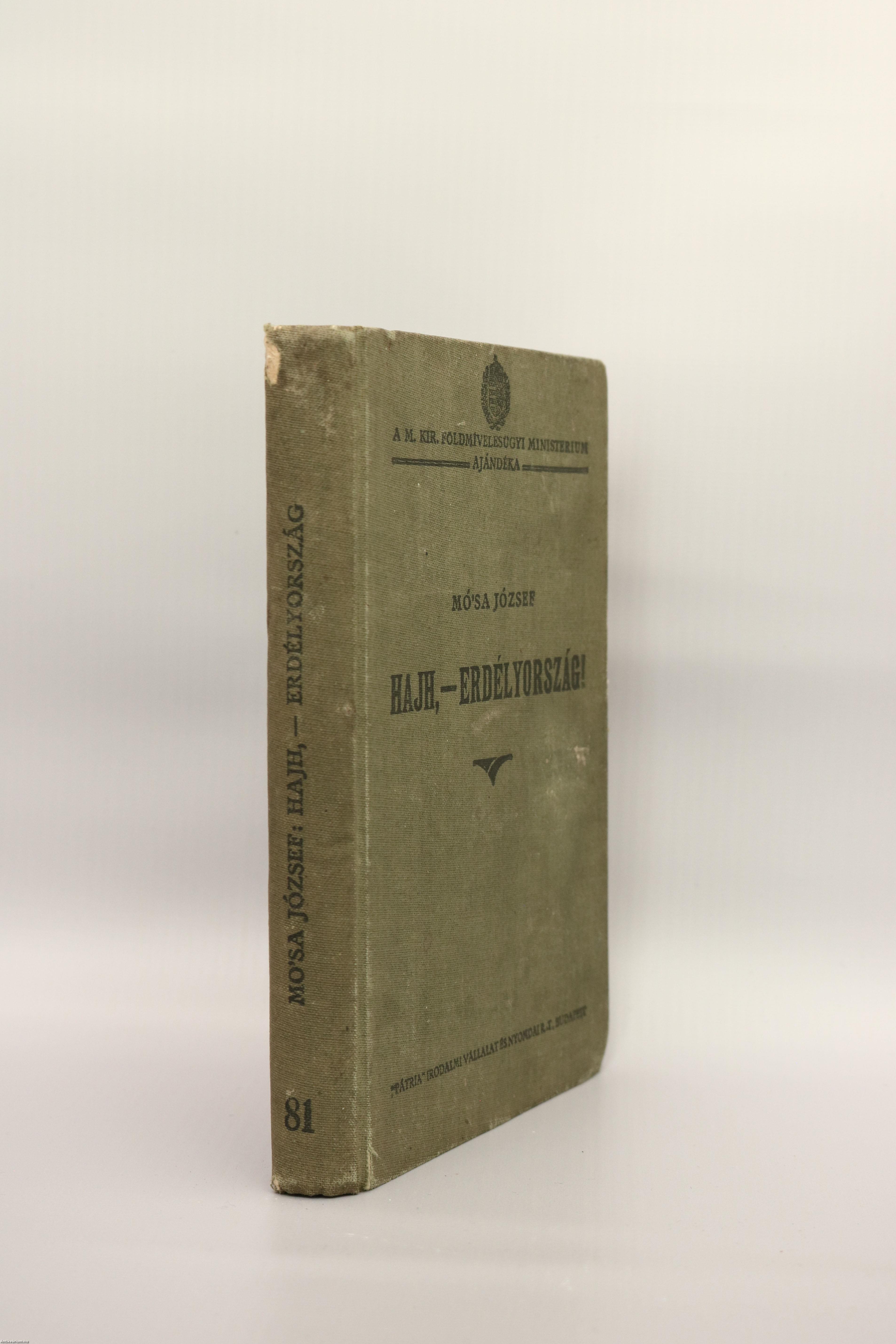 Első kiadás. A M. Kir. Földmívelésügyi Ministerium ajándéka. No.: 81. sz. Hajh, - Erdélyország! Vázlatok Erdély közelmúltjából. Írta: Mó'sa József. Herczeg Ferenc előszavával és kötetvégi részletes tartalomjegyzékkel kiegészített kötet. Az előzéklapon tulajdonosi bélyegzés látható. Nyomtatta a Budapesti Hírlap Nyomdája, Budapesten. A borítón a "Pátria" Irodalmi Vállalat és Nyomda R. T. felirat szerepel. Kiadói egészvászon kötésben lévő példány, feliratozott címfedéllel és könyvgerinccel, hátlapon ragasztott címke maradványával, hiánytalan állapotban. Mó'sa könyvében "...rajongó szeretettel foglalja össze hazája életének legvonzóbb vonatkozásait. Belevilágít az erdélyi mágnásoknak példás közszellemtől és kötelességérzettől irányított osztályába, megrajzolja hazája vonzó és a mienkénél sokkal kevesebb szakadékot mutató társadalmi életét, foglalkozik egynéhány nagy erdélyi családnak történelmi jelentőségű és áldásos tevékenységével: a Rhédeyekkel, Wesselényiekkel, Bánffyakkal, Keményekkel, Bethlenekkel, Telekiekkel, Mikókkal. Sorra veszi Erdély kitűnő kulturális intézményeit, a múzeumokat, a zenei életet, az erdélyi papság nagyjelentőségű működését, a színi világot és nem feledkezik meg Erdély másik magyar népéről, a székelyekről sem..." - (Napkelet, 1928. október 15./6. évfolyam/20. szám).