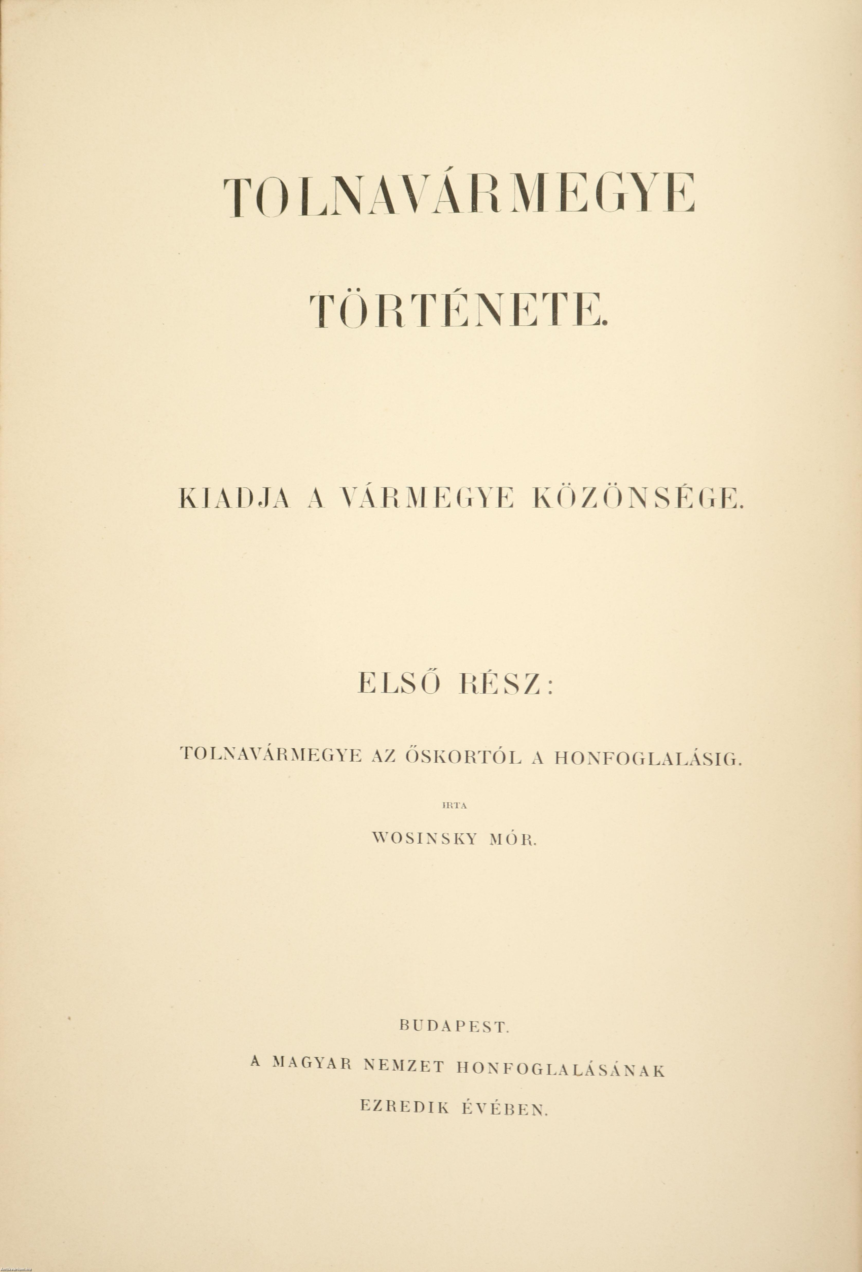 Első, unicus kiadás. Tolnavármegye története I. rész/1-2. kötet (egységes külön kötetekben) Írta: Wosinsky Mór.