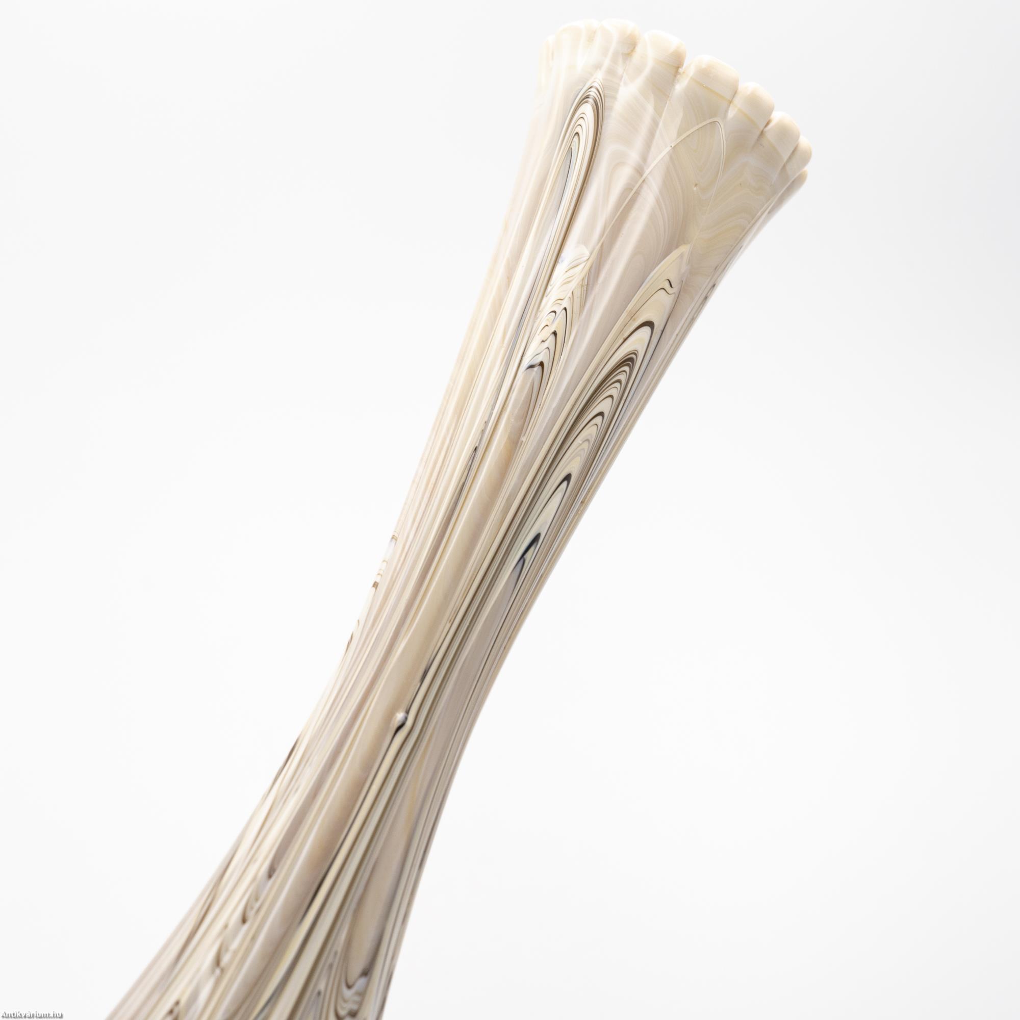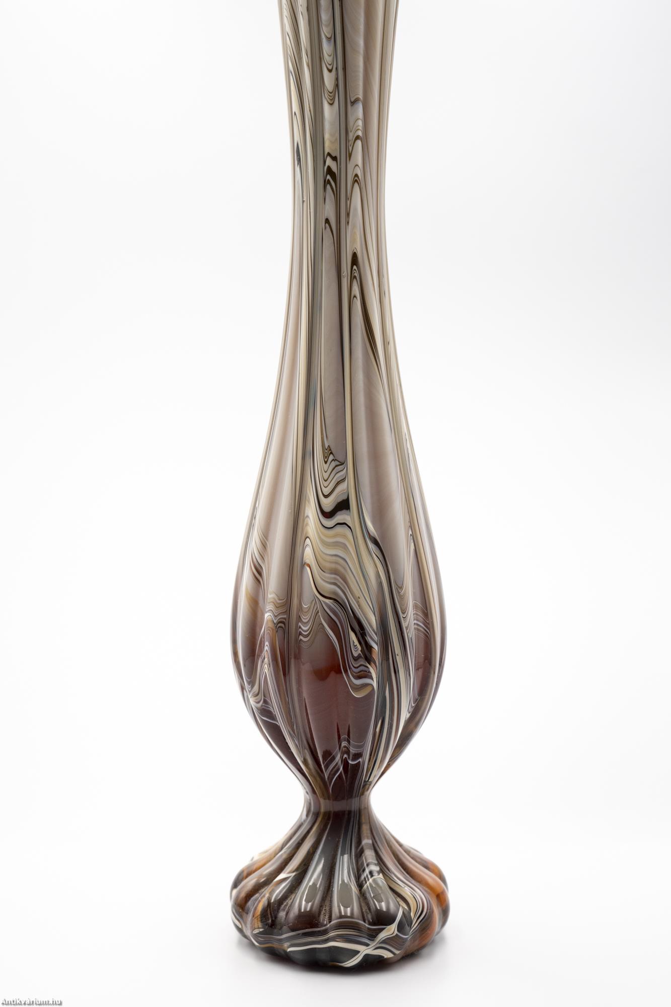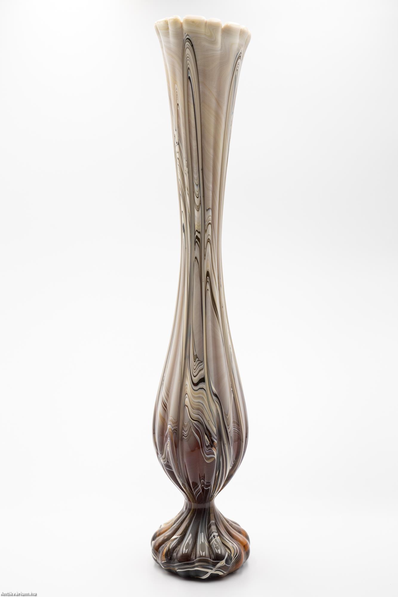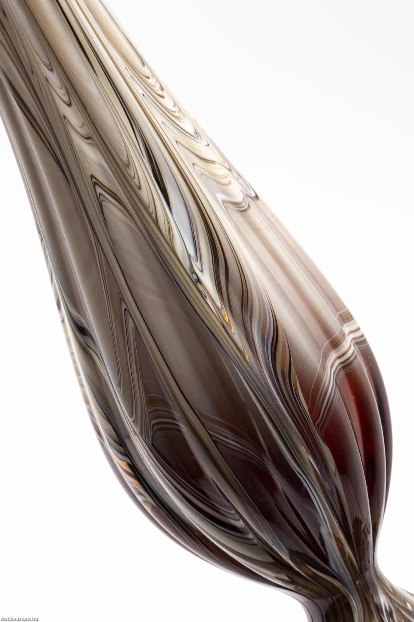 Hibátlan állapotú, fújt és kézzel formázott, nagy méretű modern - vintage Murano üveg váza. Készítésének ideje a 20. század közepe. Impozáns megjelenését különlegesen nagy méretének és extrém mintájának köszönheti. Az erősen nyújtott, gömbformára tagolt felületet hosszanti irányú, többszörösen bordázott, csíkozott dekor díszíti, amelynek színösszeállítása finom árnyalatokban jeleníti meg a bézs, a bordó és a barna tónusait. Talpa simára csiszolva. Jellegzetes századközépi forma és színvilág, rendkívül látványos igazi retro korhangulatot sugárzó művészi enteriőr darab.