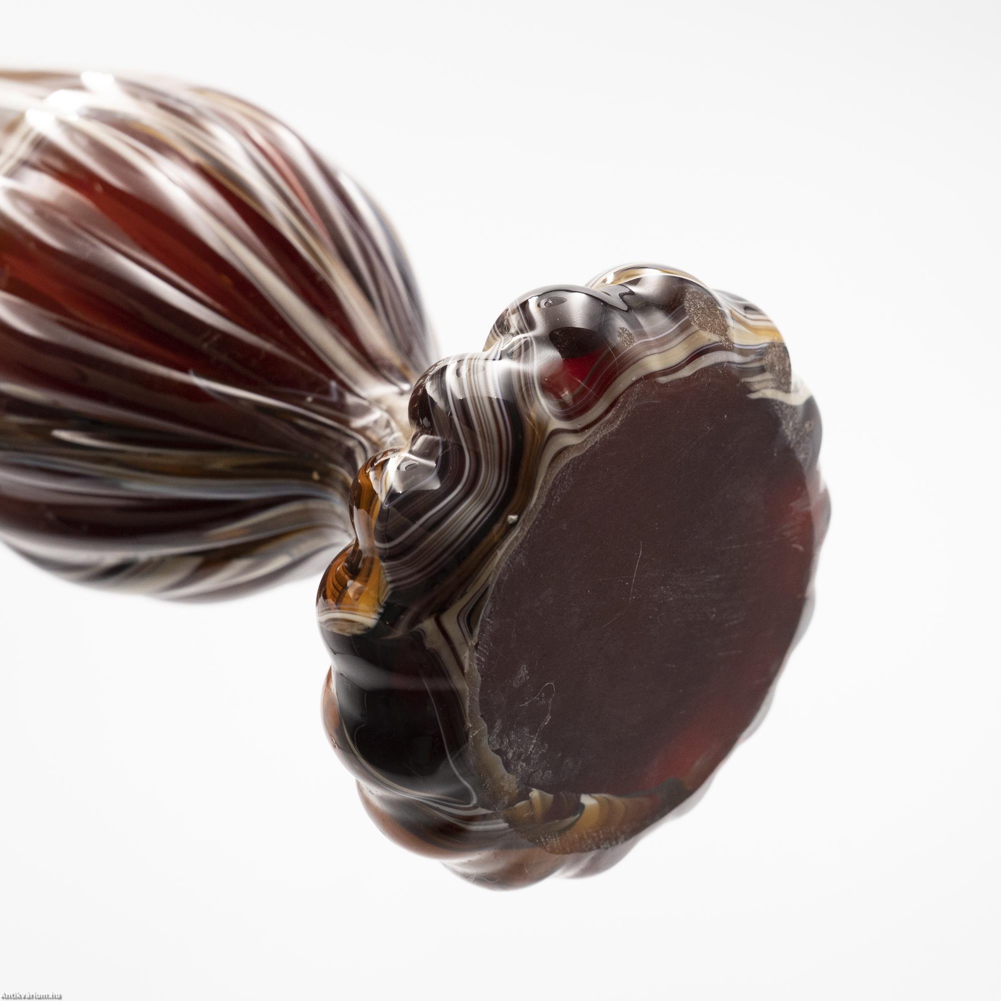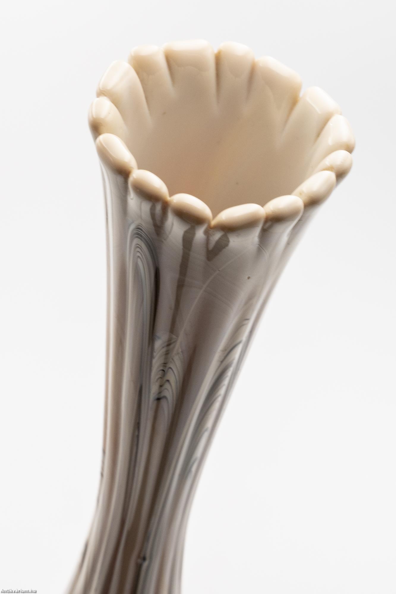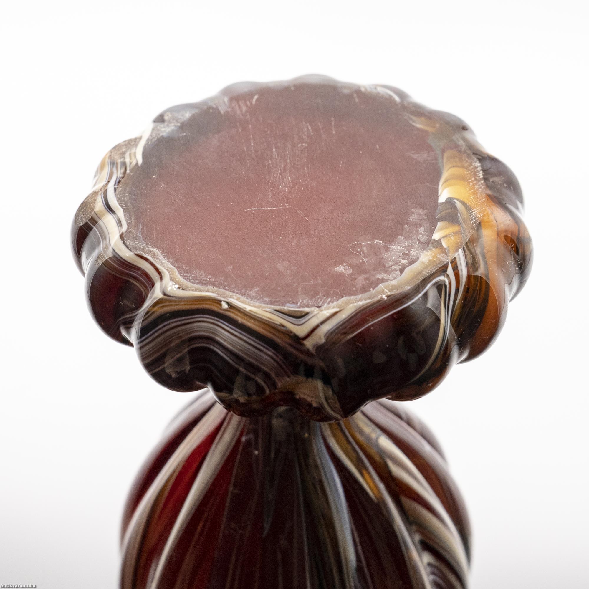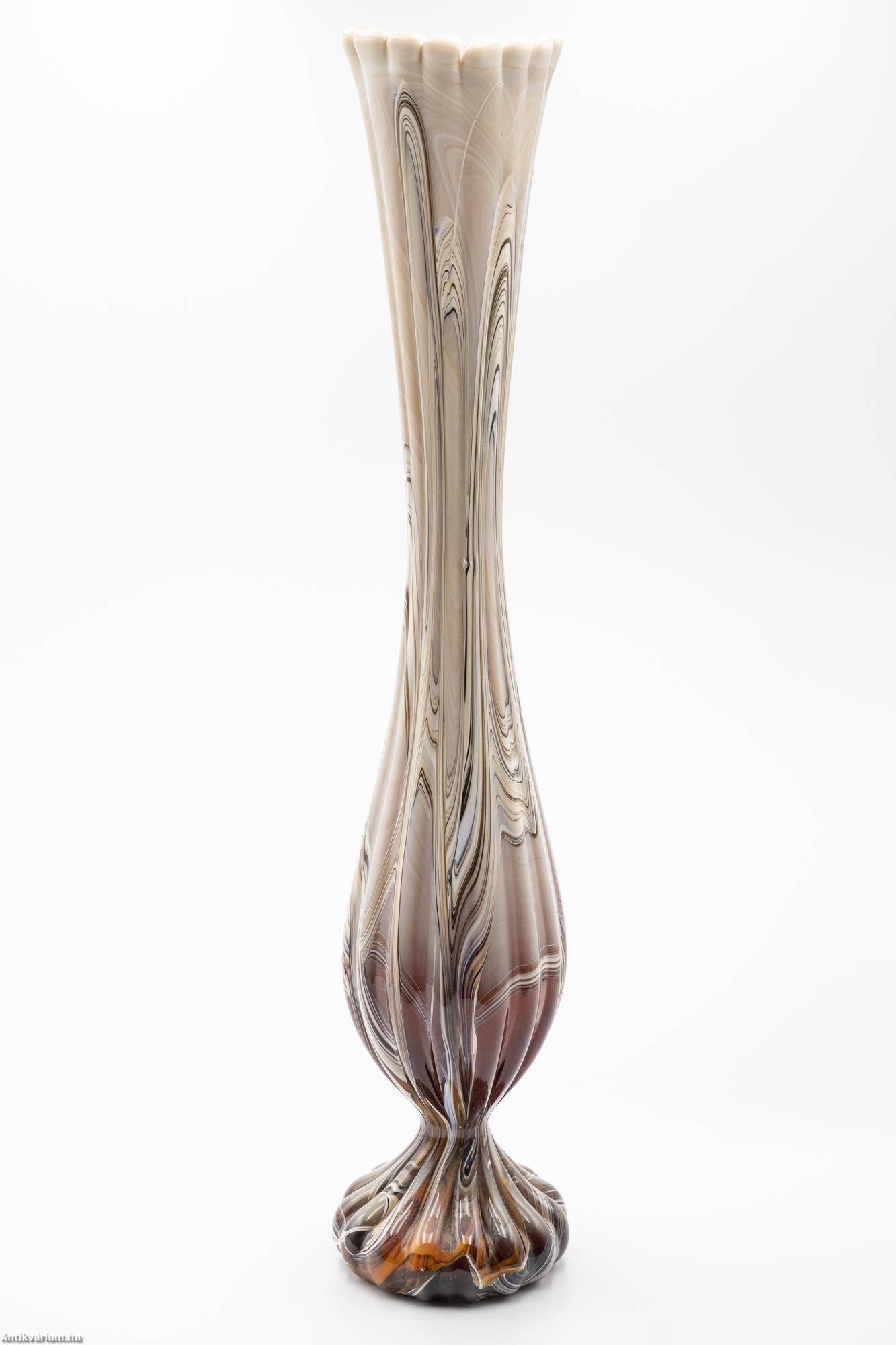 Hibátlan állapotú, fújt és kézzel formázott, nagy méretű modern - vintage Murano üveg váza. Készítésének ideje a 20. század közepe. Impozáns megjelenését különlegesen nagy méretének és extrém mintájának köszönheti. Az erősen nyújtott, gömbformára tagolt felületet hosszanti irányú, többszörösen bordázott, csíkozott dekor díszíti, amelynek színösszeállítása finom árnyalatokban jeleníti meg a bézs, a bordó és a barna tónusait. Talpa simára csiszolva. Jellegzetes századközépi forma és színvilág, rendkívül látványos igazi retro korhangulatot sugárzó művészi enteriőr darab.