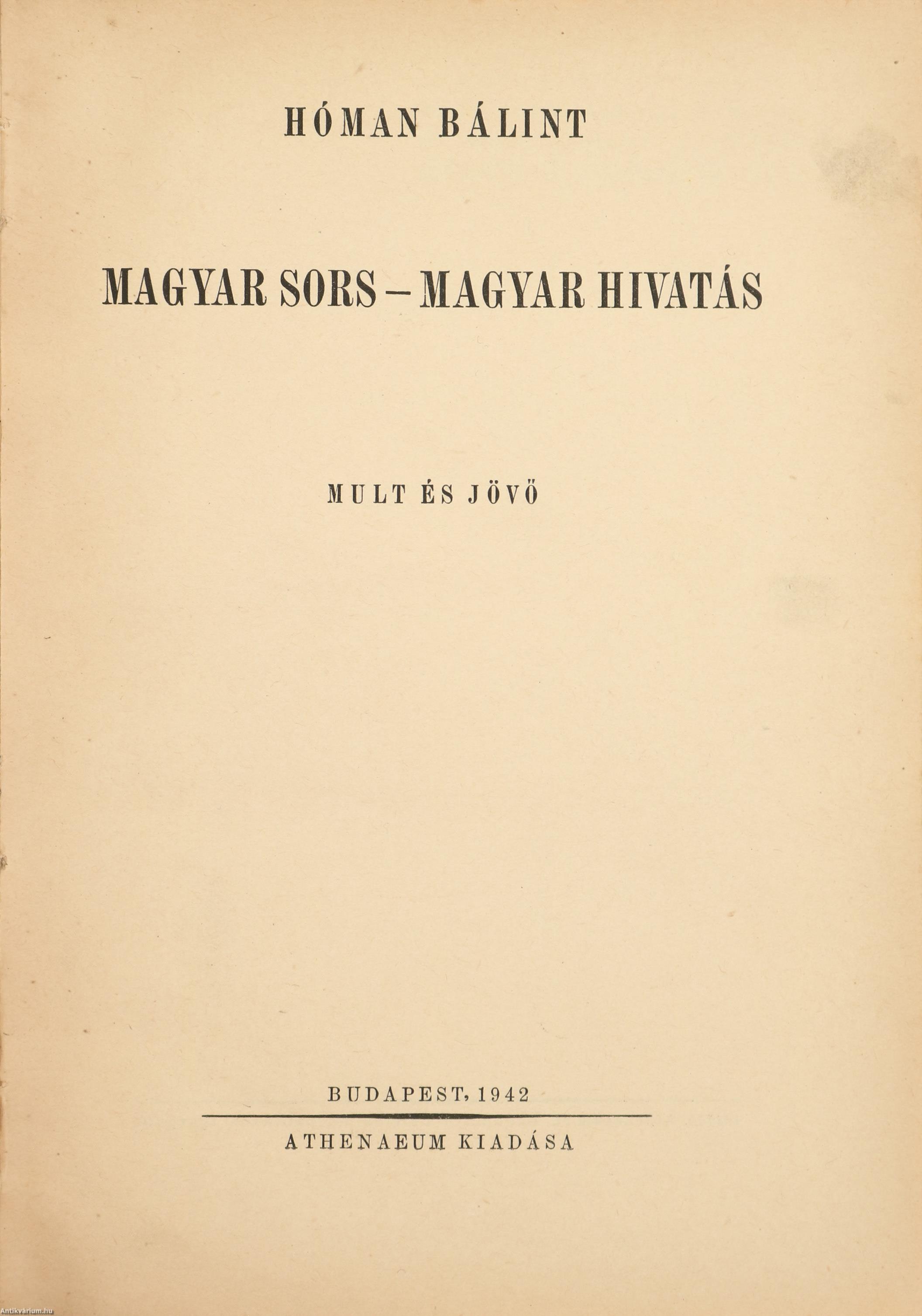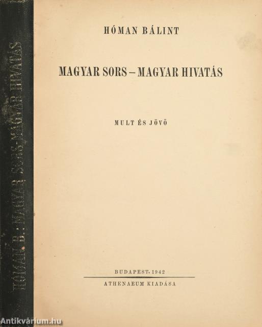Első kiadás. Magyar sors - magyar hivatás. Mult és jövő. Írta: Hóman Bálint. Tasnádi Nagy András előszavával és függelékkel kiegészített, tartalomjegyzékkel ellátott kötet. A címfedél belső oldalán a "Magyar Királyi Vallás- és Közoktatásügyi Miniszter ajándéka" feliratozású, illusztrált címke, az előzéklapon jelzettel ellátott tulajdonosi bélyegzés látható. Nyomtatta az Athenaeum Rt., Budapesten. Könyvkötői félvászon kötésben lévő példány feliratozatlan, mintás címfedéllel és hátlappal, aranyozott feliratozású könyvgerinccel, hiánytalan állapotban. A kötet szerzője, Hóman Bálint (Budapest, 1885. december 29. – Vác, 1951. június 2.) politikus, történész, egyetemi tanár, az MTA tagja. 1933 és 1945 között a tudományos akadémia igazgatósági tagja, 1932-1938 és 1939-1942 között Magyarország vallás- és közoktatásügyi minisztere, 1933 és 1944 között a Magyar Történelmi Társulat elnöke volt. Hóman Bálint a két világháború közötti korszak egyik legvitatottabb személyisége. Részt vett a zsidótörvények parlamenti előkészítésében és annak megszavazásában, és Szálasi hatalomra kerülését követően is a parlament tagja maradt. 1946-ban a népbíróság háborús bűnösként elítélte. A büntetést a Váci Fegyházban töltötte.