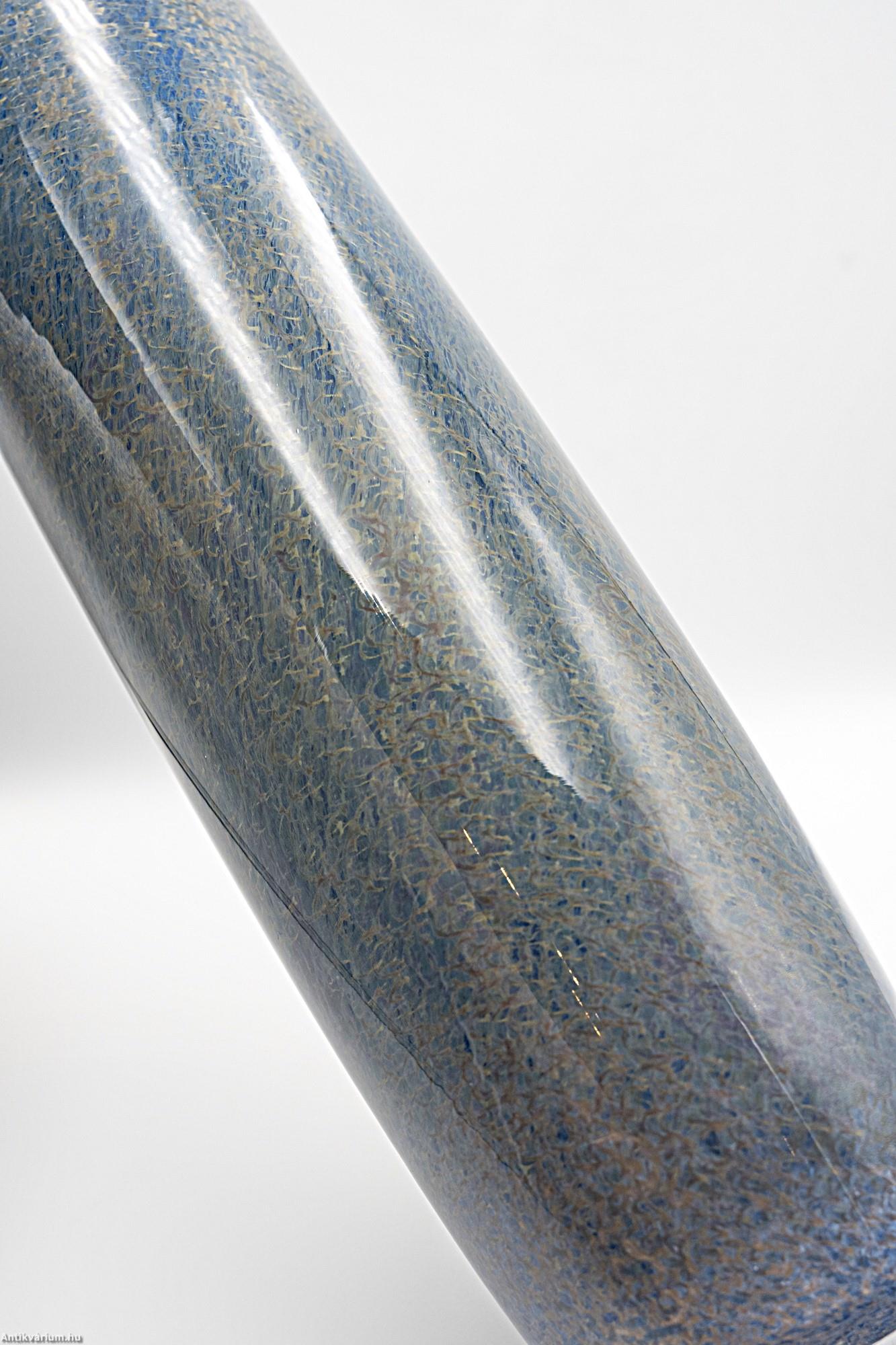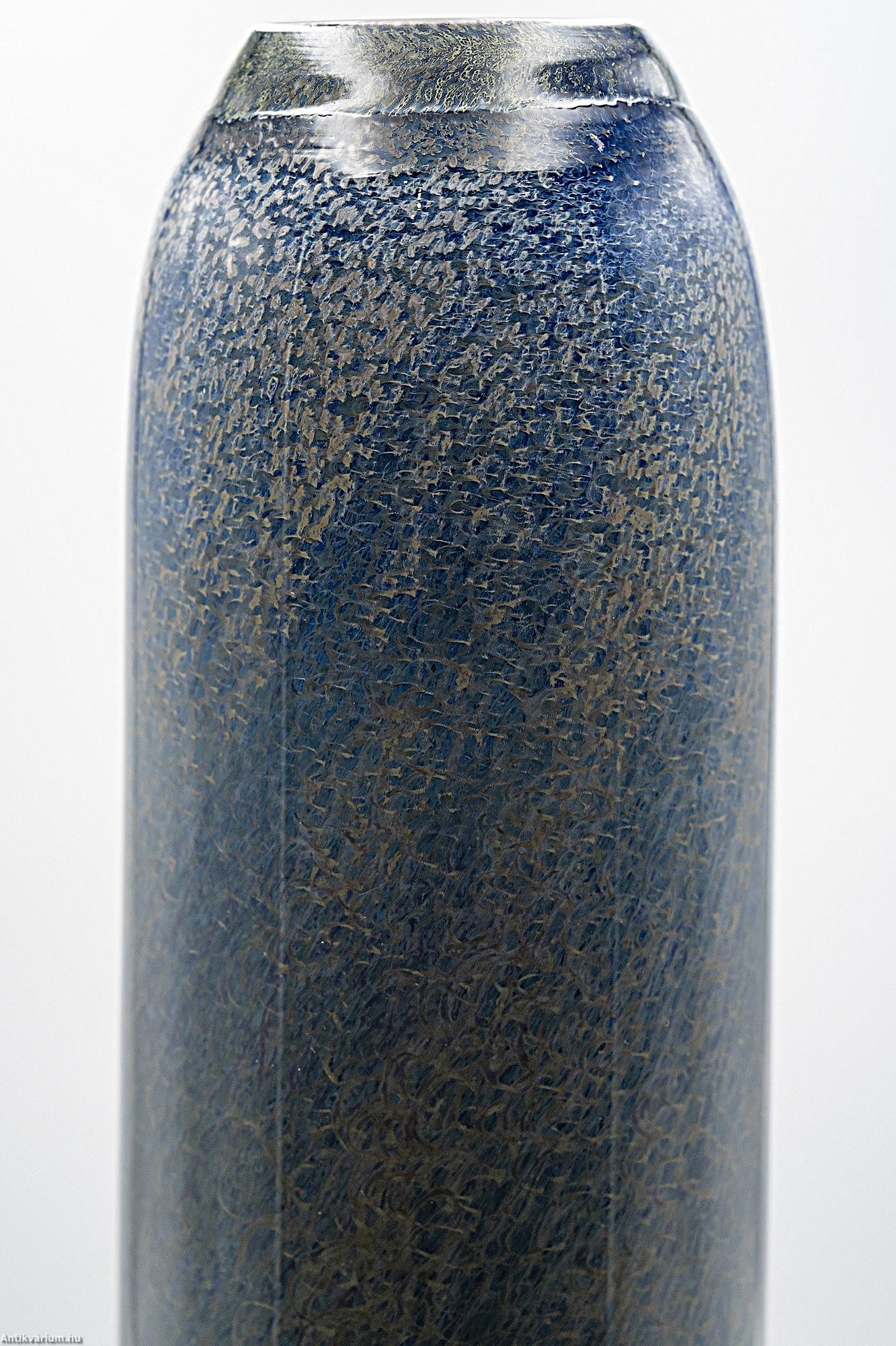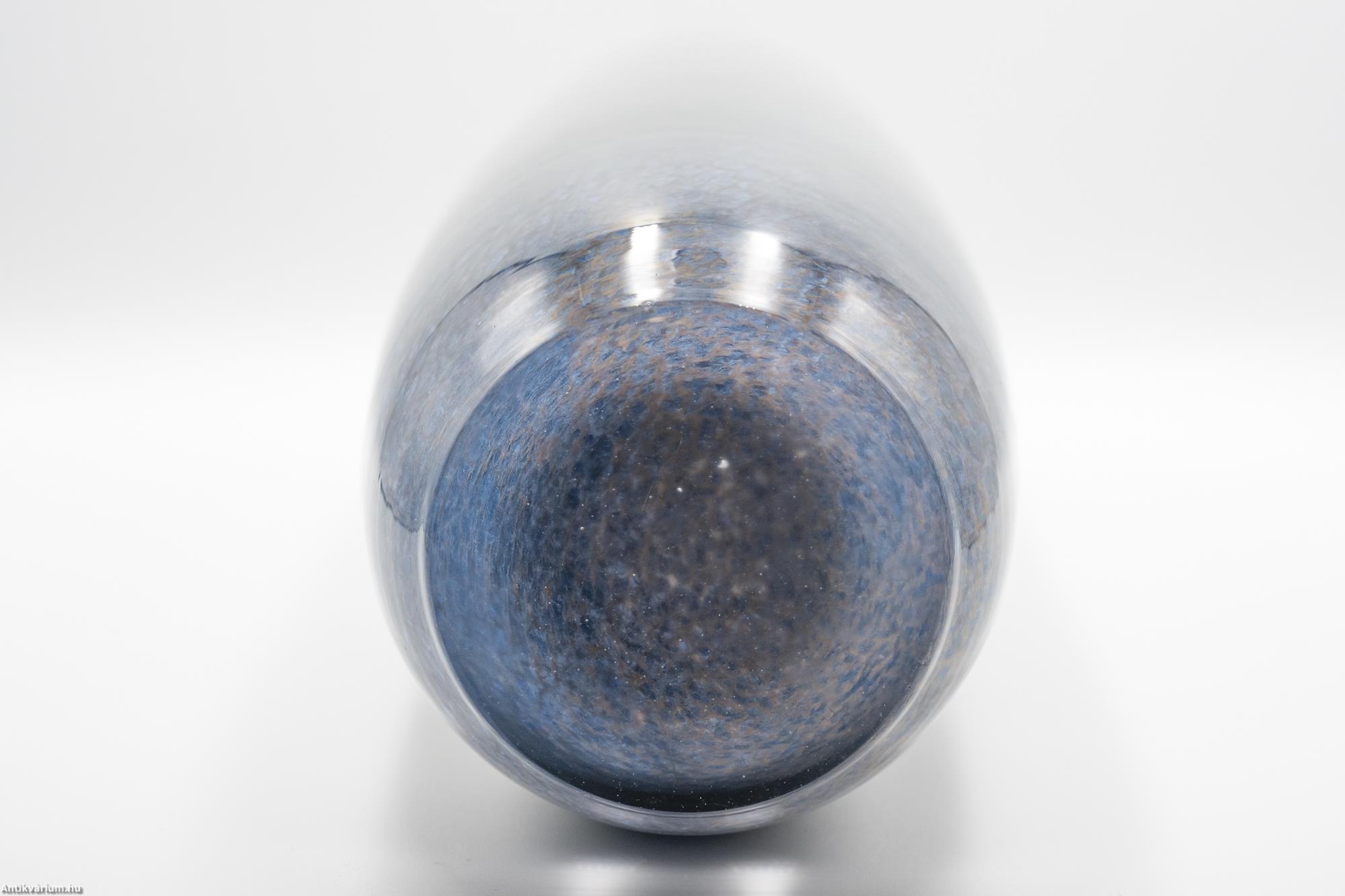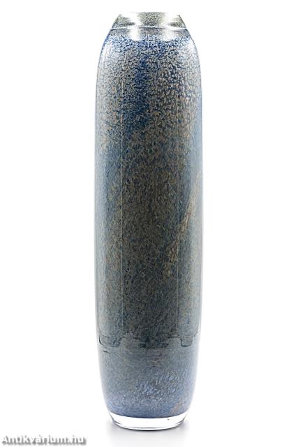 Hibátlan állapotú, fújt és kézzel formázott nagy méretű Murano Sommerso üveg váza a 20. század közepéből. Mind formájában, mind mintázatában egyedi alkotás. Pasztell világoskék színű belső üvegrétege szabálytalan pettyezett - márványos mintával és csillogó színtelen üvegből készült külső felülettel díszített. Az egységes hengeres kialakítás szinte szoborszerű megjelenést ad ennek az impozáns üveg vázának. Talpa és szájrésze azonos méretben szűkített. Mind a váza test, mind a felső és alsó perem kialakítása a kézi üvegfúvás egyediségét és kreativitását példázza. Talpa lapra csiszolt. Meglepő, üveg dísztárgyakon ritkán látott formát és dekort megjelenítő modern alkotás.