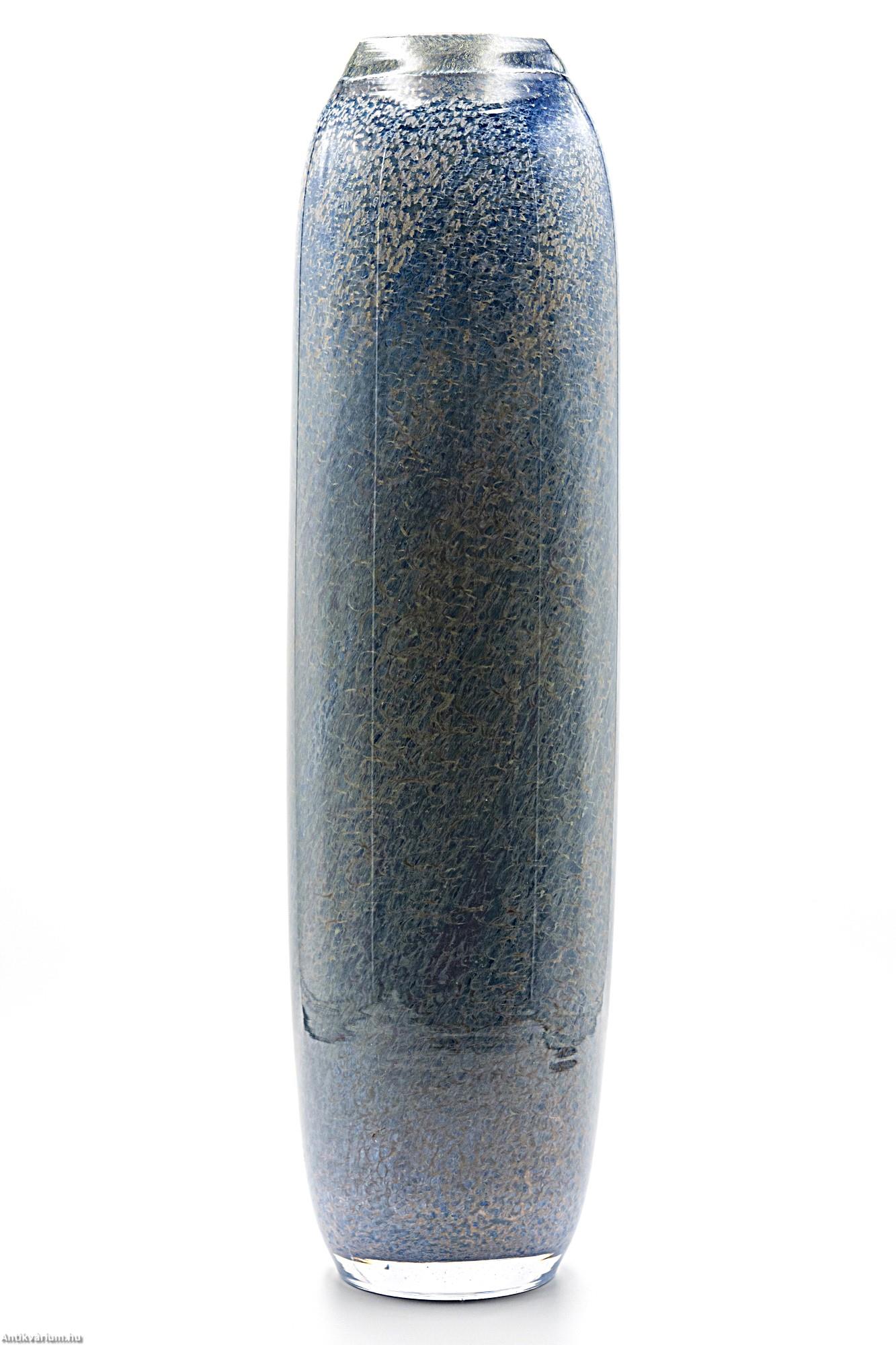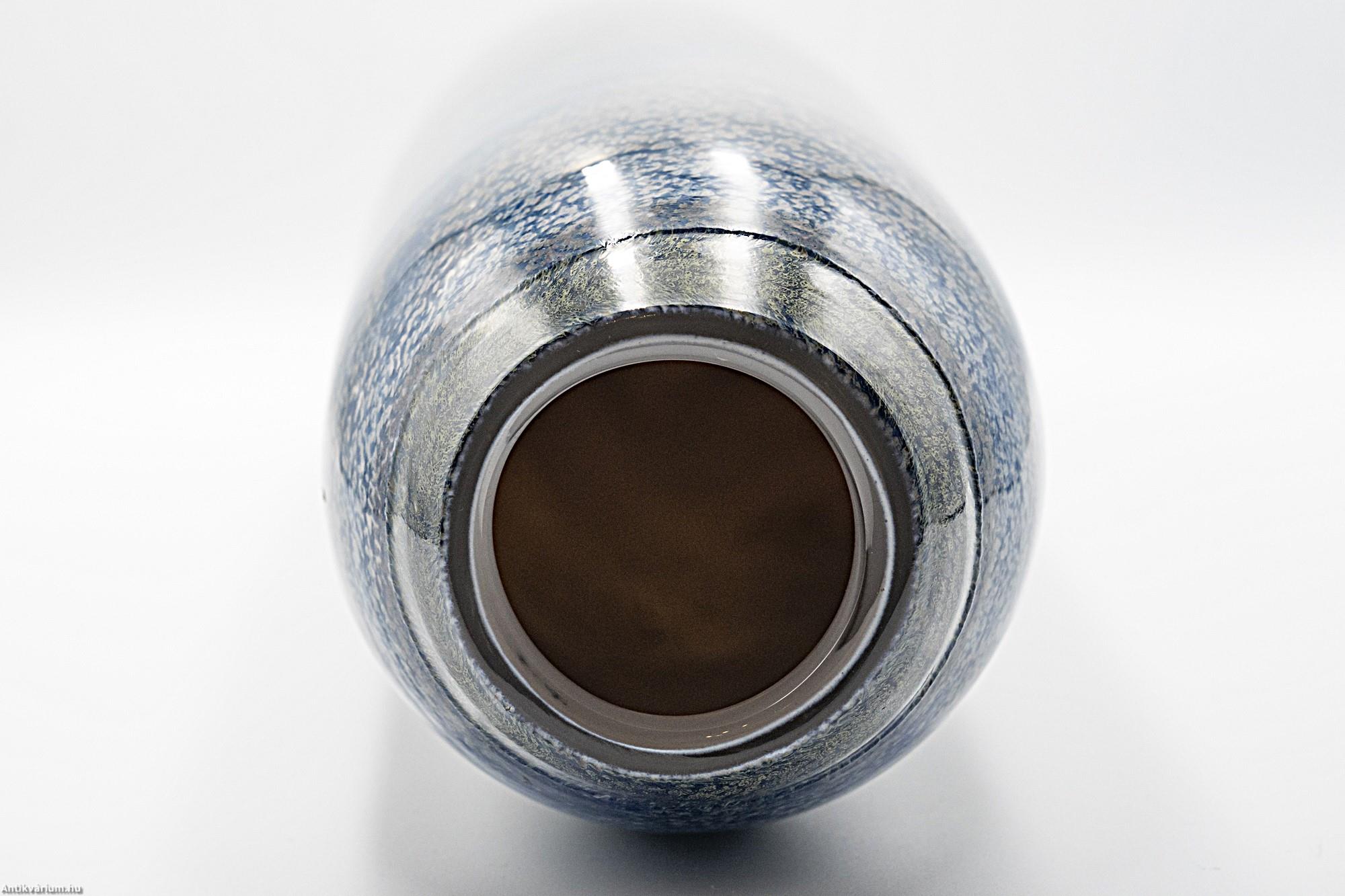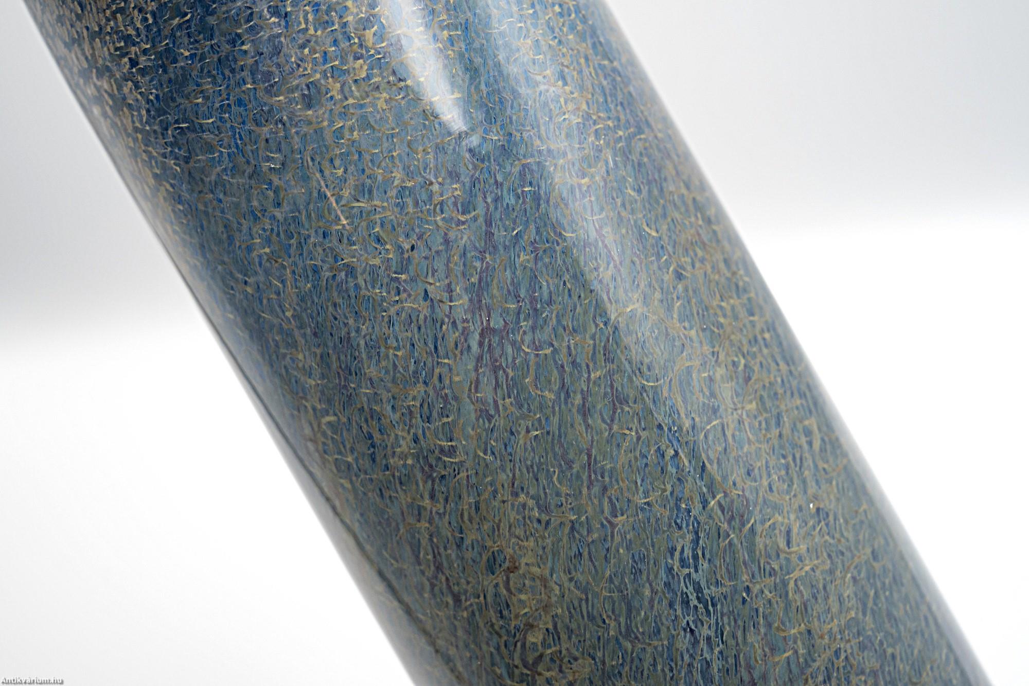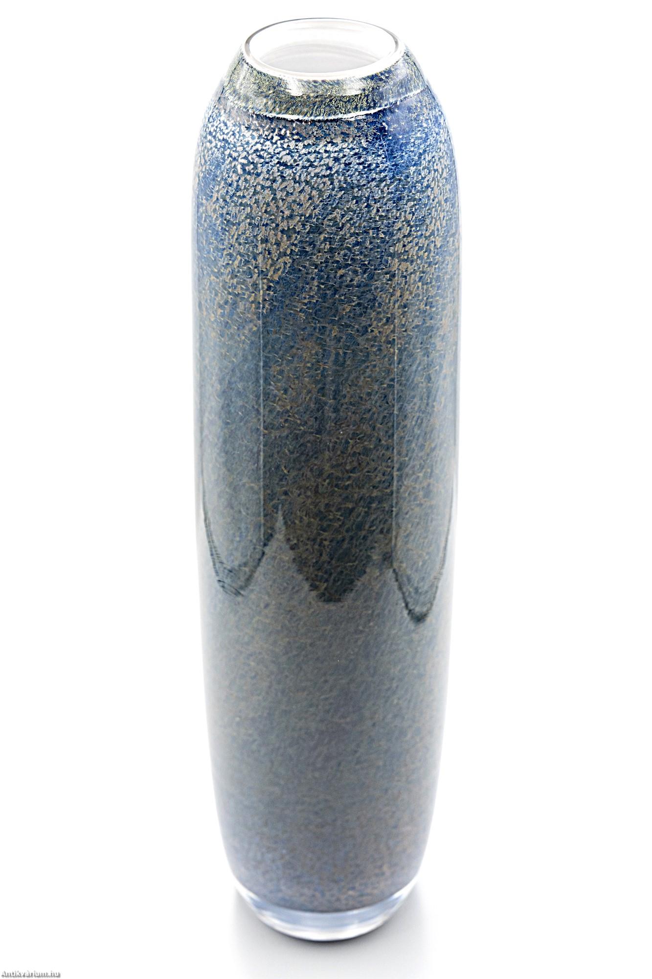 Hibátlan állapotú, fújt és kézzel formázott nagy méretű Murano Sommerso üveg váza a 20. század közepéből. Mind formájában, mind mintázatában egyedi alkotás. Pasztell világoskék színű belső üvegrétege szabálytalan pettyezett - márványos mintával és csillogó színtelen üvegből készült külső felülettel díszített. Az egységes hengeres kialakítás szinte szoborszerű megjelenést ad ennek az impozáns üveg vázának. Talpa és szájrésze azonos méretben szűkített. Mind a váza test, mind a felső és alsó perem kialakítása a kézi üvegfúvás egyediségét és kreativitását példázza. Talpa lapra csiszolt. Meglepő, üveg dísztárgyakon ritkán látott formát és dekort megjelenítő modern alkotás.