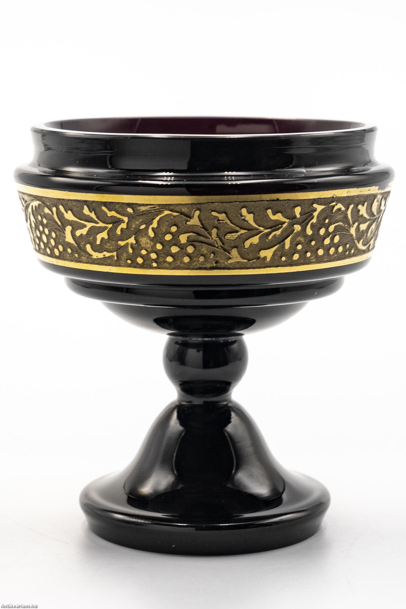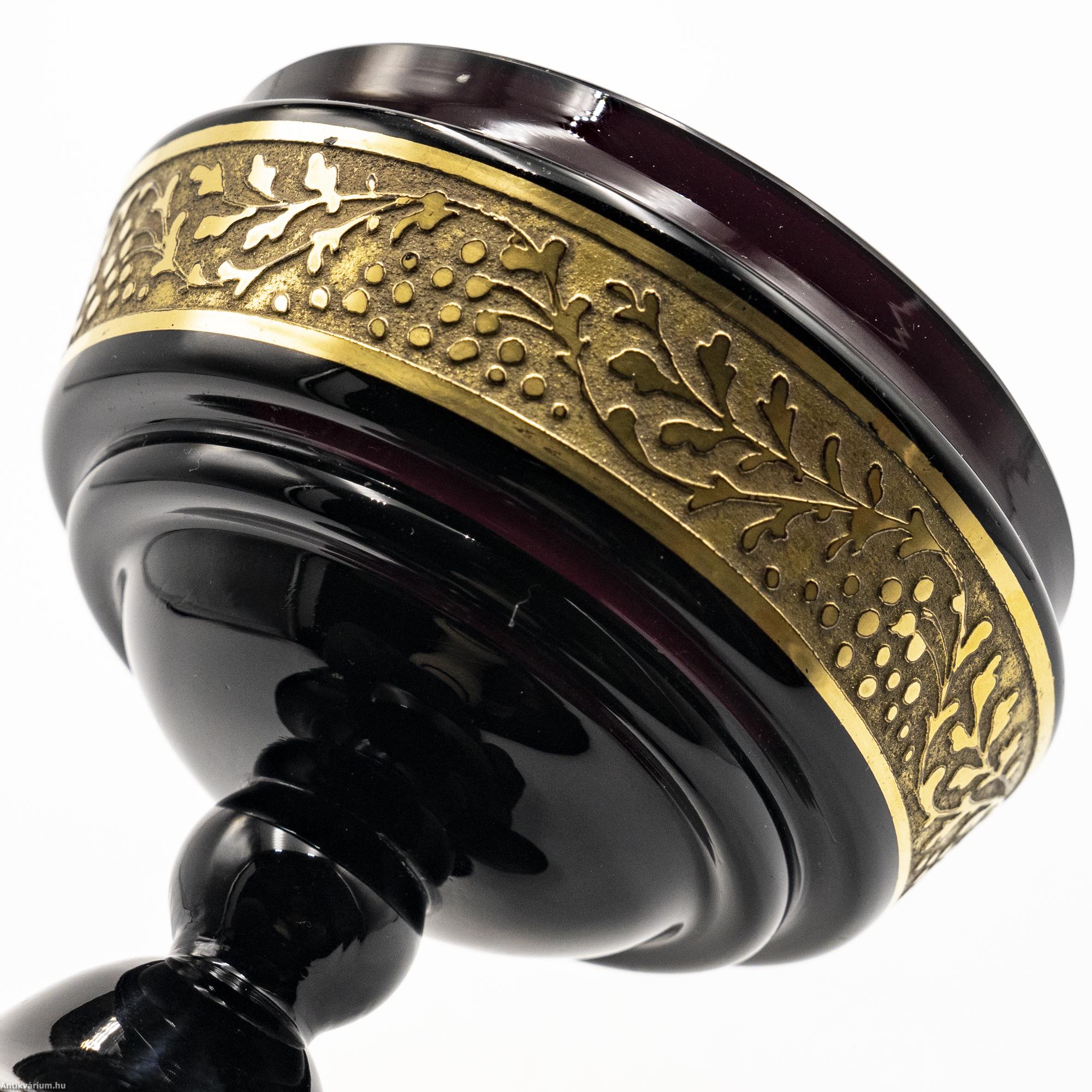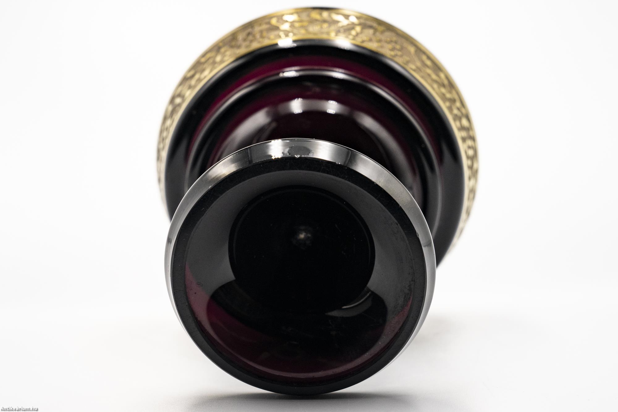 Hibátlan állapotú Meyrs Neffe art deco lila üveg kehely az 1910-es évekből. Fújt és kézzel formázott tömör üvegből készült üveg dísztárgy. A többszörösen tagolt, félgömb alakú kerek üveg kehely különlegessége a sávszerűen körbefutó, növényornamentikát ábrázoló arany színű plasztikus fríz, maratott és csiszolt díszítéssel. A sima felületű szárrész és talp a gömbforma különböző méretű tagolt megjelenítése. Kontrasztos színeket és arányokat megjelenítő, igényesen megmunkált egyedi üveg kehely a 20. század elejéről.