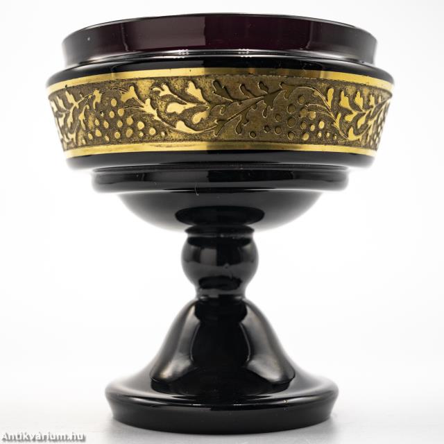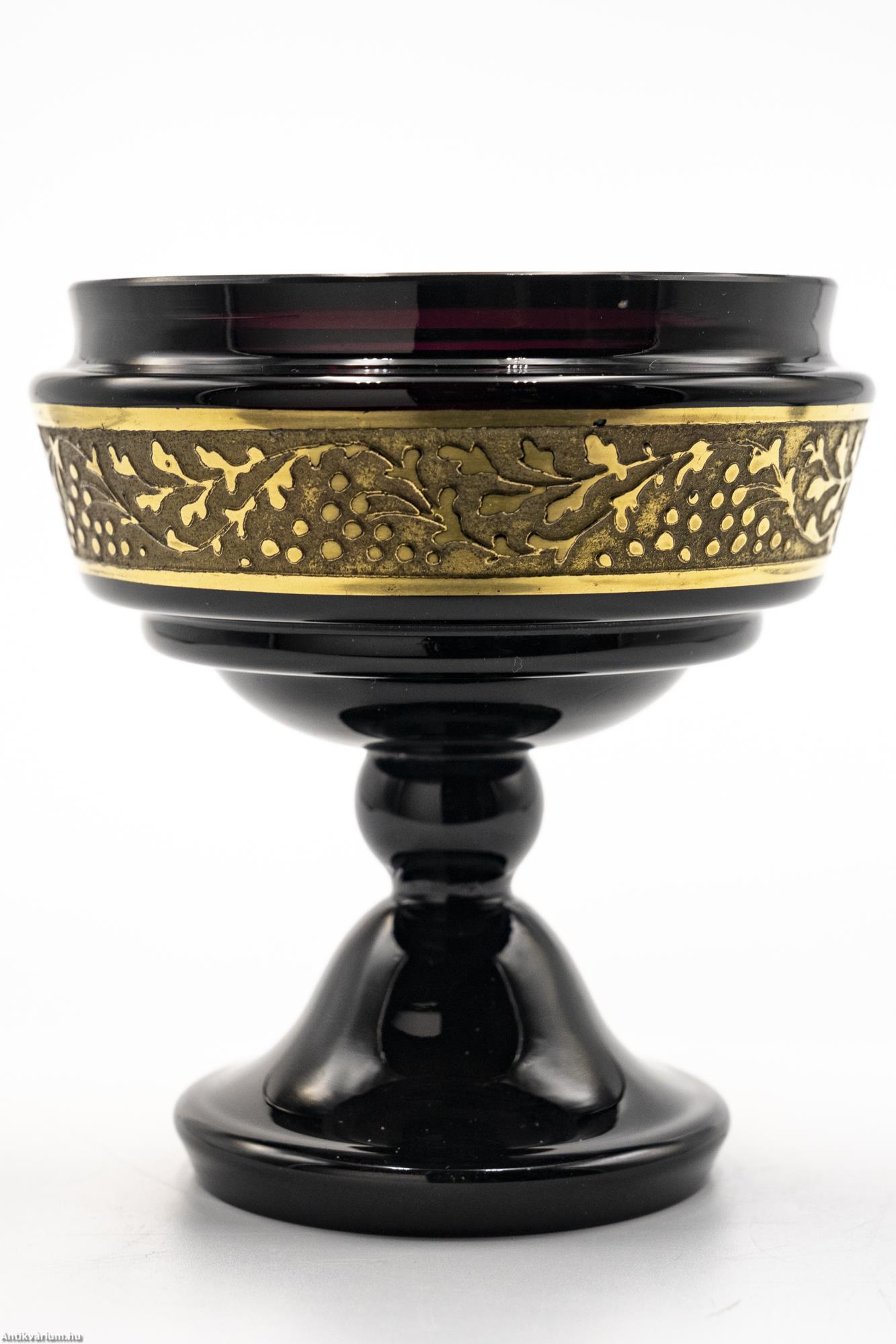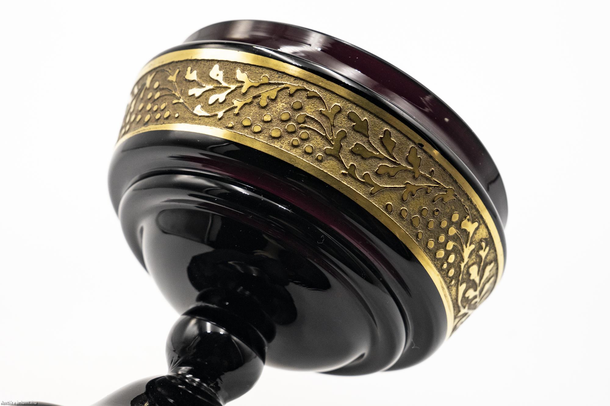 Hibátlan állapotú Meyrs Neffe art deco lila üveg kehely az 1910-es évekből. Fújt és kézzel formázott tömör üvegből készült üveg dísztárgy. A többszörösen tagolt, félgömb alakú kerek üveg kehely különlegessége a sávszerűen körbefutó, növényornamentikát ábrázoló arany színű plasztikus fríz, maratott és csiszolt díszítéssel. A sima felületű szárrész és talp a gömbforma különböző méretű tagolt megjelenítése. Kontrasztos színeket és arányokat megjelenítő, igényesen megmunkált egyedi üveg kehely a 20. század elejéről.
