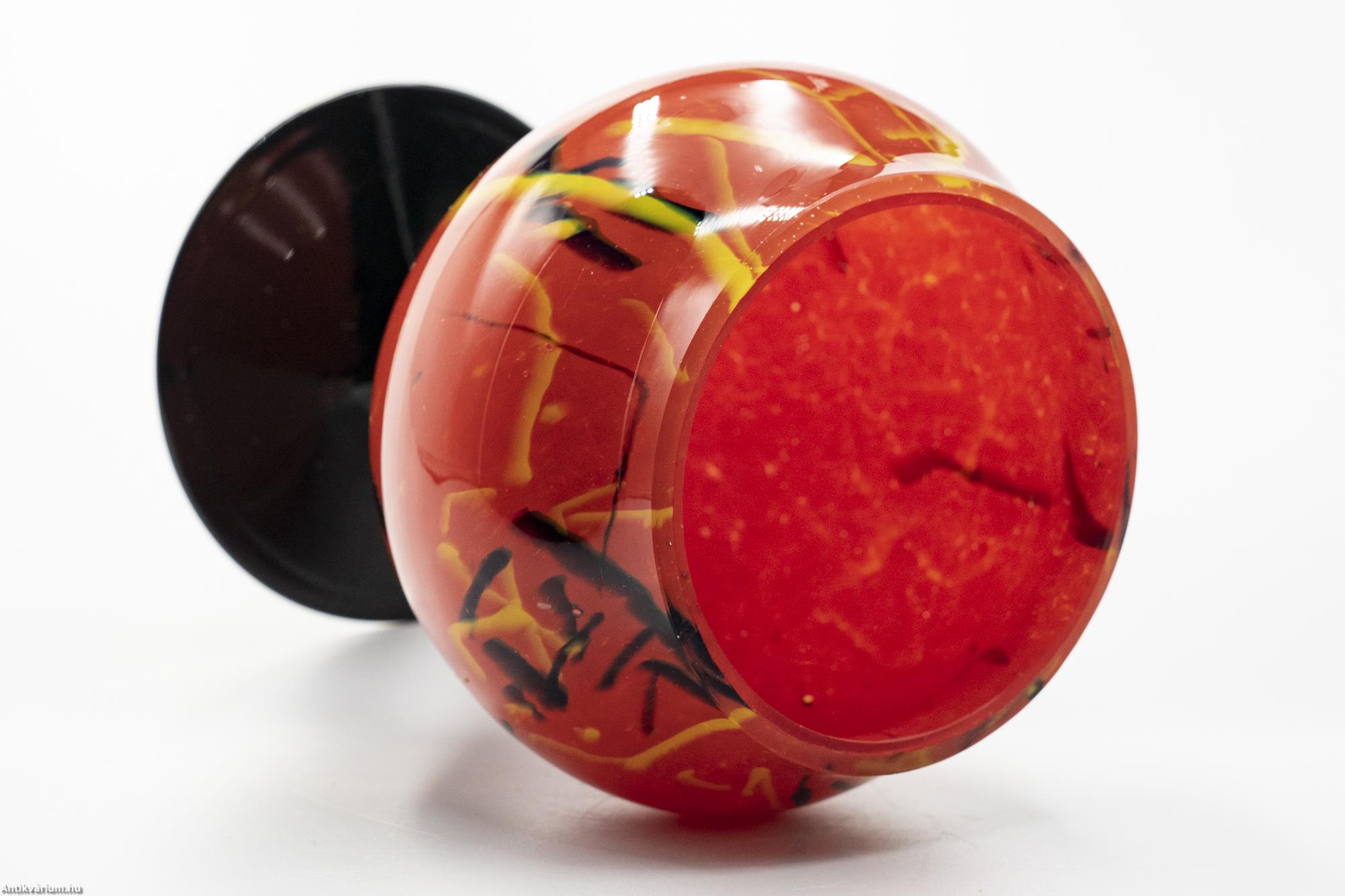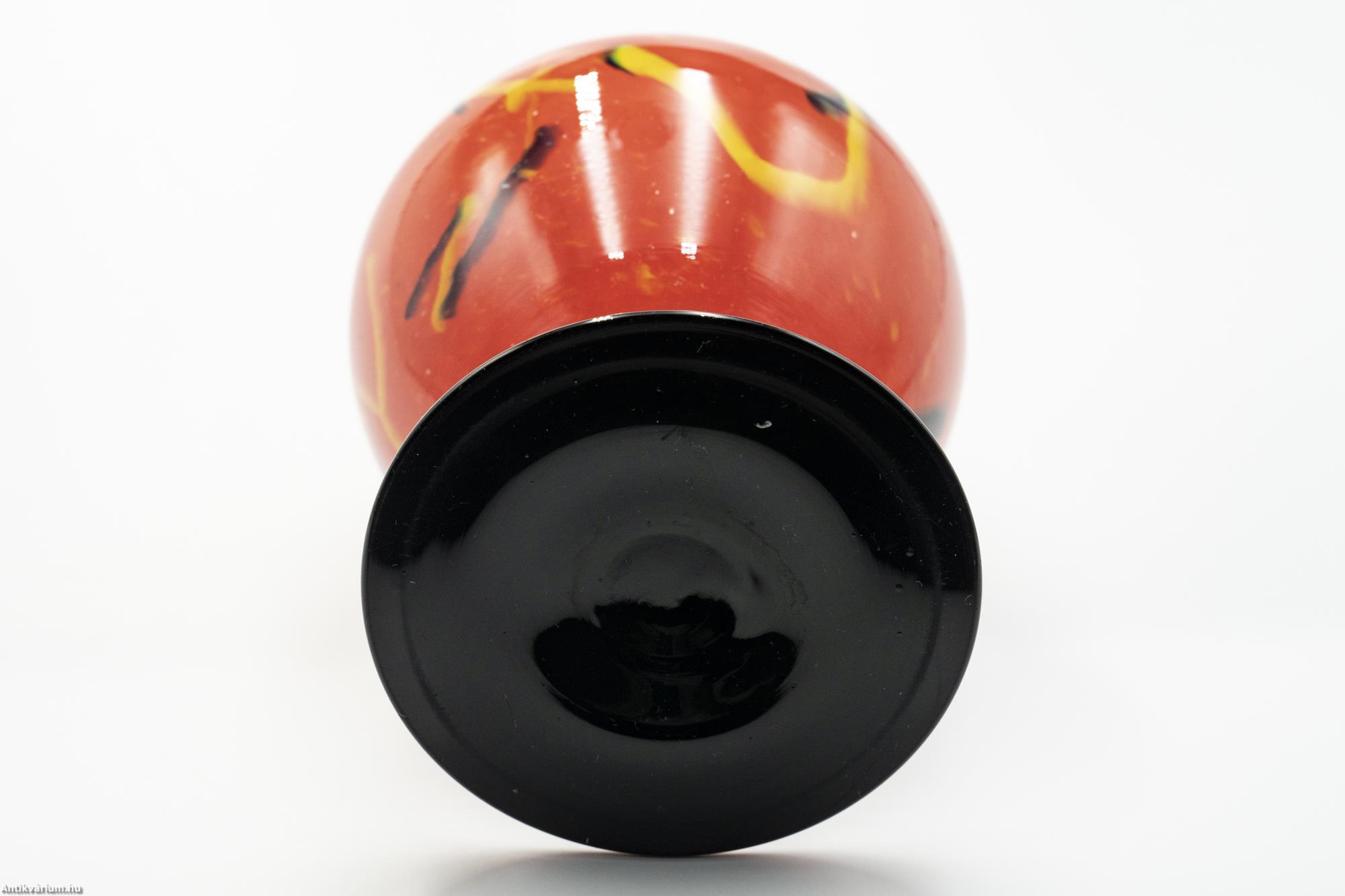 Hibátlan állapotú, cseh Tango üveg váza a 20. század elejéről. Különleges piros - fekete színpárosítása kontrasztos hatást kelt. A félgömb alakú kehely nagy méretű mintázattal díszített. Az aszimmetrikus elrendezésű szálminta fekete és sárga színekben igazán egyedi dekort alkot. Különleges, izzó színvilágú dísztárgy, a cseh századeleji kézműves ipar jellegzetes alkotása.
