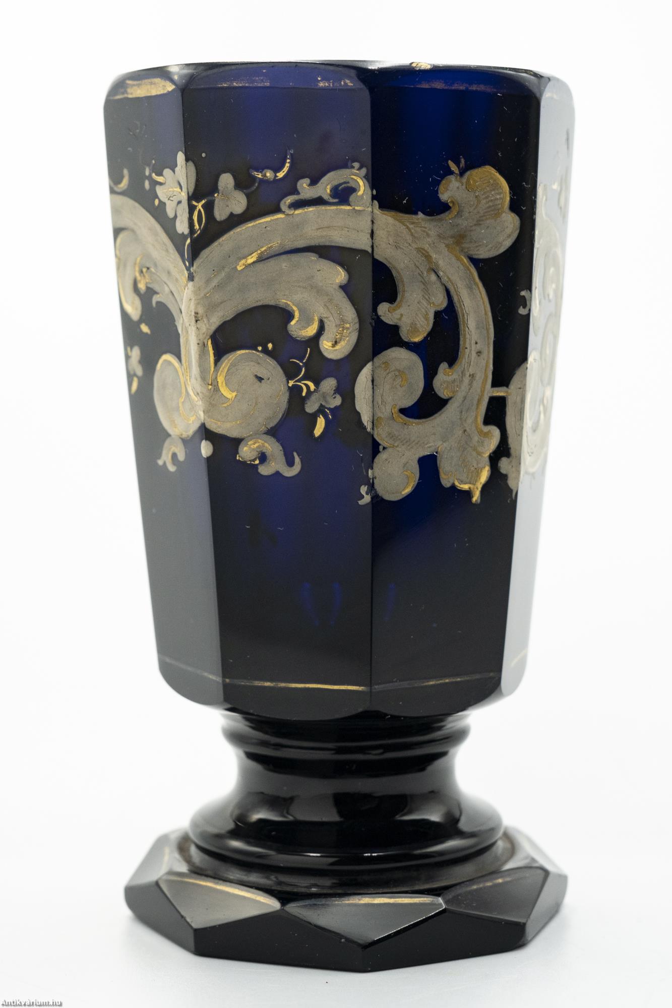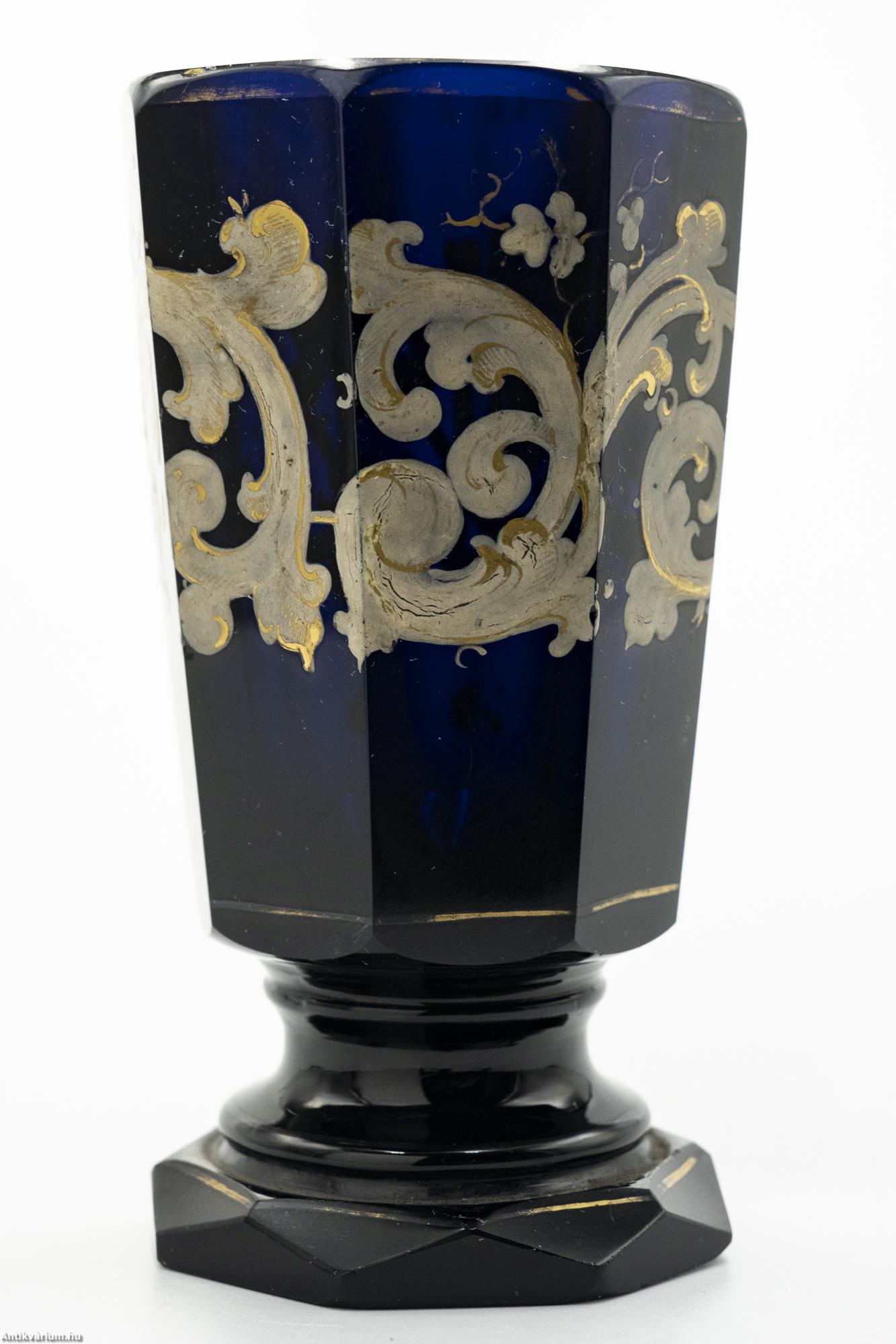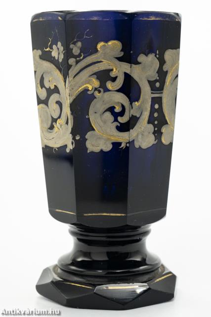Hibátlan állapotú, fújt és kézzel formázott cseh biedermeier festett kobaltkék üveg váza a 19. század közepéből. A biedermeier kor hangulatát és annak művészi kifejeződését minden részletében és jellegzetességében megjelenítő dísztárgy. Simára csiszolt, nyolcosztásos felületét részletgazdag, kézzel festett fehér és aranyszínű körkörös mintázat fedi, amely füzér és növényornamentikai formákat ábrázol. Különlegességét szintén nyolcosztásos, csiszolta talprész adja, amelyet tovább hangsúlyoz a rajta körbefutó arany színű kontúr festés. Talpán simára csiszolt. Korát és dekor mintázatát tekintve ritka, gyűjtői darab.