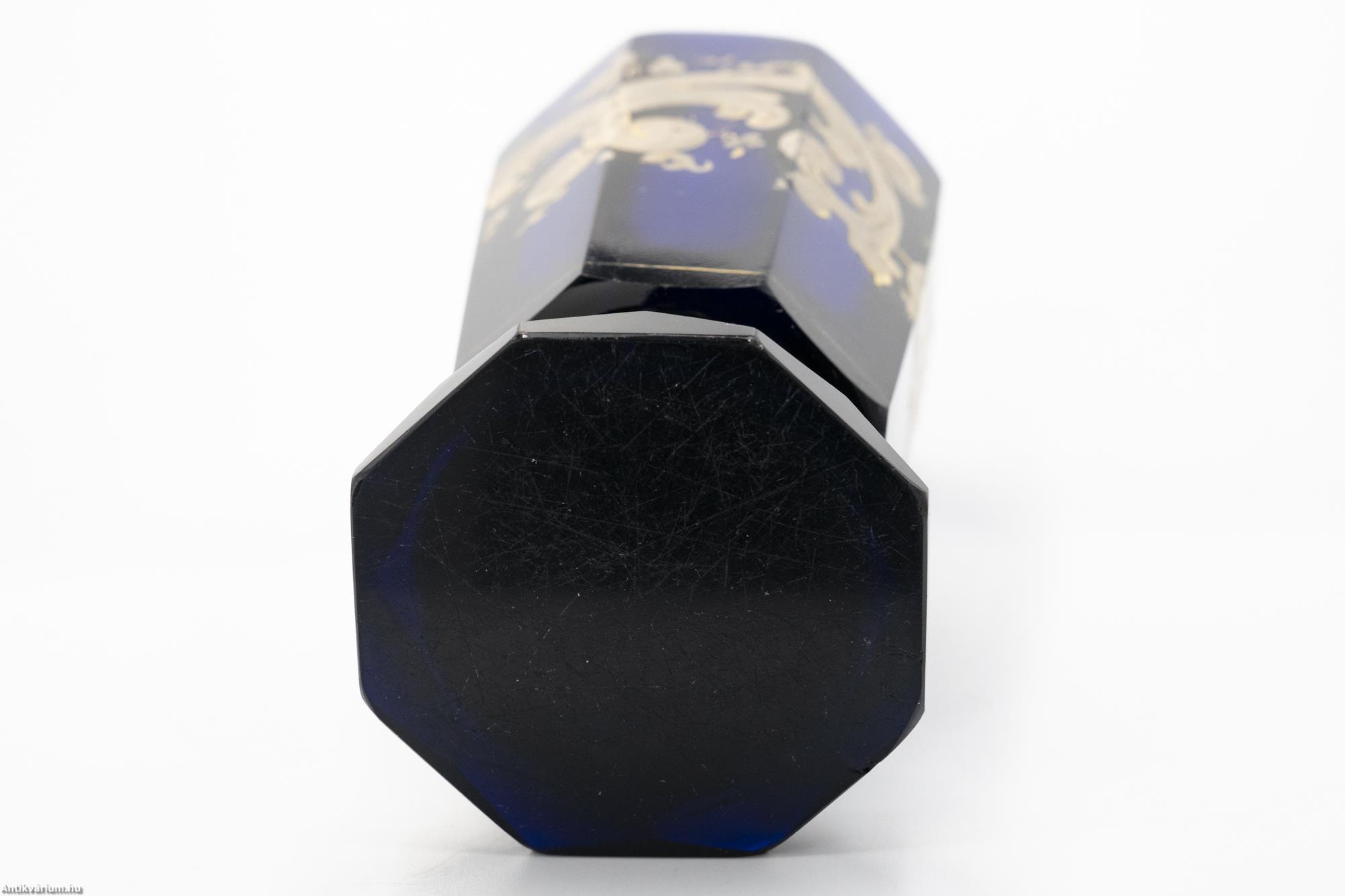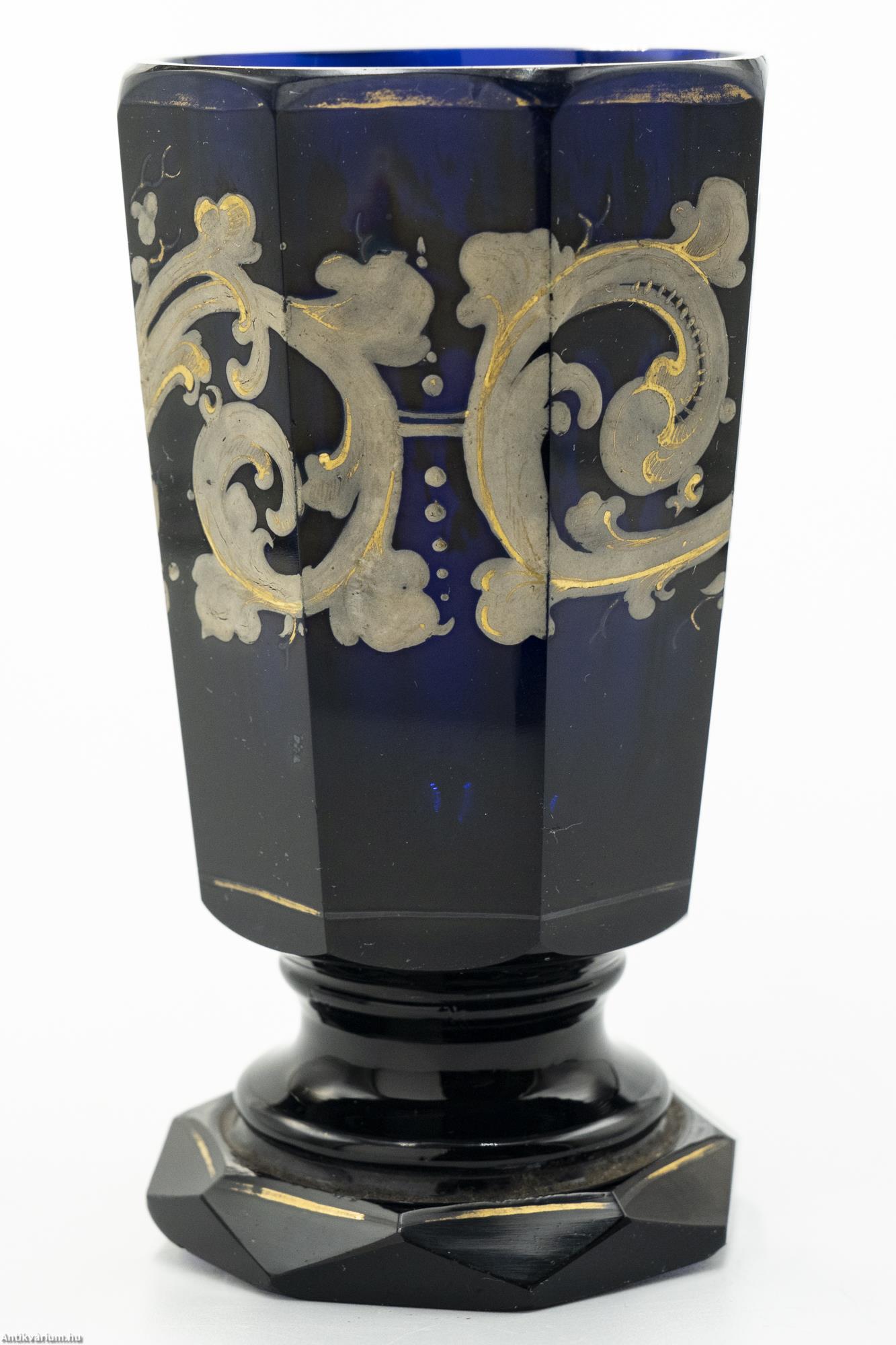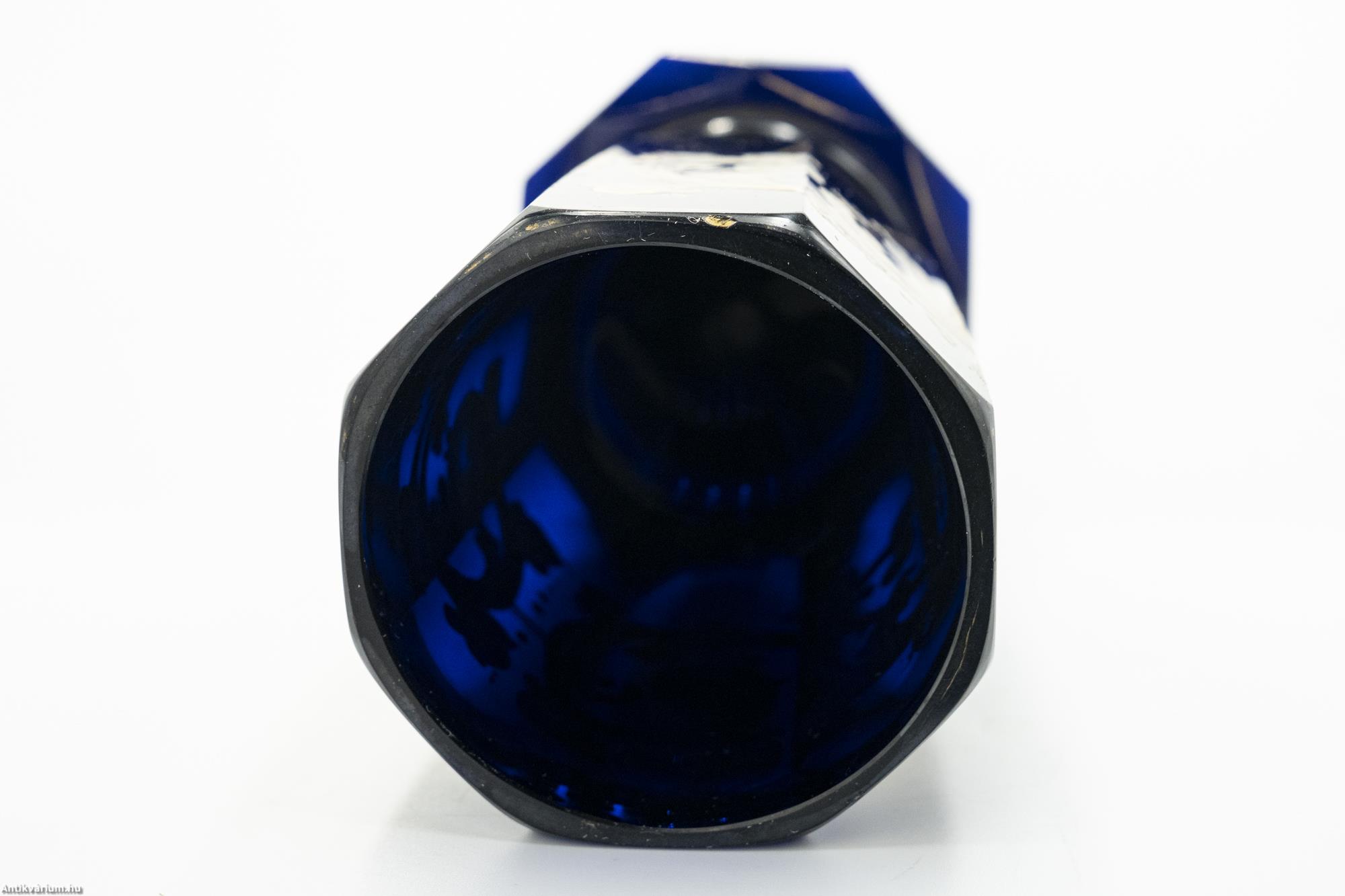Hibátlan állapotú, fújt és kézzel formázott cseh biedermeier festett kobaltkék üveg váza a 19. század közepéből. A biedermeier kor hangulatát és annak művészi kifejeződését minden részletében és jellegzetességében megjelenítő dísztárgy. Simára csiszolt, nyolcosztásos felületét részletgazdag, kézzel festett fehér és aranyszínű körkörös mintázat fedi, amely füzér és növényornamentikai formákat ábrázol. Különlegességét szintén nyolcosztásos, csiszolta talprész adja, amelyet tovább hangsúlyoz a rajta körbefutó arany színű kontúr festés. Talpán simára csiszolt. Korát és dekor mintázatát tekintve ritka, gyűjtői darab.