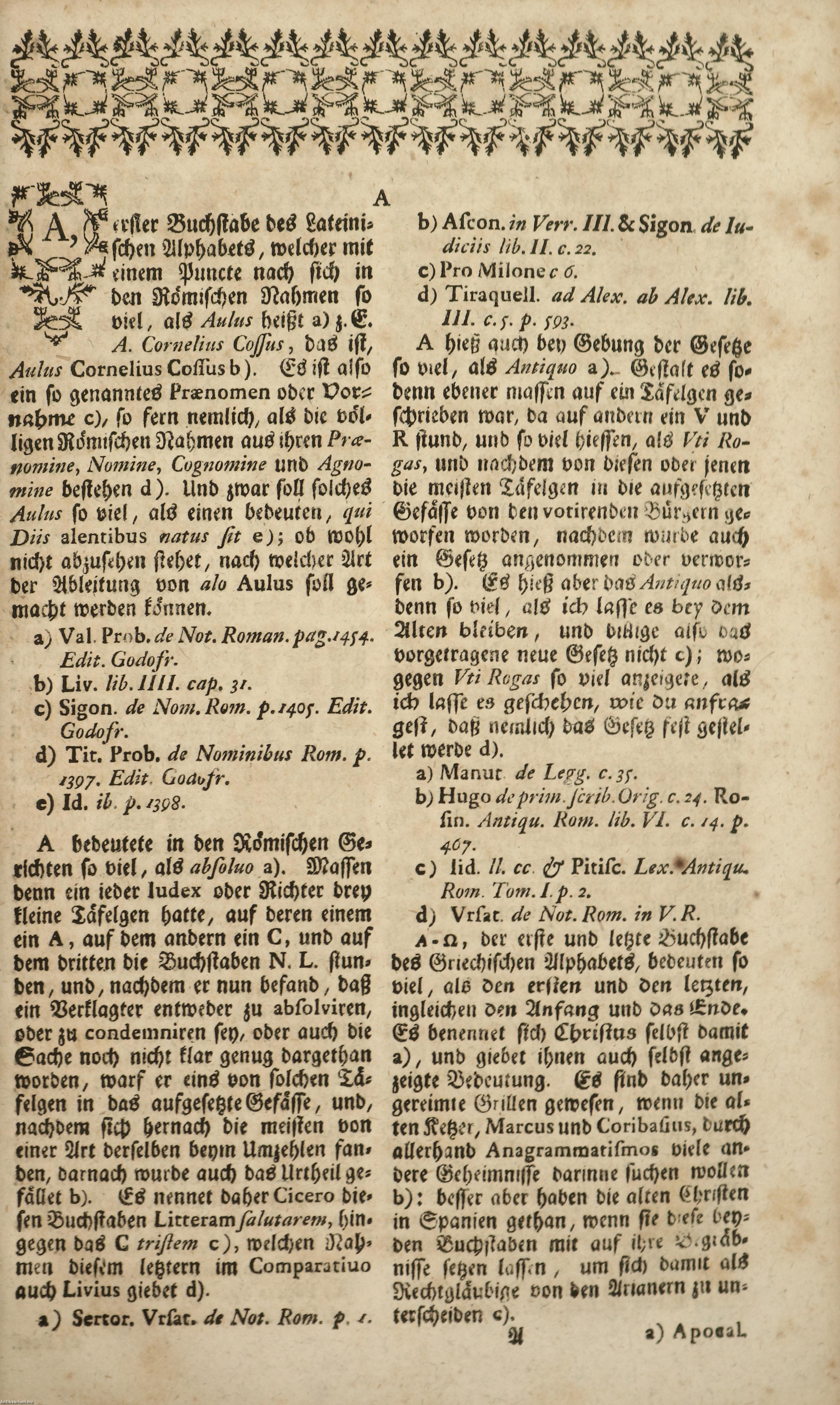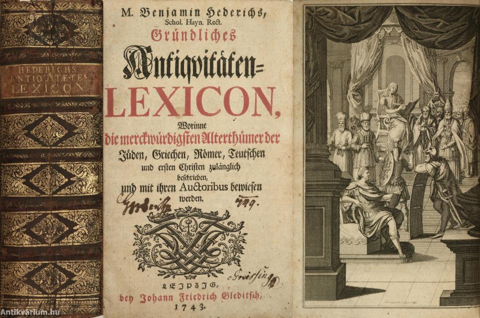 M. Benjamin Hederichs, Schol. Hayn. Rect. Gründliches Antiquitäten Lexicon, worinne die merckwürdigsten Alterthümer der Jüden, Griechen, Römer, Teutschen und ersten Christen zulänglich beschrieben, und mit ihren Auctoribus bewiesen werden. / Az antikvitások alapos lexikonja, melybe a zsidók, görögök, rómaiak, germánok és első keresztények legnevezetesebb régiségei mind belefoglaltattak és szerzőik által bizonyíttattak. Közreadja: Benjamin Hederich.