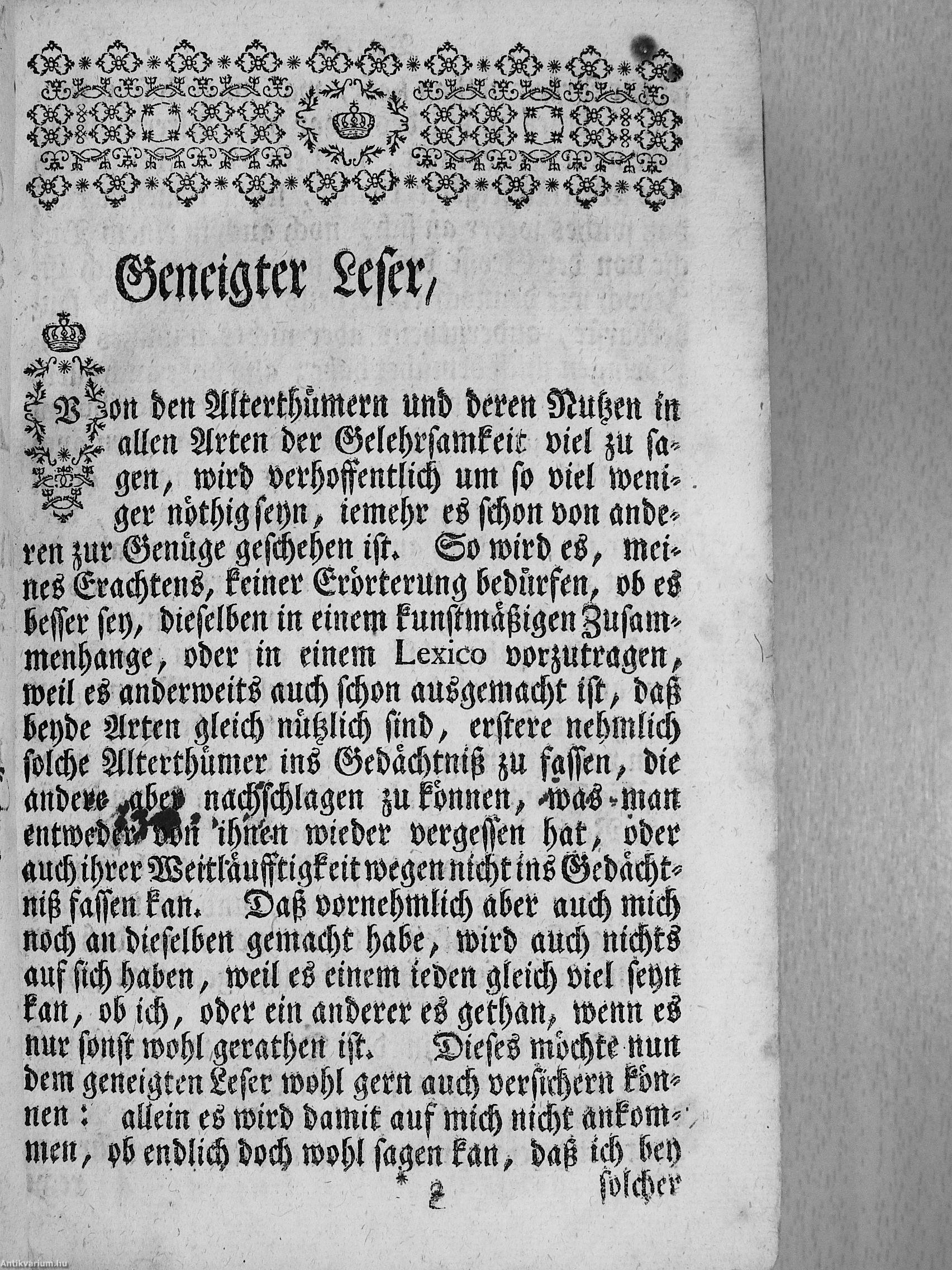 Címlapképen egy rézmetszetes táblával, valamint néhány könyvdísszel illusztrált, német nyelvű, gót betűs, ókori történelmi és kulturális fogalmakat magyarázó lexikon. Kötetvégi mutatóval (Register der Artickel). Az első előzéken és címlapon tollal írt, régi tulajdonosi bejegyzések láthatók.