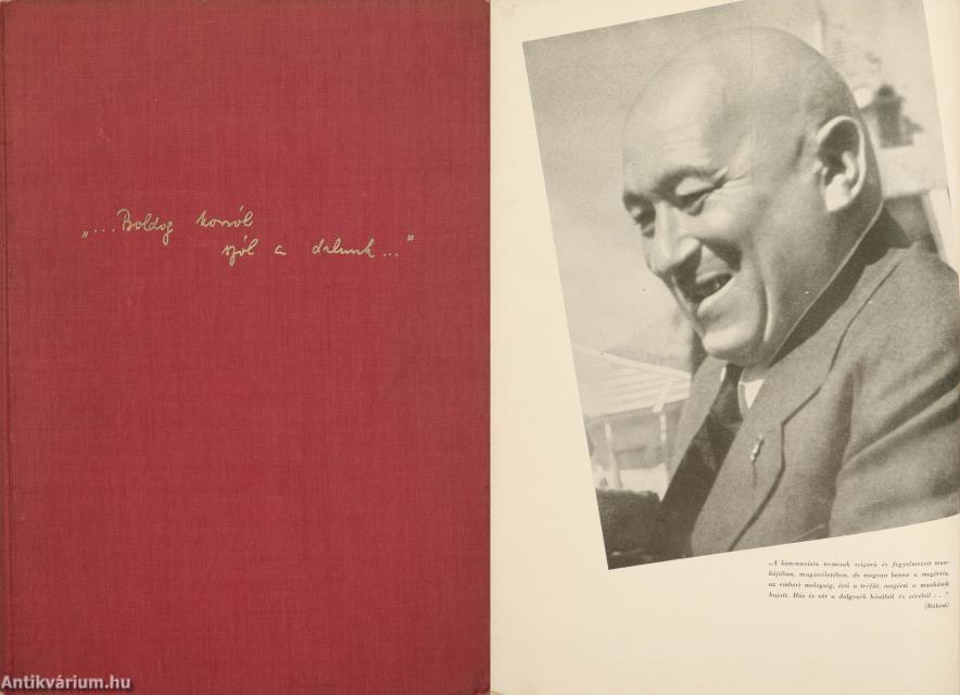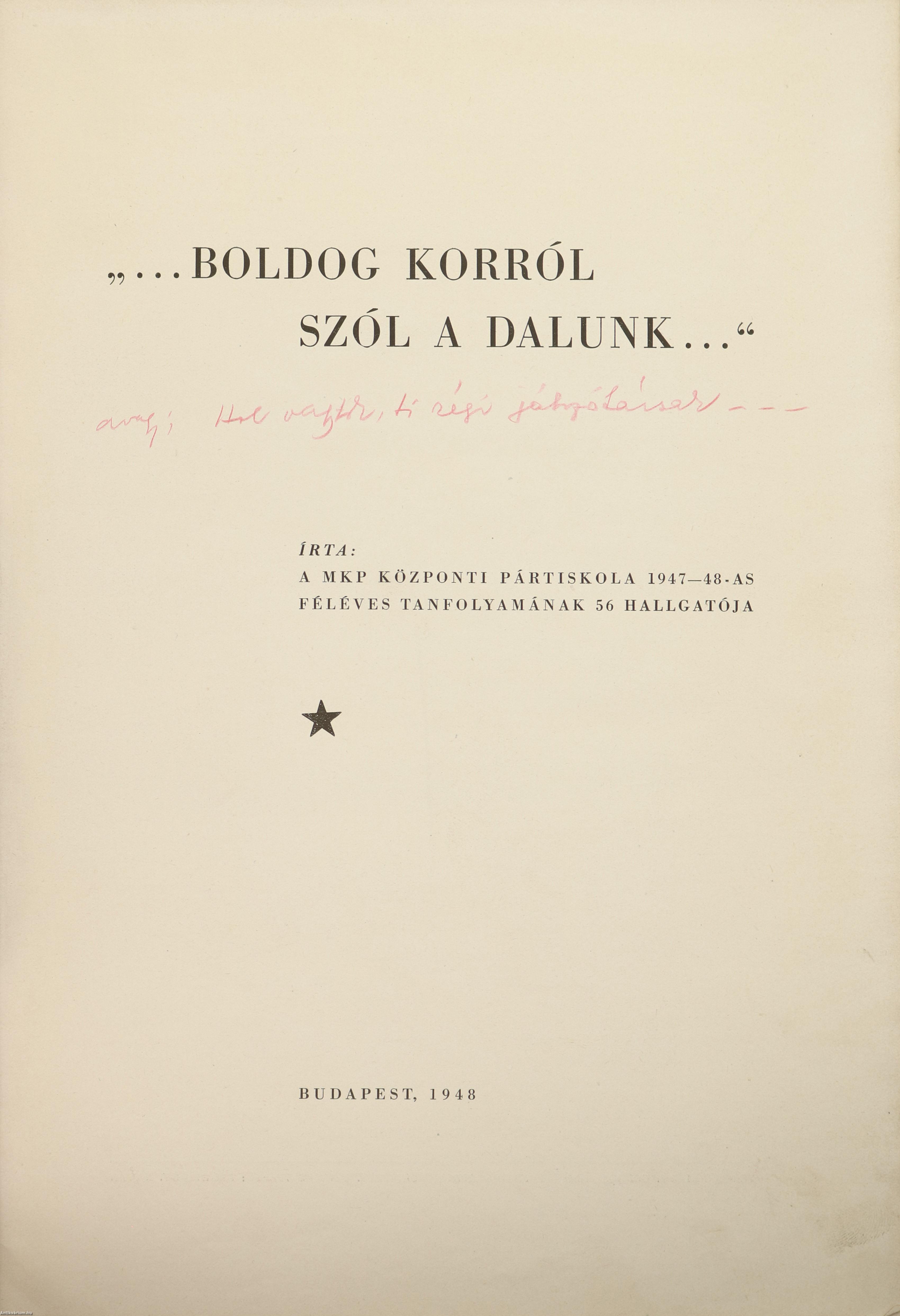 Első kiadás. "...Boldog korról szól a dalunk..." Írta: A MKP Központi Pártiskola 1947-1948-as féléves tanfolyamának 56 hallgatója.