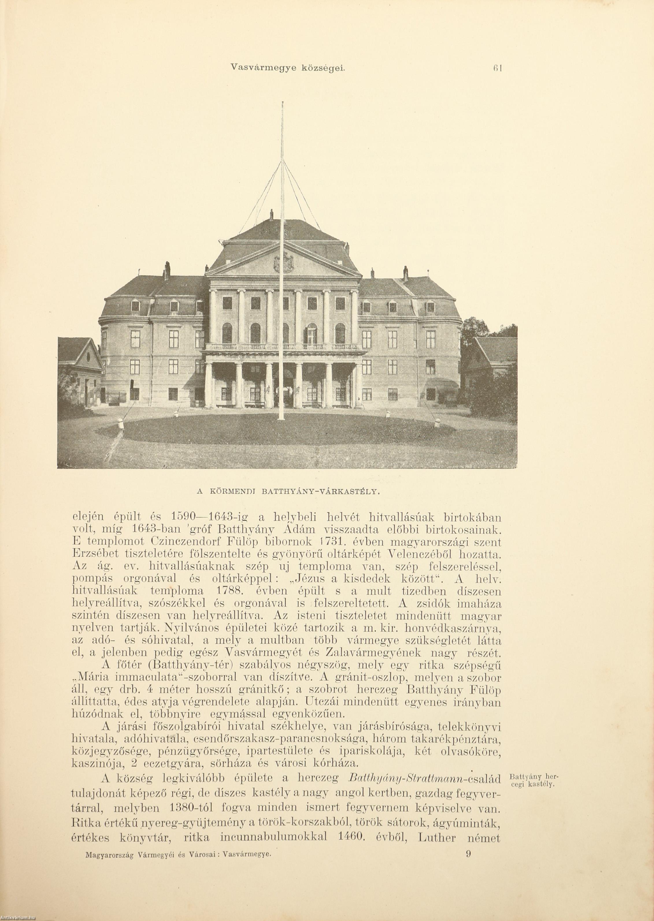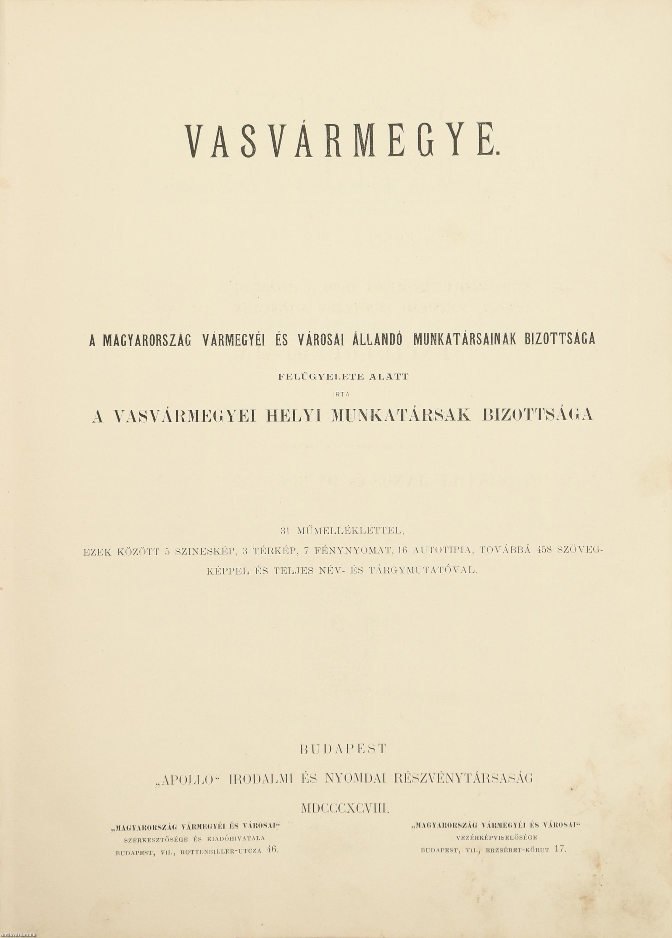 | Vasvármegye községei. Írta Vende Aladár. Borostyánkő várát és Szent-Gotthárdot Kormos Pál. Felső-Eőrt Guoth Lajos, Felső-Lövőt Ebenspanger János, a jáki templomot és Német-Újvárt Sziklay János, Kis-Czellt dr. Berzsenyi Jenő, Körmendet Perényi Antal, Muraszombatot Pollák Pongrácz, Rohonczot dr. Nagy Ignácz, Pinkafőt Rattner Mihály, Sárvárt Barabás István, Vasvárt Barabás György. A máriafalvi, rőti és veleméri templomot Horváth Sándor ismerteti. E fejezetet átnézte dr. Károlyi Antal alispán | 15 |
