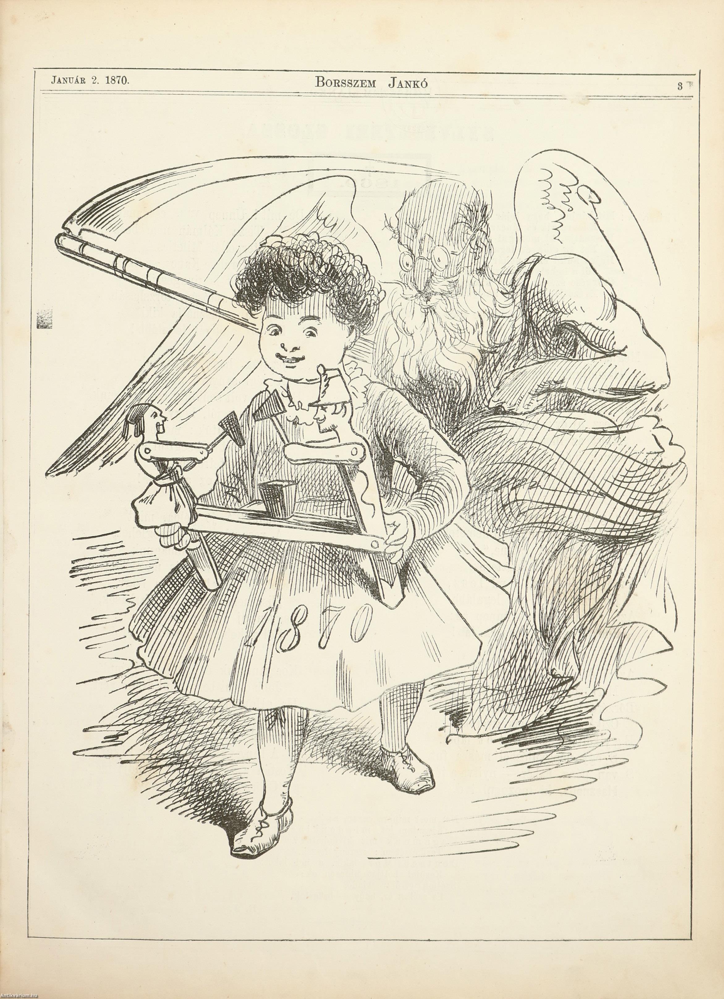 „1868-ban jelent meg a legnépszerűbb dualizmuskori élclap, a Borsszem Jankó első száma, mely Ágai Adolf főszerkesztő gondozásában került az olvasókhoz. Művészi igényű karikatúráival, szatirikus írásaival a Borsszem Jankó fennállása első fél évszázadában több mint kétezer fős olvasótábort toborzott magának, csökkenő népszerűséggel pedig egészen az 1938-as esztendőig fennmaradt. […] [S]zületése a kormányzó Deák-párthoz, közelebbről pedig Andrássy Gyula miniszterelnökhöz kötődött, aki Az Üstökös és a Bolond Miksa baloldali – tehát ellenzéki – fordulatát látva egy olyan élclapot akart alapítani, mely válaszol a ’48-as alapokon politizáló és bíráló körök támadásaira. A lap jobboldali, liberális szellemben készült, főszerkesztője ezért fontosnak tartotta, hogy vetélytársaival szemben inkább a nyugaton divatos formákat vegye át: a Borsszem Jankó megjelenésében, karikatúráival és cikkeivel ezért főleg a brit Punch és a német Fliegende Blätter felépítését másolta.” (Forrás: Arcanum)