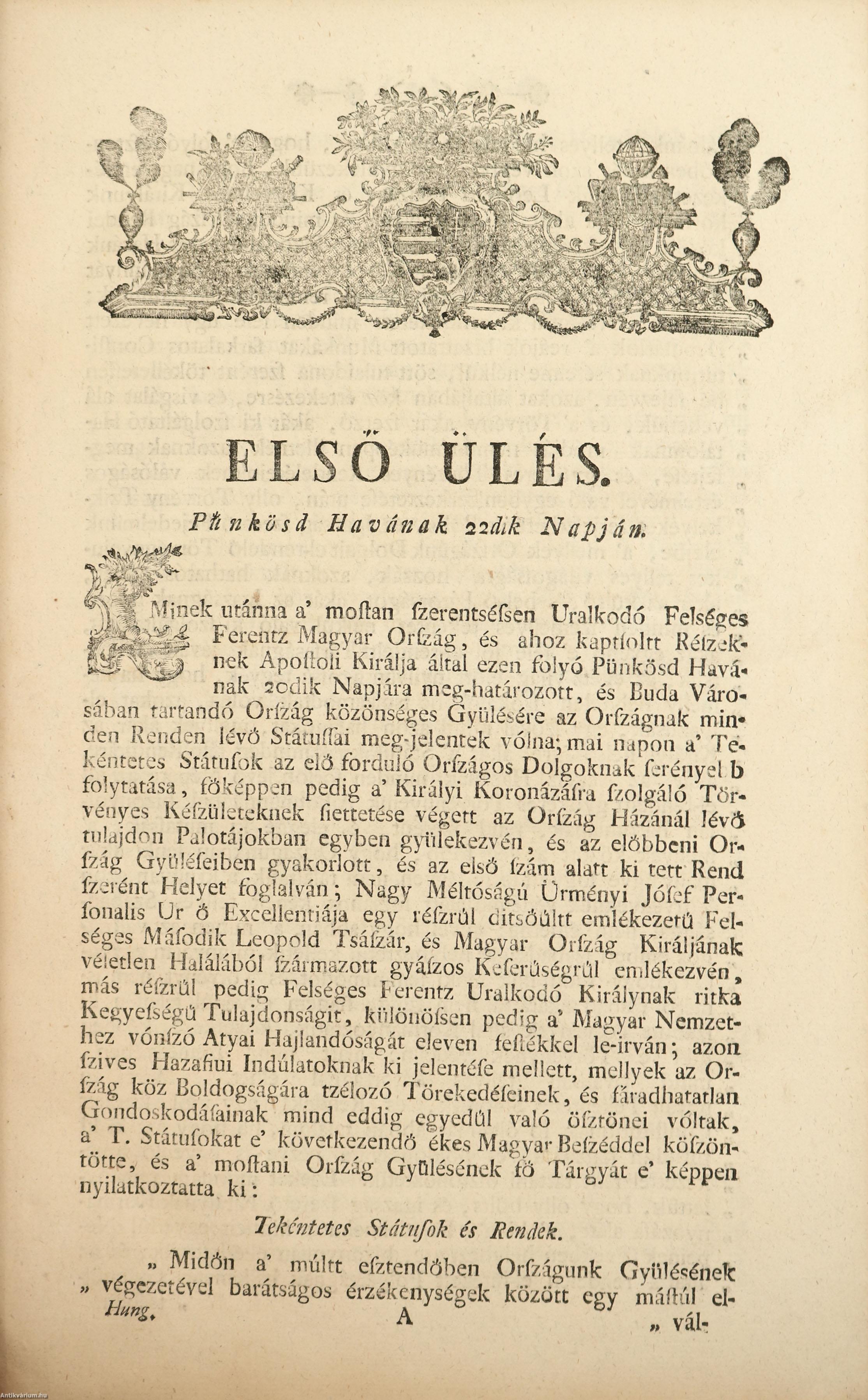 A kötet az 1792. május-júniusban tartott budai országgyűlés jegyzőkönyvét tartalmazza. Ez volt az első országgyűlés II. Lipót 1792. márciusi halála után, első és legfontosabb pontja pedig I. Ferenc magyar királyként való elfogadása volt: "Nints tehát egyébb hátra Tekéntetes Státusok , és Rendek! hanem hogy azt; a' miért itt illy számossan öszve gyülekeztünk, minden lehető módon közelitsük, hivjuk kérelemmel közénkben minden halasztás nélkűl szerentsés Koronázására Felséges Királyunkat, és minekutánna szent Koronánkat fel vévén szorossabb szeretet kötéssel hozzánk kaptsoltatik, minden bizodalommal legyünk hozzája mint igaz, és kegyes Atyánkhoz."
