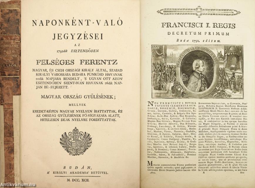 Naponként-való jegyzései az 1792dik esztendőben Felséges Ferentz magyar, és cseh országi király által, szabad királyi városába Budára Pünkösd havának 20dik napjára rendelt, 's ugyan ott azon esztendőben Szent-Iván havának 26dik napján bé-fejezett magyar ország gyűlésének; mellyek eredet-képen magyar nyelven írattattak, és az ország gyűlésének fő-vígyázása alatt, hitelesen deák nyelvre fordíttattak.