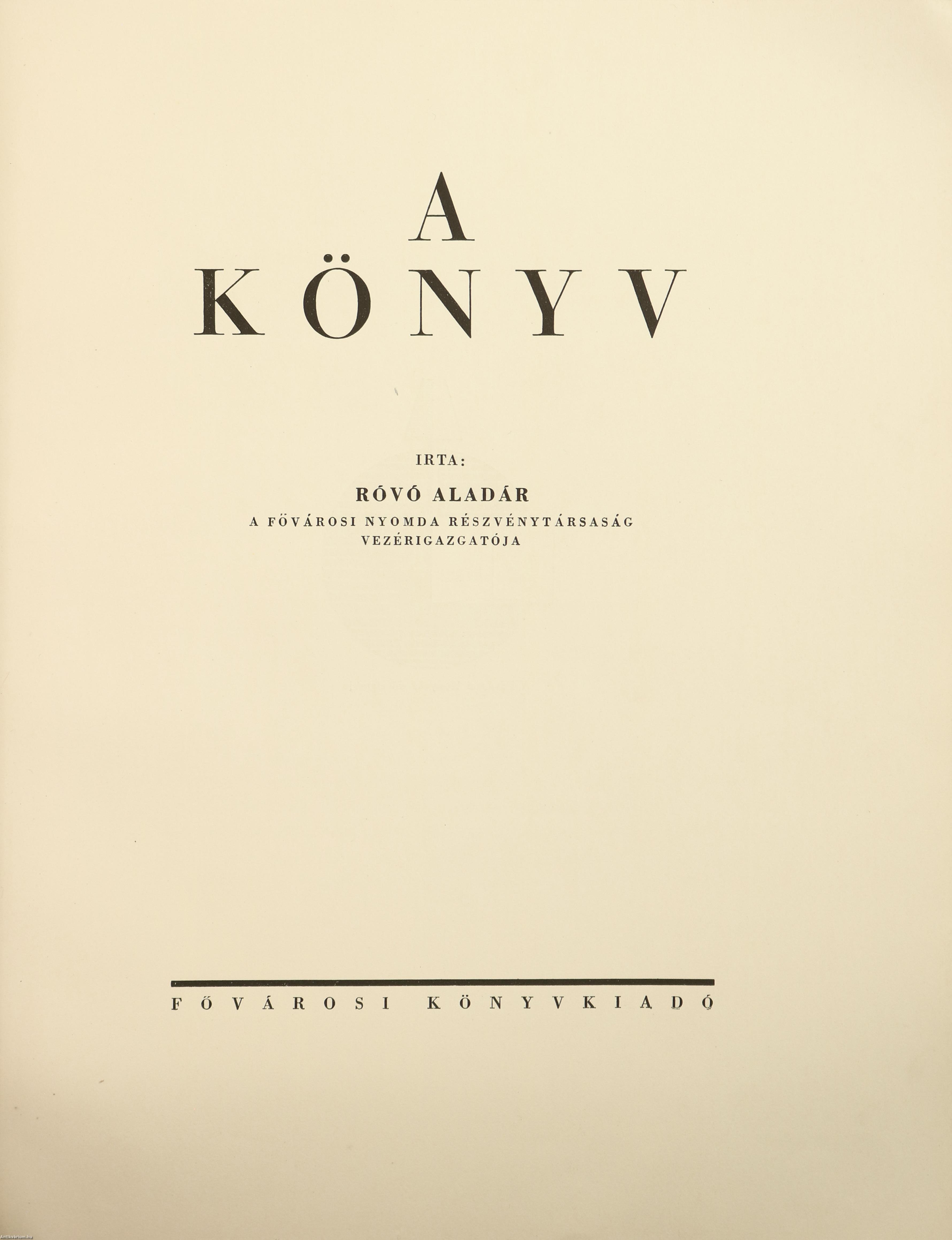 Első kiadás. A könyv. Írta: Róvó Aladár, a Fővárosi Nyomda Részvénytársaság vezérigazgatója.