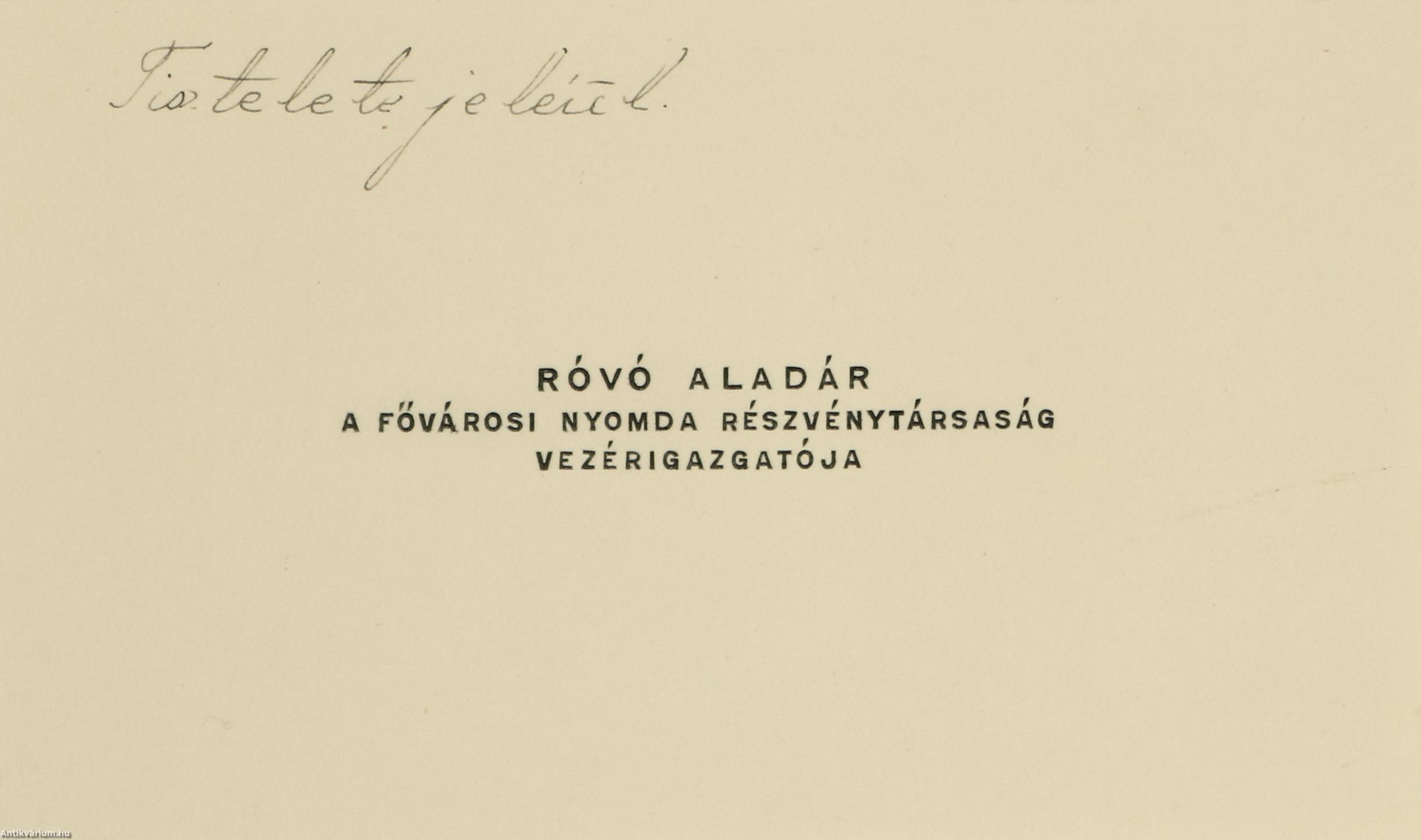 Különálló, egyedi melléklet: a szerző nyomtatott névjegykártyája, rajta egy tollal írt felirattal ("Tisztelete jeléül.").