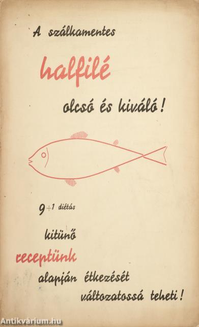 Nógrádi Megyei Élelmiszer Kiskereskedelmi Vállalat szórólapja, mellyel az üzleteiben egész éven át folyamatosan és olcsón kapható halfilére hívja fel a figyelmet. A szórólap tartalmaz 9 halfilé és egy diétás halszelet receptet, valamint a halfilé előkészítéséhez egy jó tanácsot.
