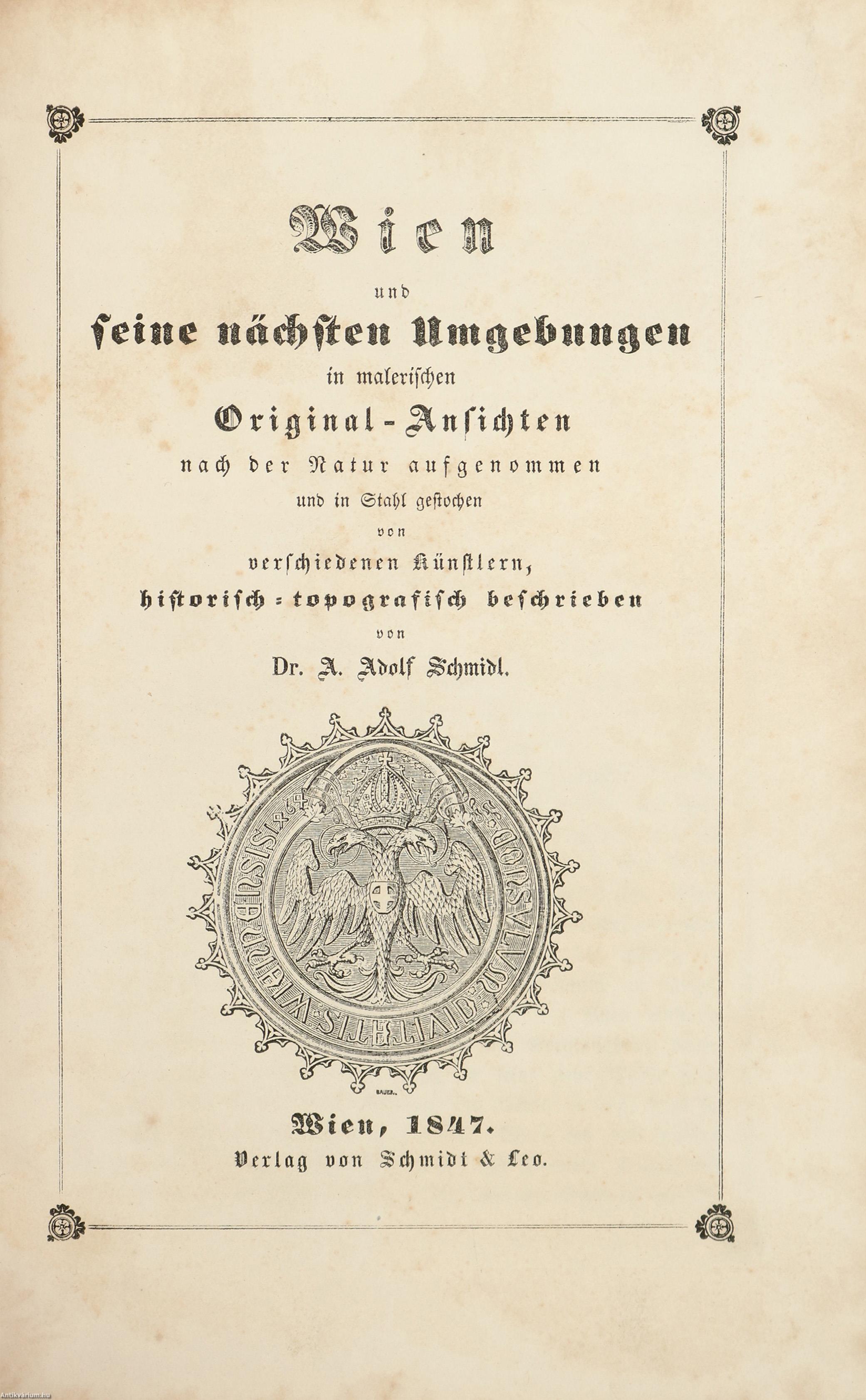 Wien und seine nächsten Umgebungen in malerischen Original-Ansichten nach der Natur aufgenommen und in Stahl gestochen von verschiedenen Künstlern, historisch-topografisch beschrieben von Dr. A. Adolf Schmidl. / Bécsnek és közvetlen környékének, különböző művészek által a természet után készített és acélba metszett eredeti festői képei. A történeti és topográfiai leírást Dr. A. Adolf Schmidl készítette.
