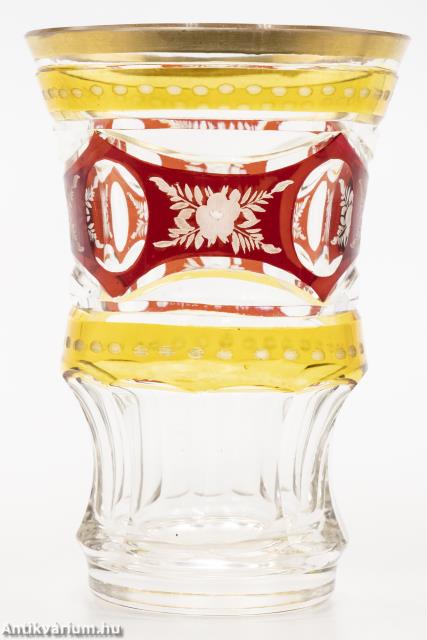 Hibátlan állapotú, fújt és kézzel formázott, színtelen cseh üveg pohár a 20. század elejéről. Külső felületét vízszintes elrendezésben részletgazdag, kézzel festett sárga és piros mintázat fedi, amely növényornamentikai formákat ábrázol, alsó része hámozott üveg. Felső peremét jó állapotú kontúros aranyozás díszíti.