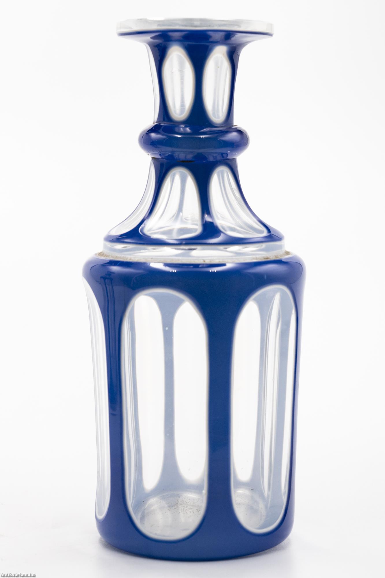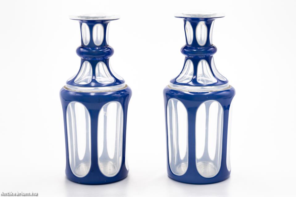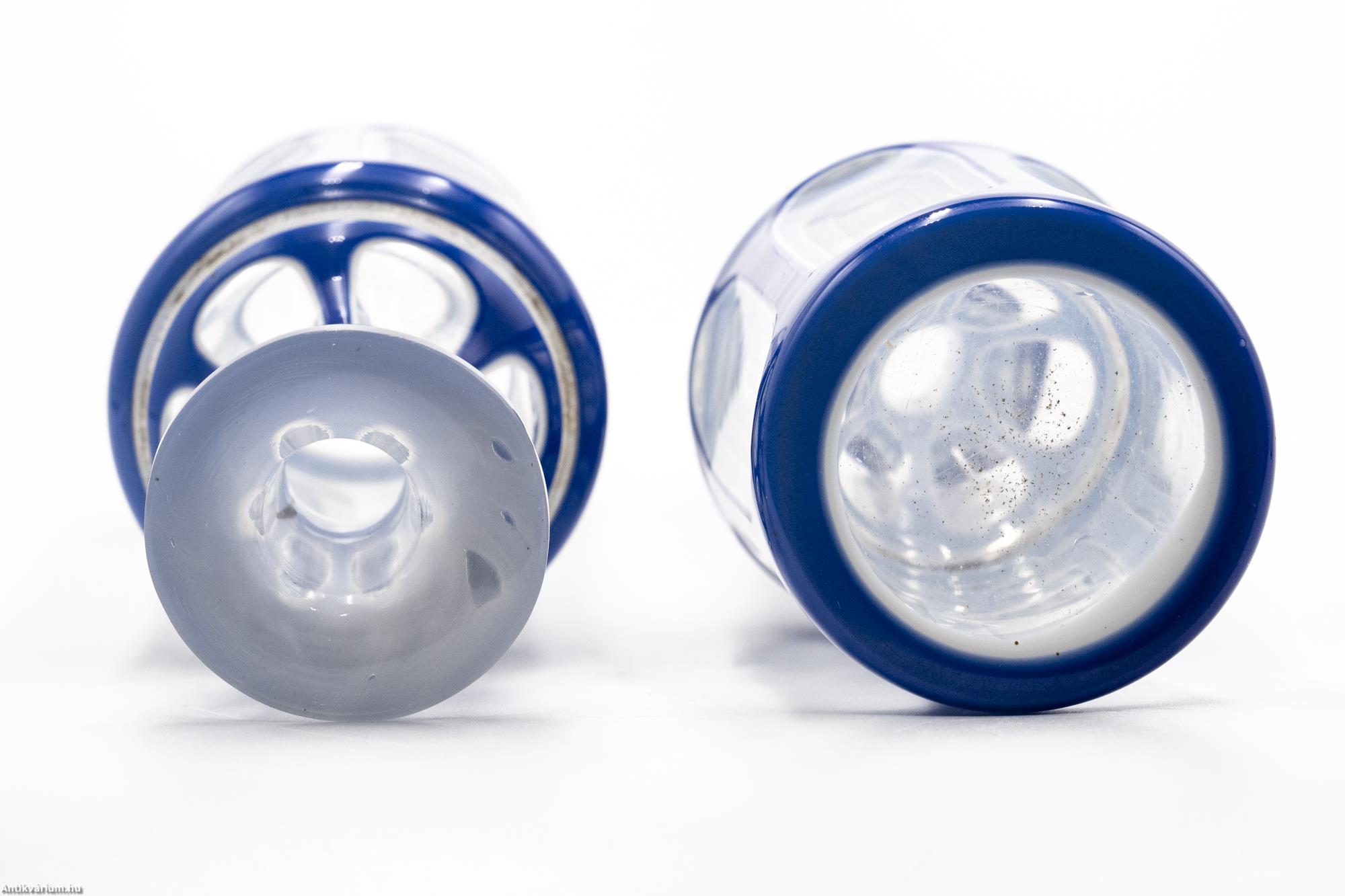 Hibátlan állapotú, fújt és kézzel formázott kék színű überfang üveg tartó szett az 1850-es évekből. A jellegzetes biedermeier szett kettő darab azonos méretű és formájú üveg tartóból áll. A vastagfalú, többrétegű üveg mélyen és egyenletesen vágott, kifinomult csiszolásokkal díszített, amelyek megjelennek az egész felületen. A külső üvegrétege kék színű, benne színtelen üvegrétegű geometrikusan megformált ovális és kerek alakú visszacsiszolások láthatóak. A szabályosan megjelenő, ismétlődő motívumnak kiváló hátteret ad az üveg hengeres alakja, amelynek felületén szinte megsokszorozódik az überfang csiszolás optikai képe.