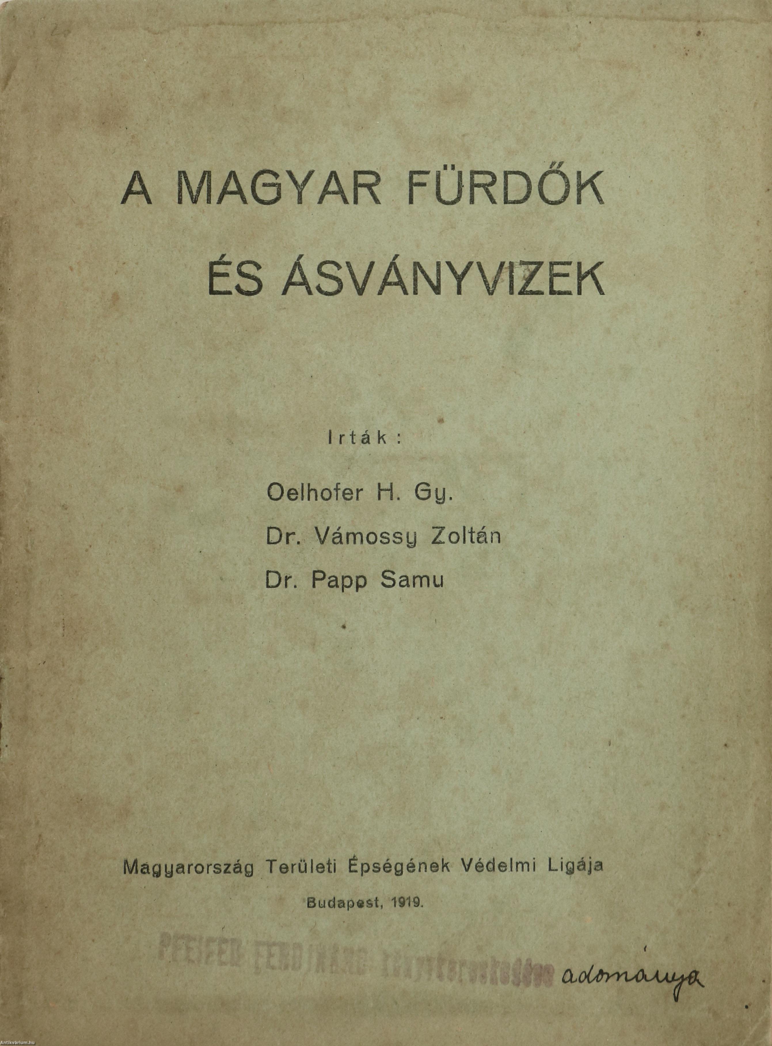 Oelhofer H. Gy./Vámossy Zoltán, Dr./Papp Samu, Dr.: A magyar fürdők és ásványvizek