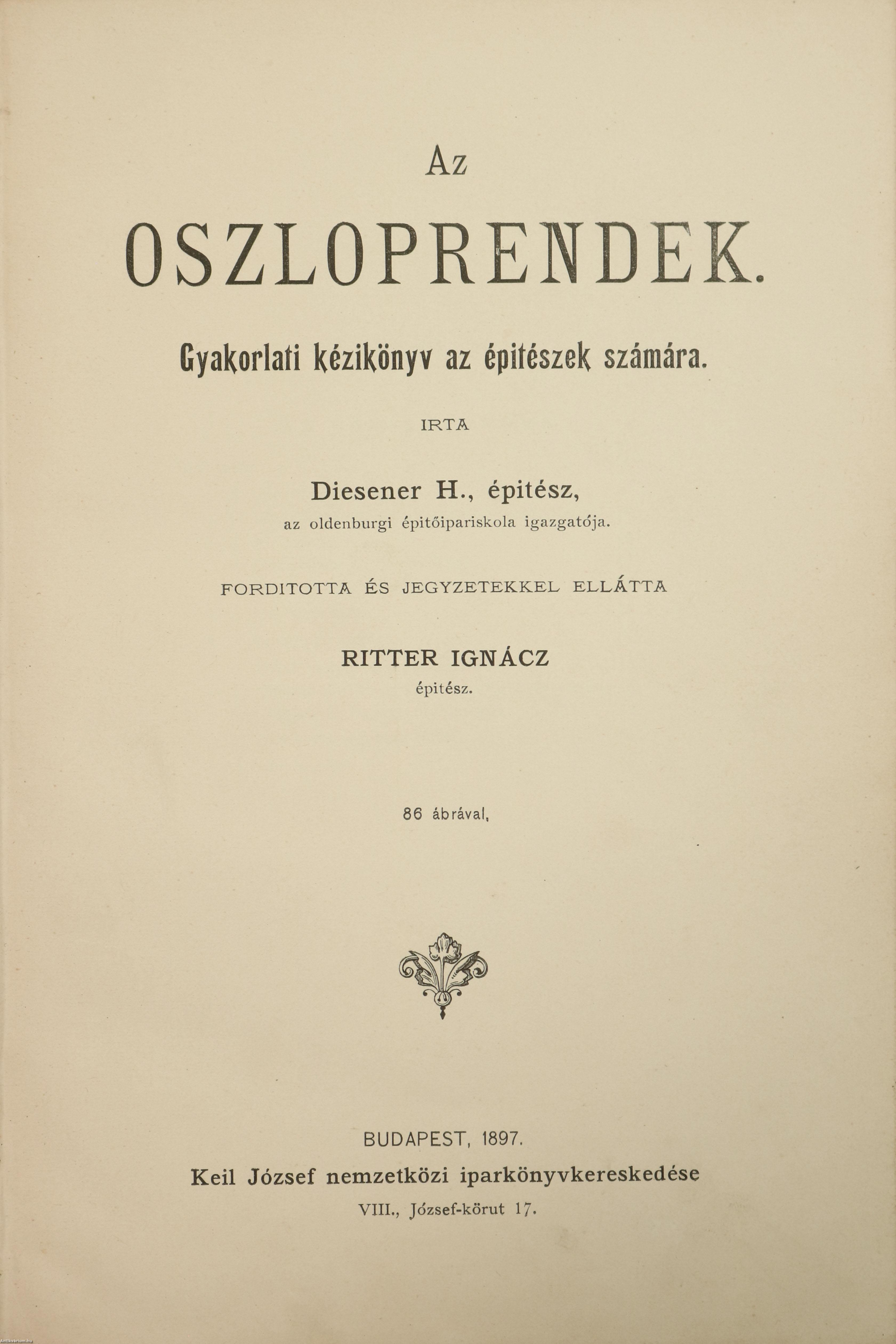 Első kiadás.Gyakorlati kézikönyv építészek számára. VII. 1. Az oszloprendek. Írta: Diesener H[einrich]., építész, az oldenburgi építőipariskola igazgatója. Fordította és jegyzetekkel ellátta Ritter Ignácz építész. 86 fekete-fehér, szöveg közti ábrával és 10 mintalappal. A mintalapok a kötet végén található kiadói könyvreklámok részei, az ott bemutatott könyvekből mutatnak részleteket.