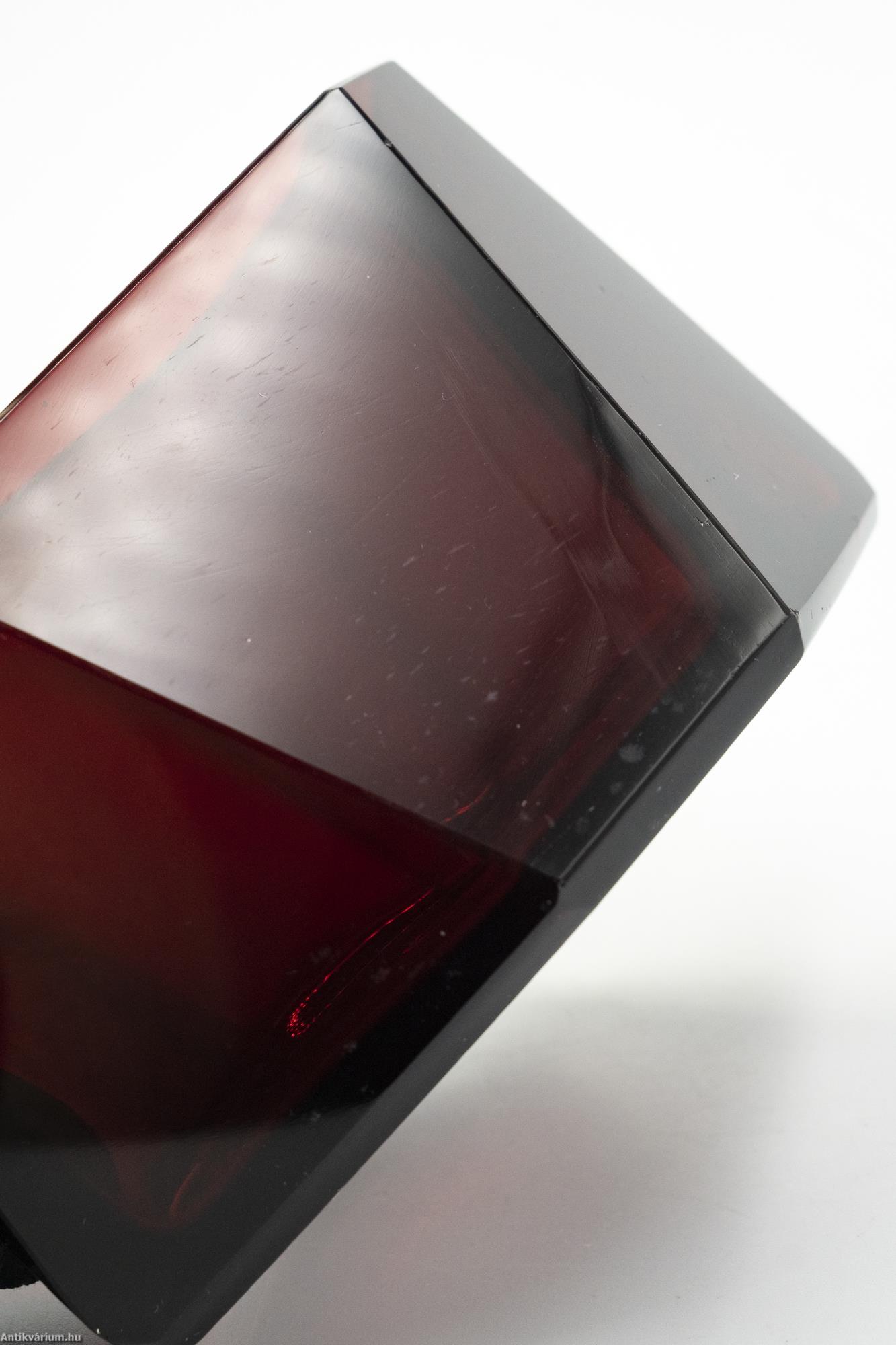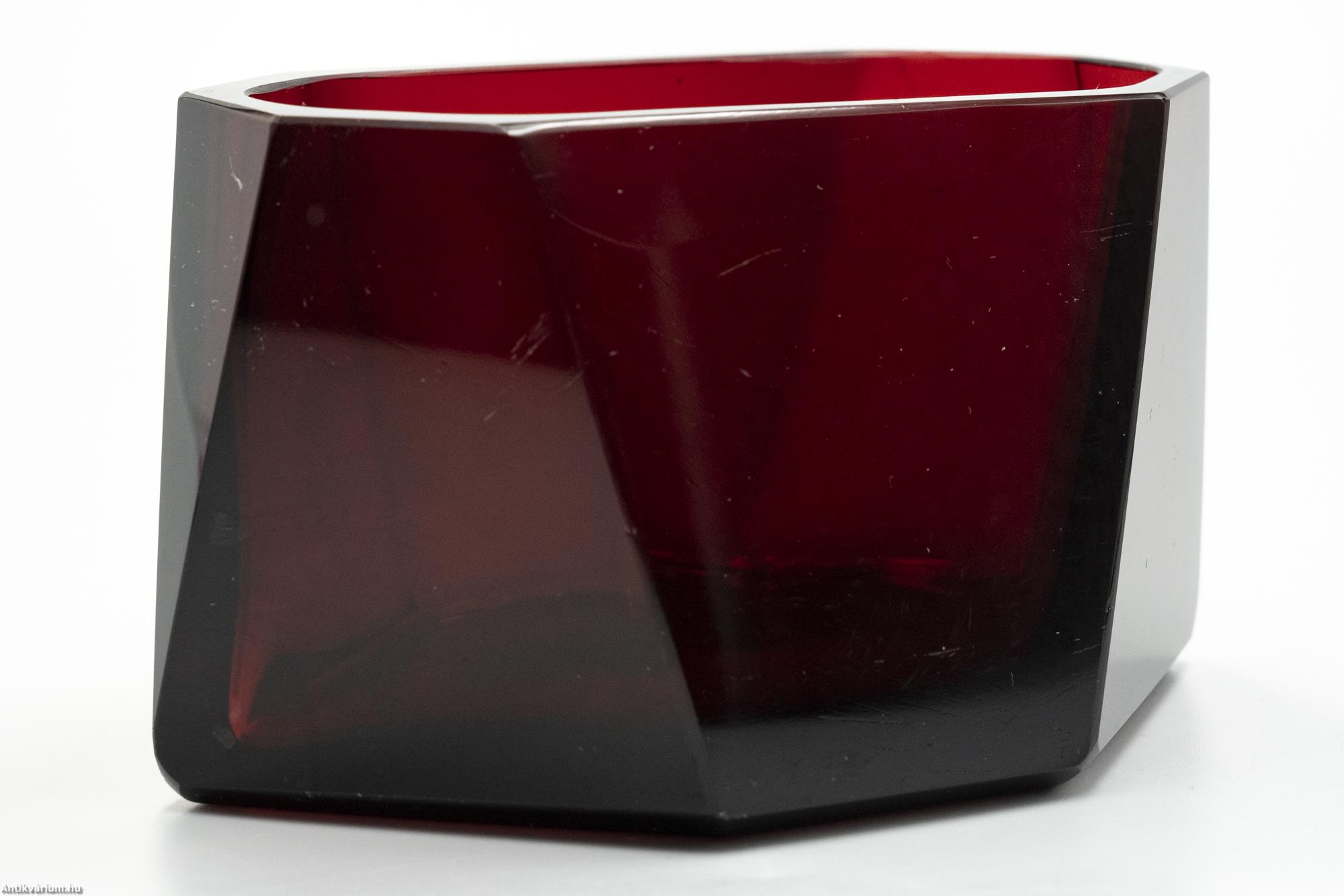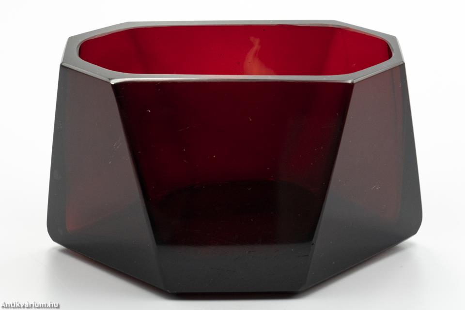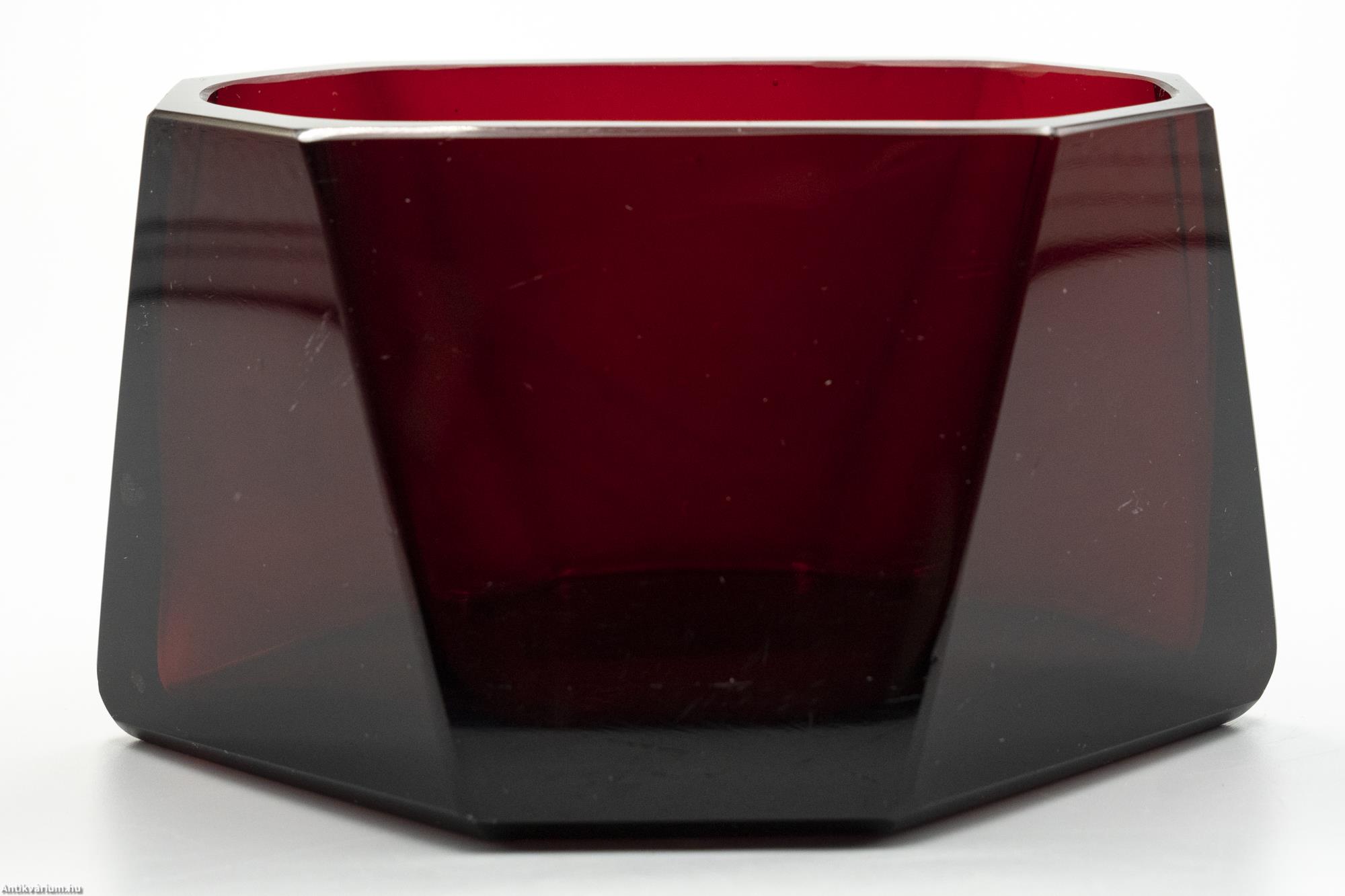 Hibátlan állapotú, fújt és kézzel formázott, valamint csiszolt art deco Moser üveg tál a 20. század első feléből. A kor formai stílusának megfelelően geometrikus alakzatok adják a tál alakját. Nyolcszögletű lapra csiszolt oldalai hatszög alakú mélyedést fognak közre. Tömör, vastag falú, nagy súlyú üveg dísztárgy, amelynek geometrikus formáit és éles szögeit a intenzív rubin vörös szín tesz még különlegesebbé.