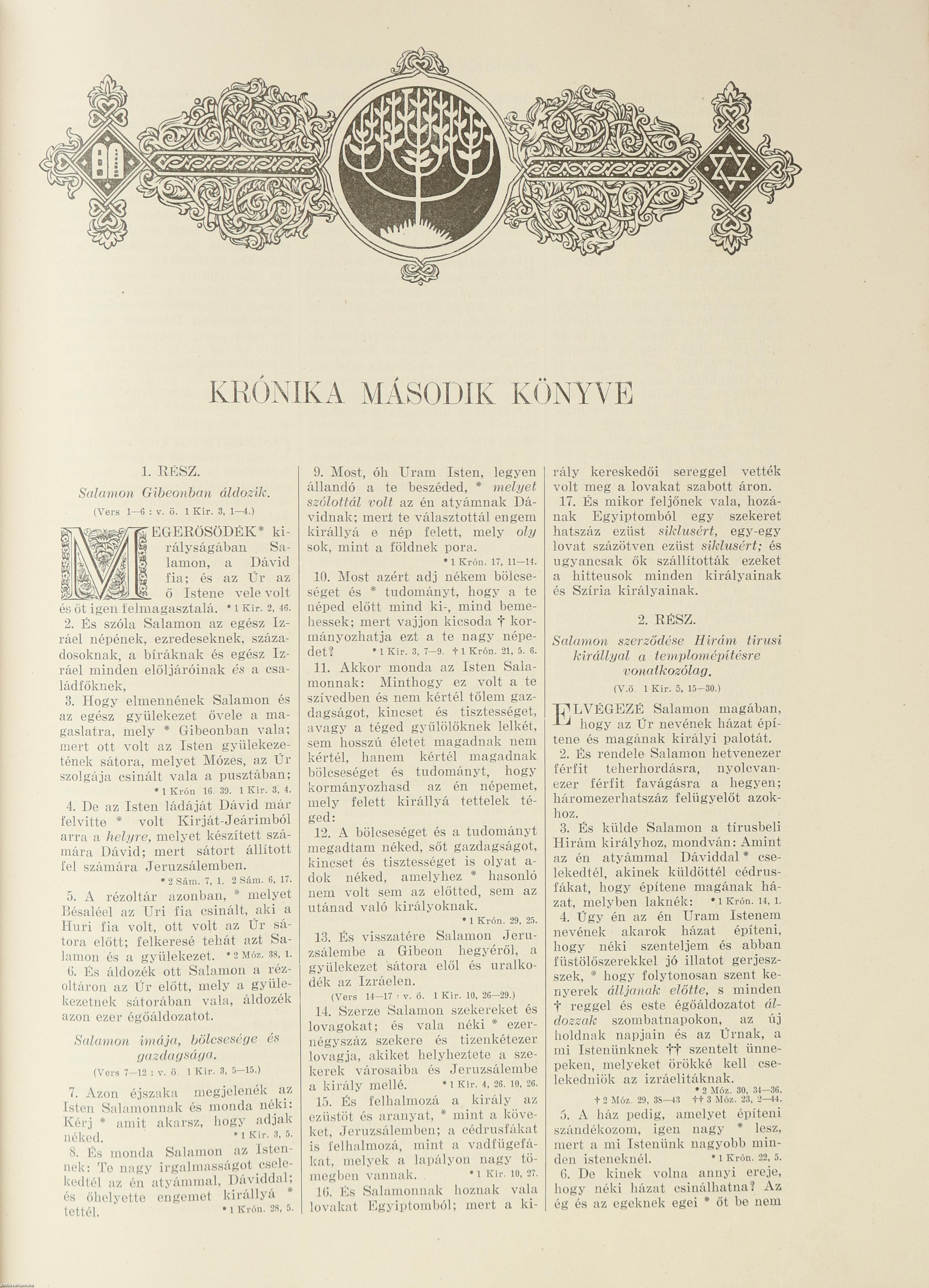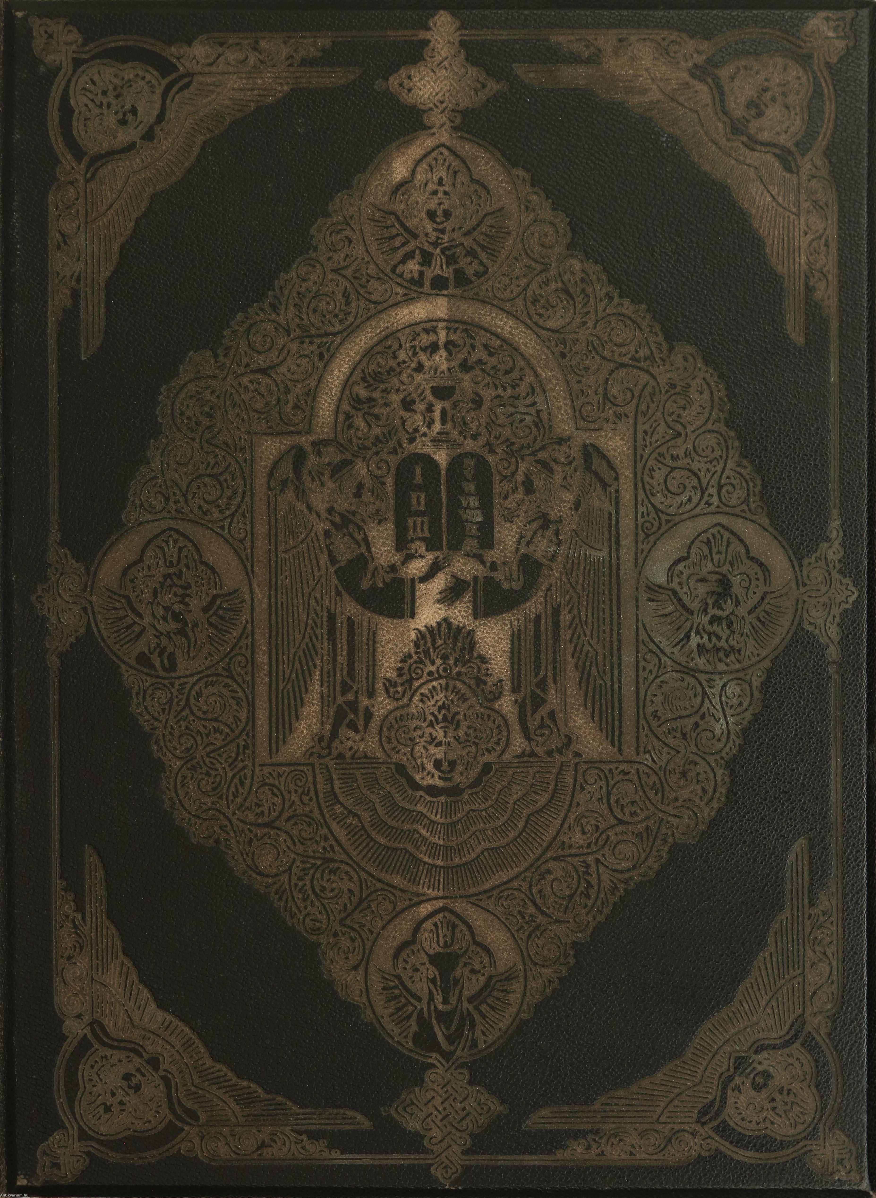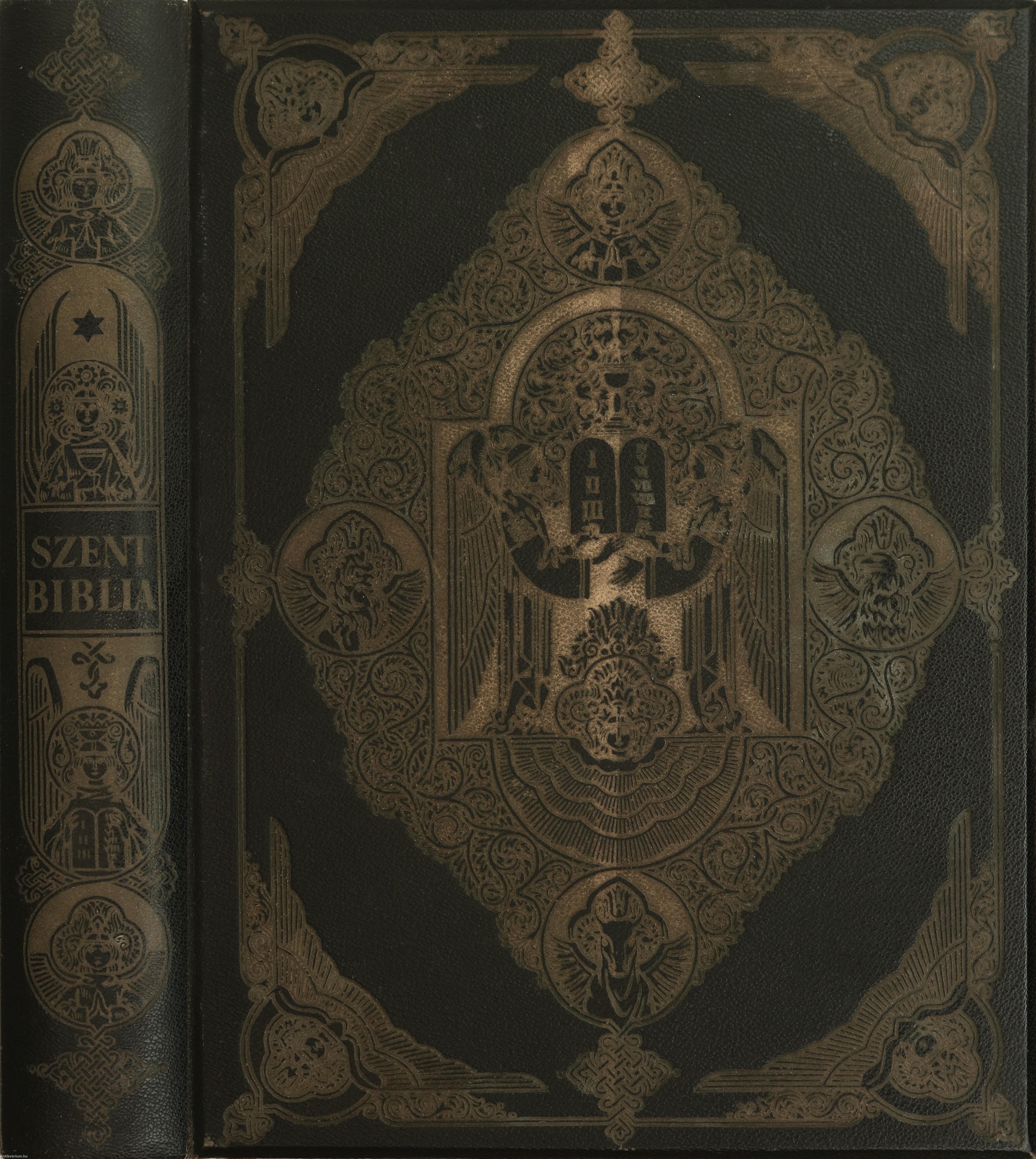Kiadói bőr díszkötésben lévő példány aranyozott, dombornyomott bibliai motívumokkal díszített címfedéllel, aranyozott feliratos, díszes könyvgerinccel, dombornyomott keretdíszes hátlappal, színes kiadói előzéklapokkal, felül színezett lapélekkel, tiszta belívekkel, hiánytalan állapotban, felnyitható, sérült kiadói védődobozban.