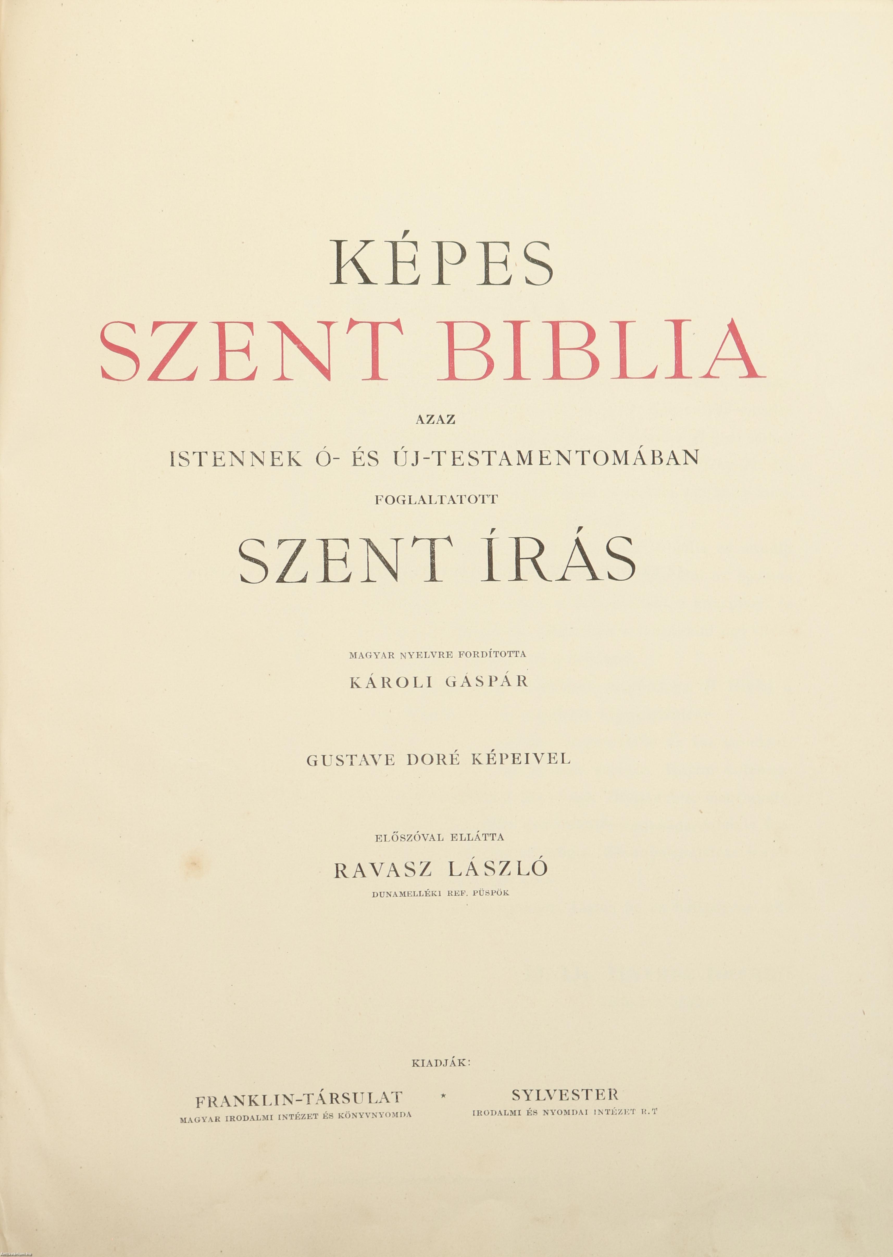 Az eredeti szöveggel egybevetett és átdolgozott kiadás. Dr. Ravasz László dunamelléki református püspök előszavával ellátott, teljes, illusztrált Szentírás. Címlapképen egy színes, hártyapapírral védett képtáblával, valamint további számos, oldalszámozáson belüli, fekete-fehér, egész oldalas képpel. Az illusztrációk Gustave Doré francia festőművész munkáinak reprodukciói. A kötetet továbbá fekete-fehér könyvdíszek és iniciálék ékesíti. A címlap elé kötve egy dúsan aranyozott, díszes emléklap látható, rajta tollal írt, régi tulajdonosi bejegyzésekkel. A könyvet a Sylvester Nyomda nyomtatta Budapesten. A kötés a Franklin-Társulat könyvkötészetének munkája.