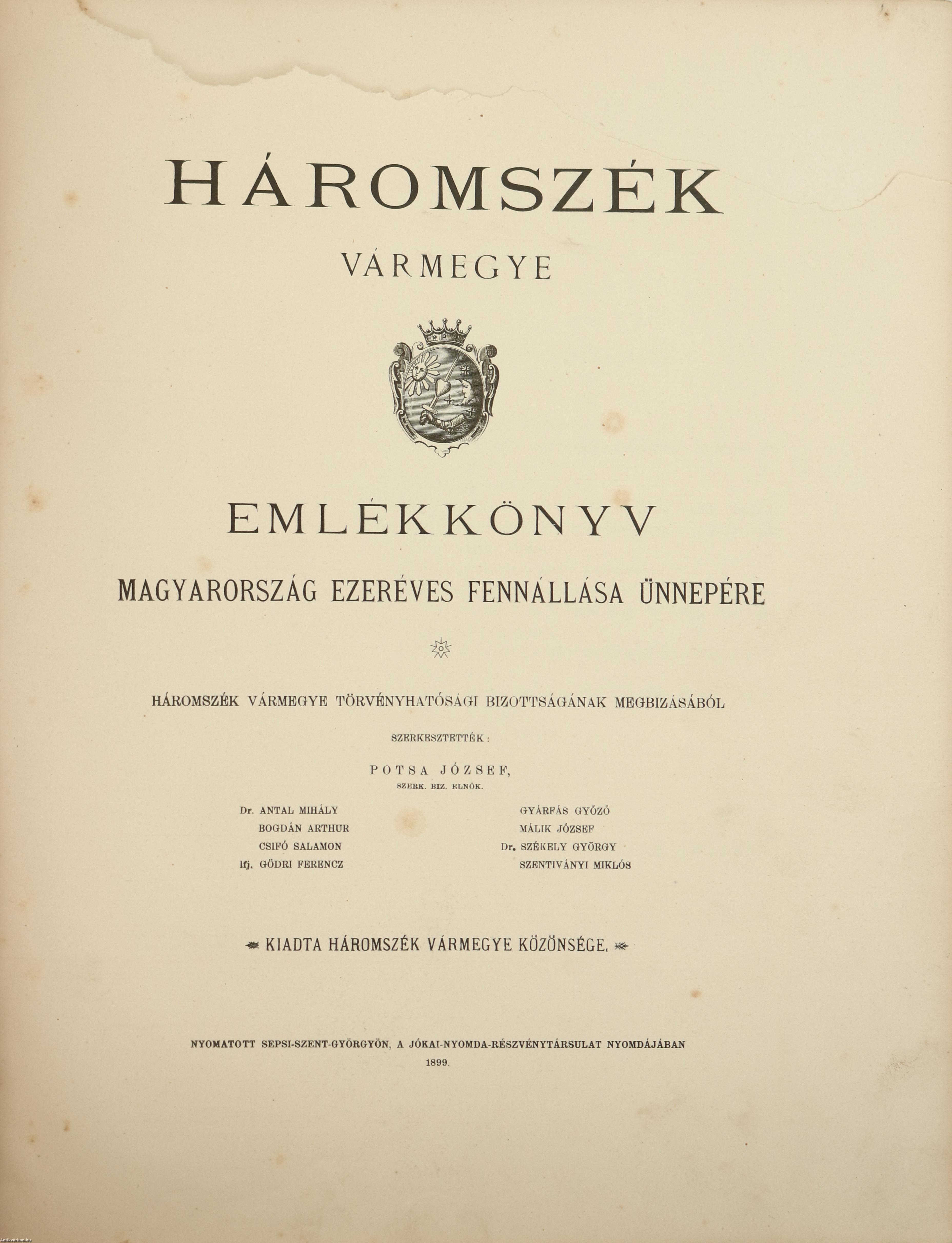 Első kiadás. Háromszék vármegye. Emlékkönyv Magyarország ezeréves fennállása ünnepére. Szerkesztették: Potsa József, Dr. Antal Mihály, Bogdán Arthur, Csifó Salamon, ifj. Gödri Ferencz, Gyárfás Győző, Málik József, Dr. Székely György, Szentiványi Miklós.