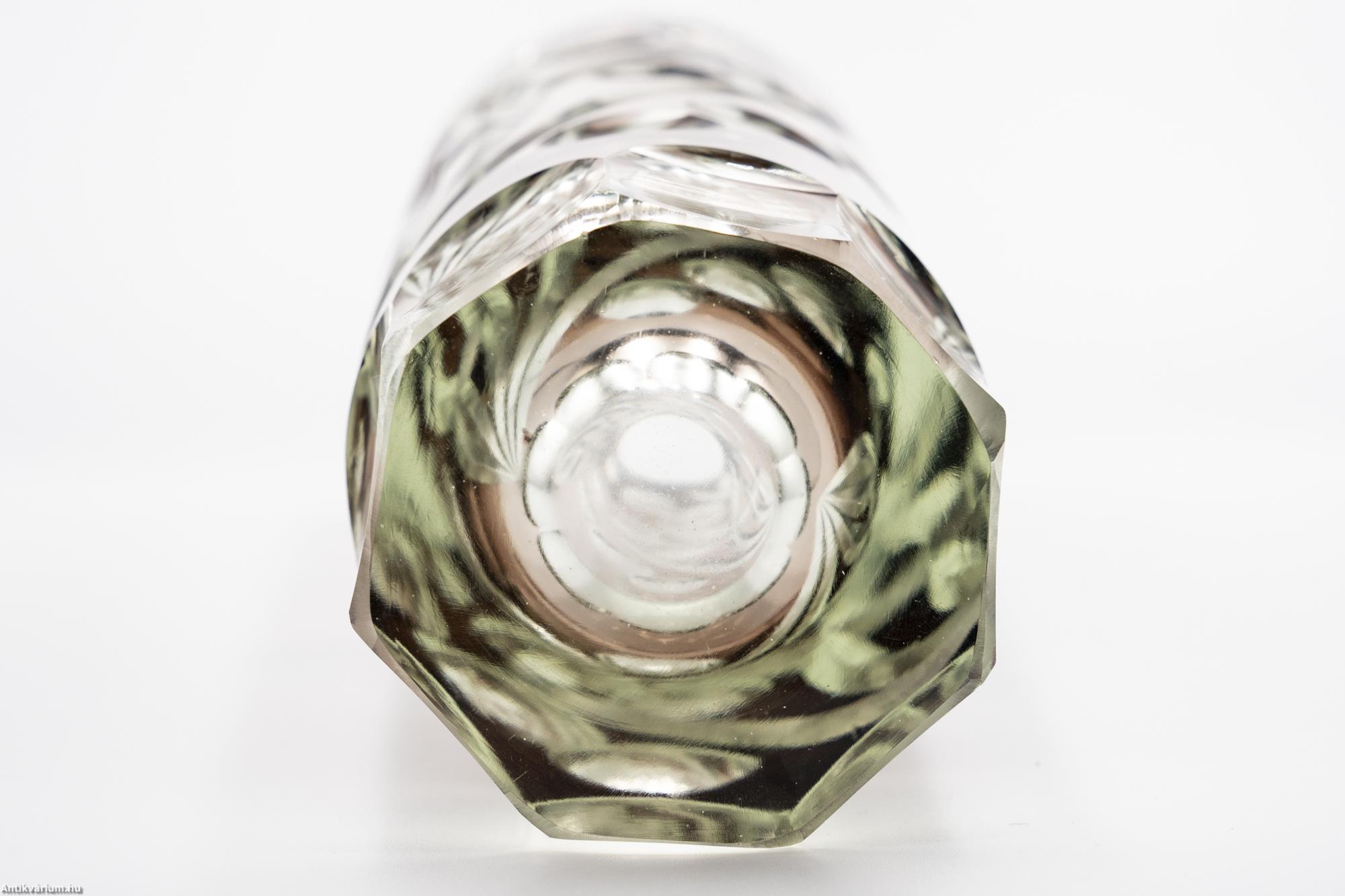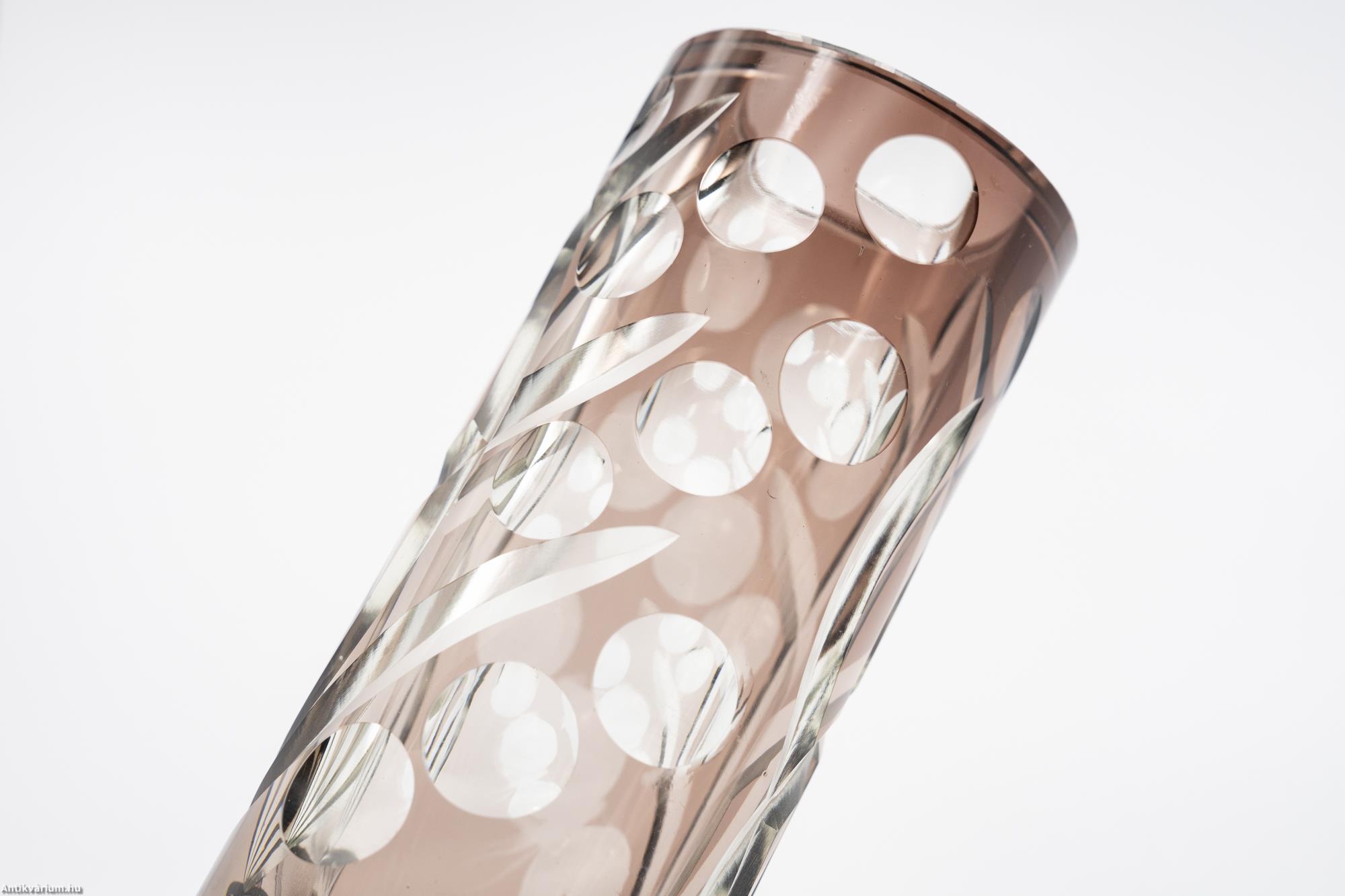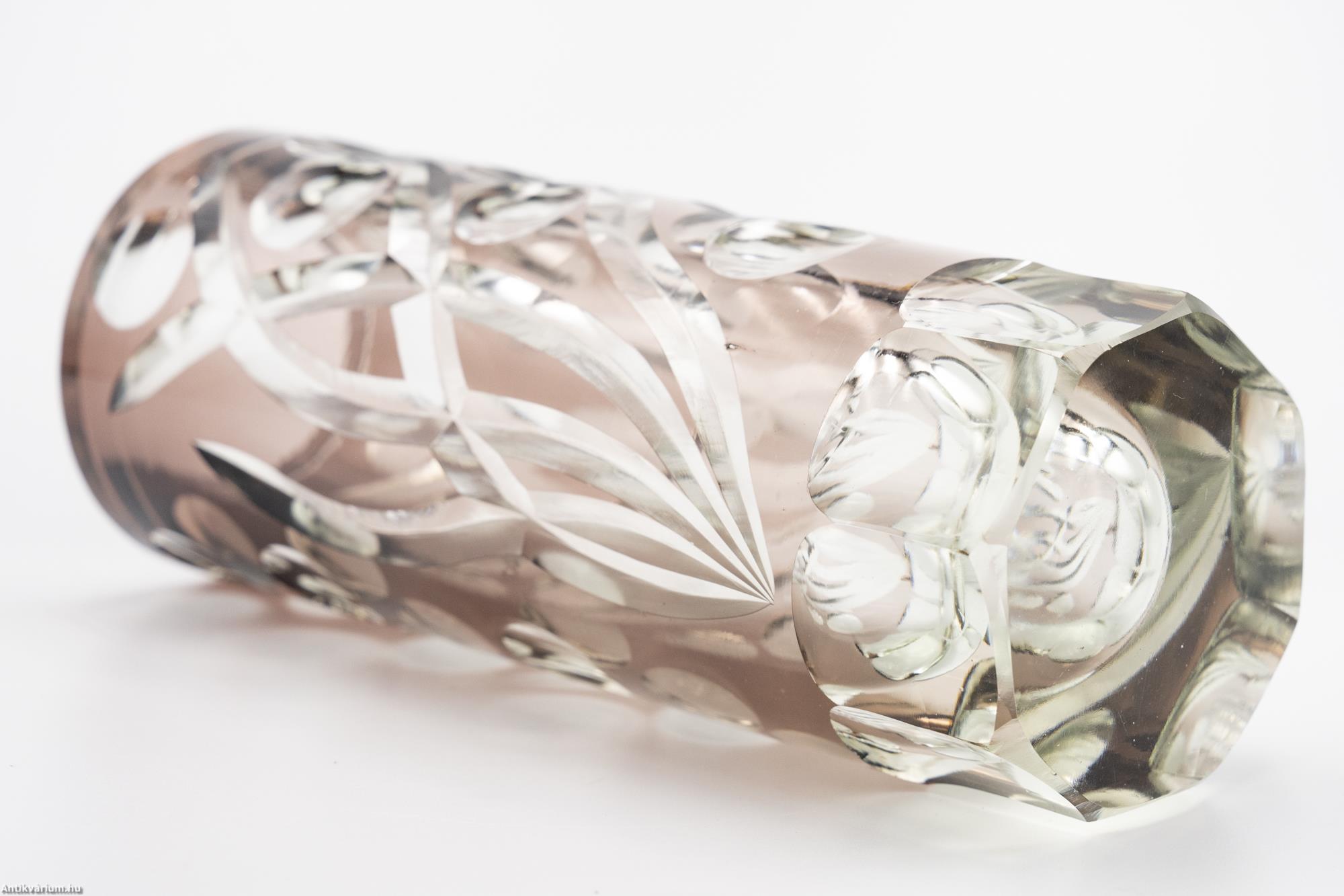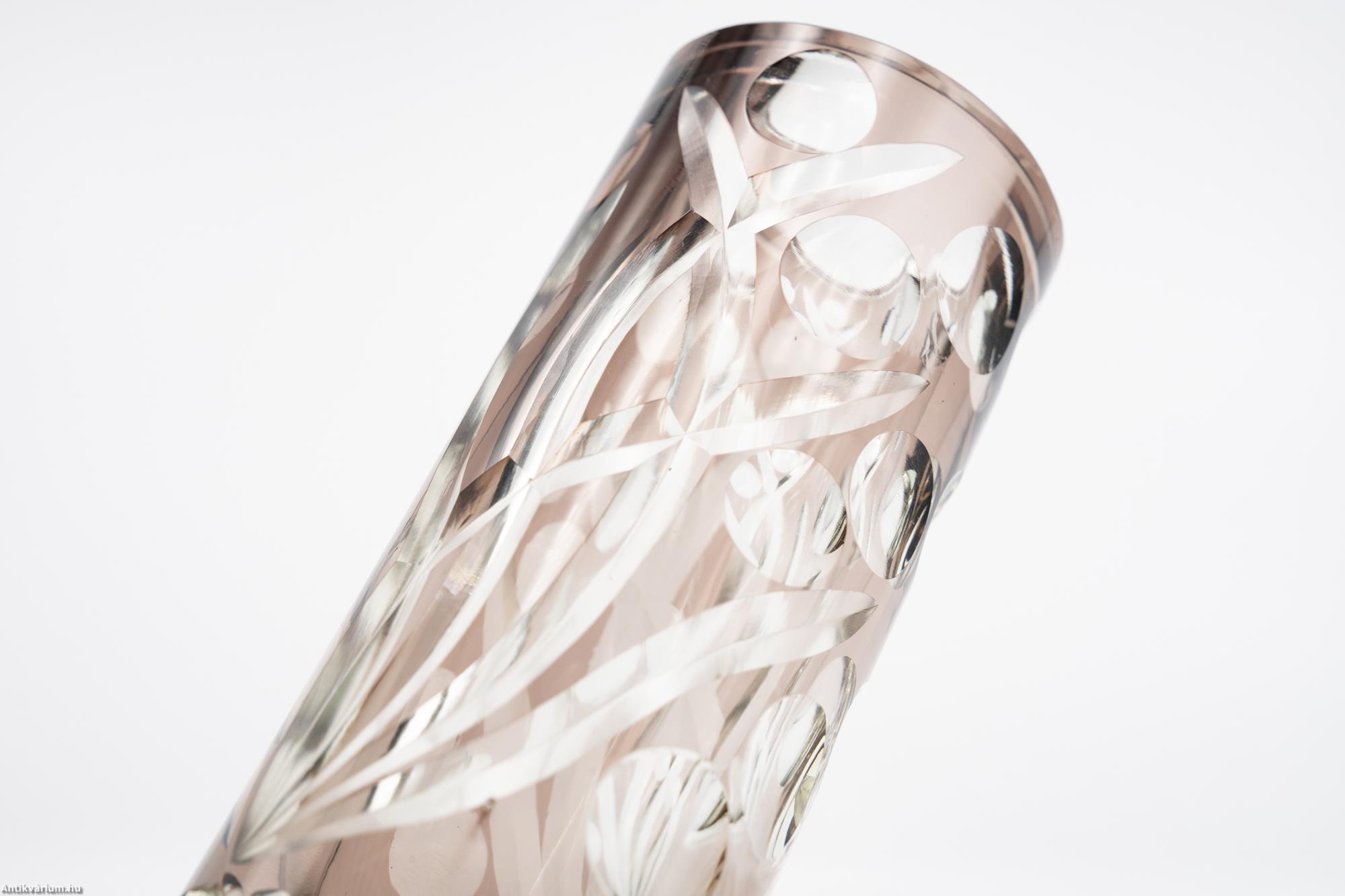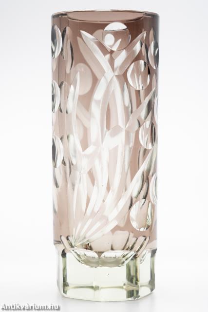 Hibátlan állapotú, fújt és kézzel formázott valamint csiszolt überfang üveg váza a 20. század közepéből. Átlátszó, vastag üvegrétege barna színátmenetes, benne kör és levél formájú színtelen visszacsiszolásokkal, amelyek ismétlődően futnak körbe az egész felületen. Egyenletes henger formája és nyújtott alakja kiváló hátteret ad ennek a szabályos mintázatnak, amelynek felületén szinte megsokszorozódik az überfang csiszolás optikai képe. Különlegessége a színtelen üvegből készült, szögletes tömör talp rész. Gyönyörűen metszett és csiszolt, dekoratív prémium kategóriás alkotás.