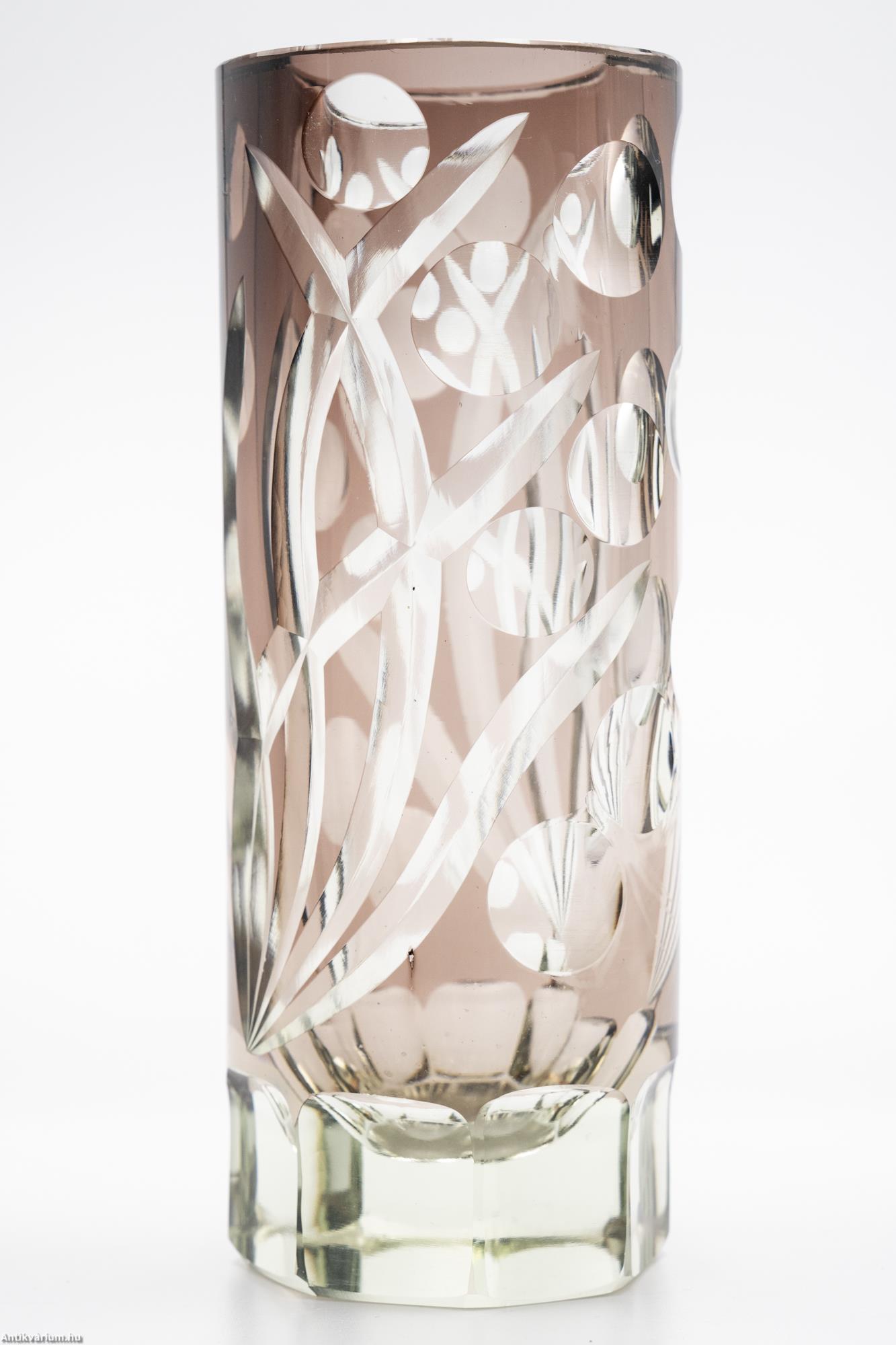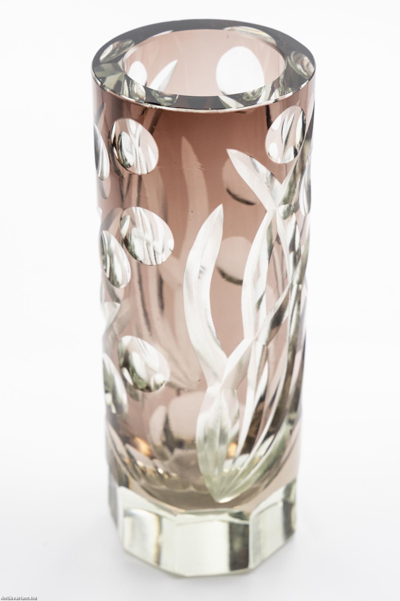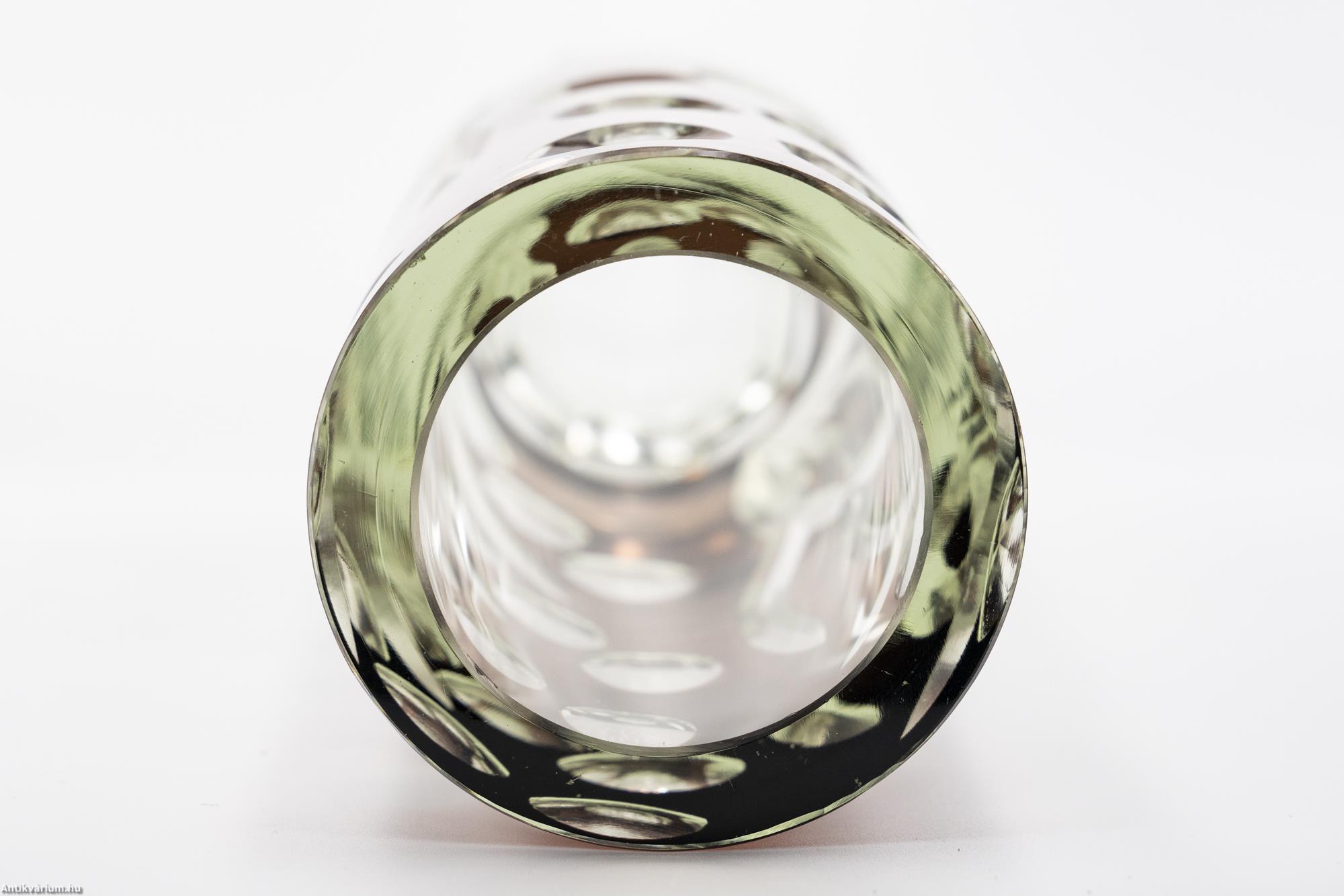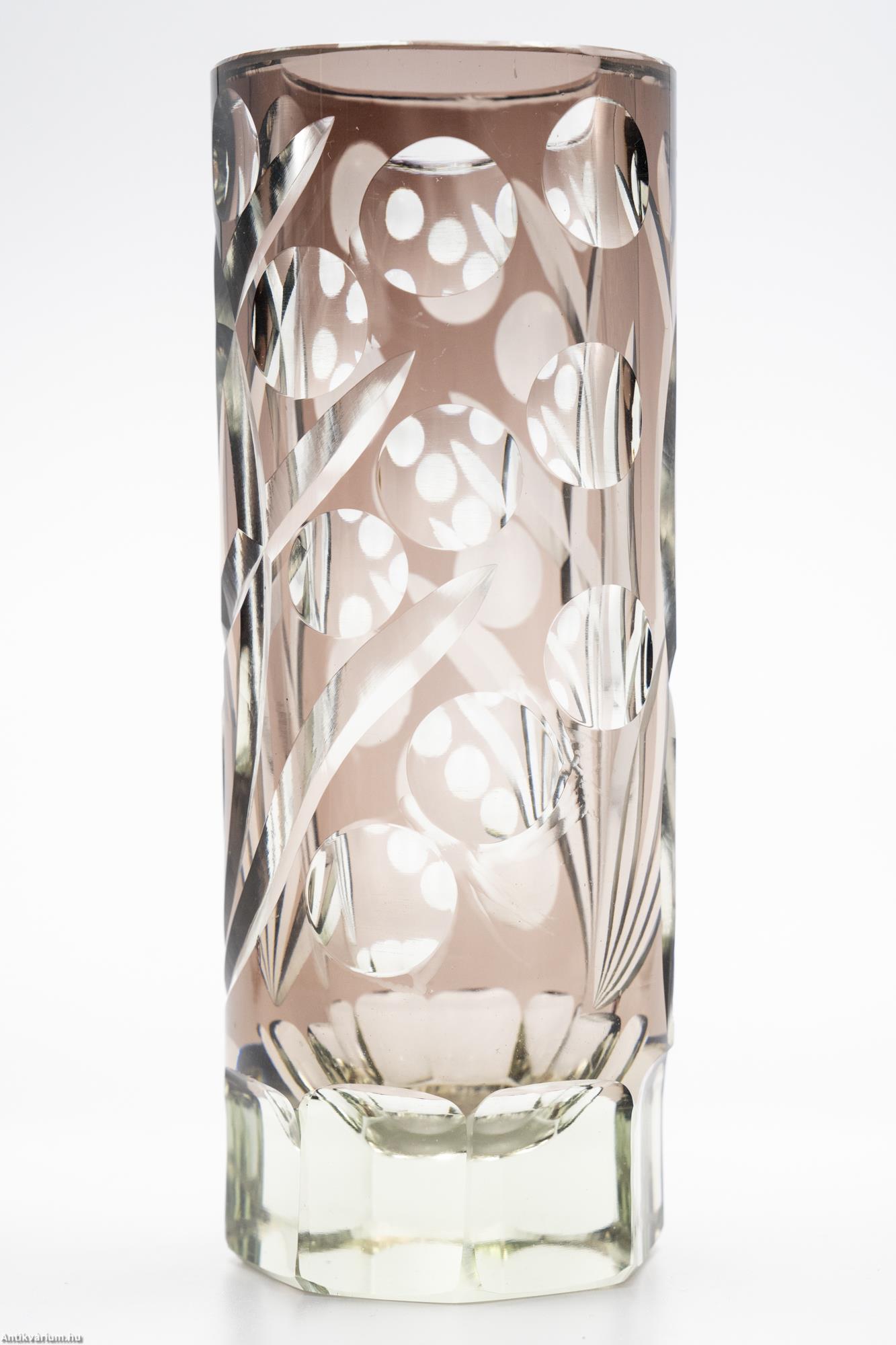 Hibátlan állapotú, fújt és kézzel formázott valamint csiszolt überfang üveg váza a 20. század közepéből. Átlátszó, vastag üvegrétege barna színátmenetes, benne kör és levél formájú színtelen visszacsiszolásokkal, amelyek ismétlődően futnak körbe az egész felületen. Egyenletes henger formája és nyújtott alakja kiváló hátteret ad ennek a szabályos mintázatnak, amelynek felületén szinte megsokszorozódik az überfang csiszolás optikai képe. Különlegessége a színtelen üvegből készült, szögletes tömör talp rész. Gyönyörűen metszett és csiszolt, dekoratív prémium kategóriás alkotás.