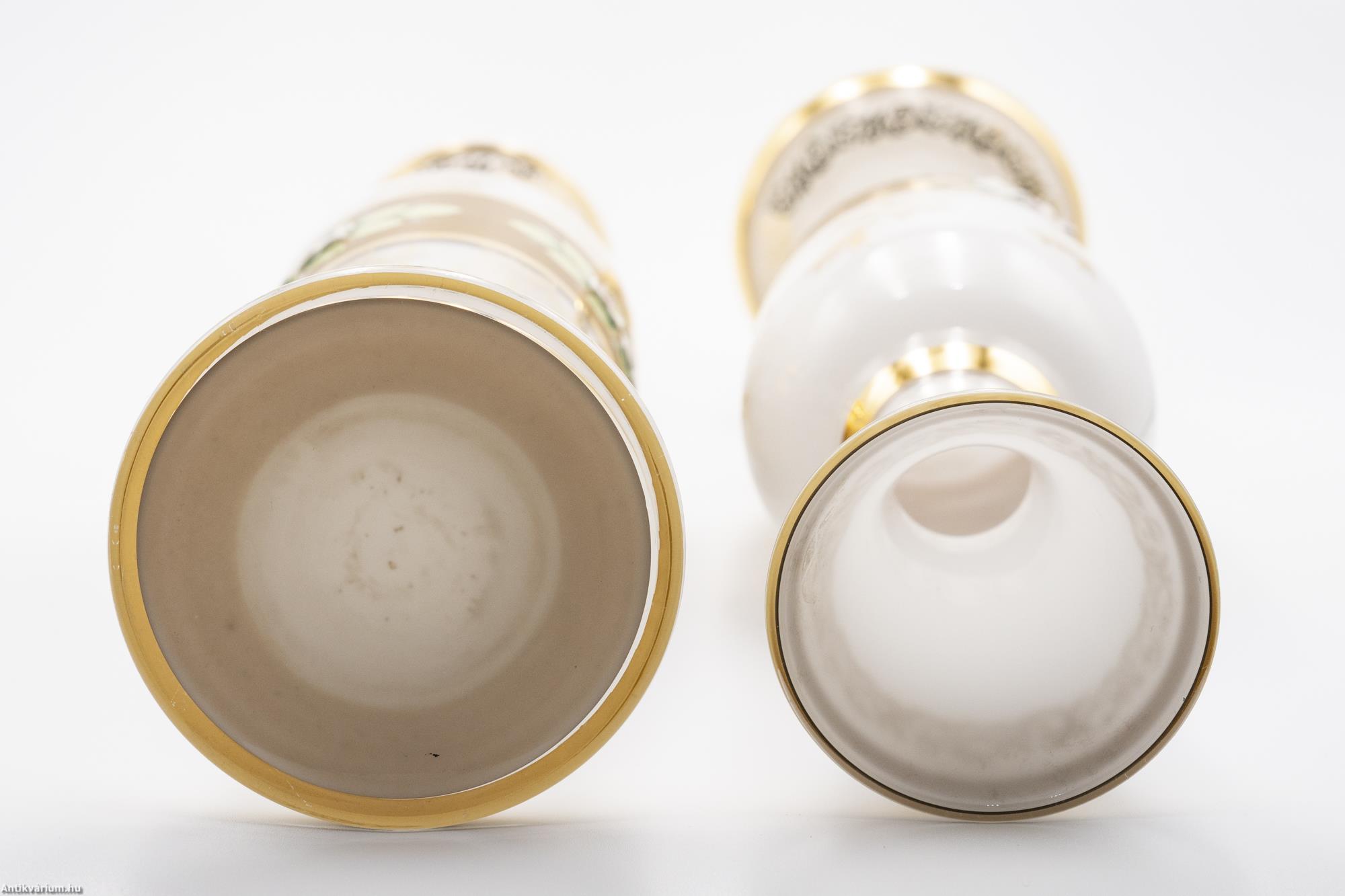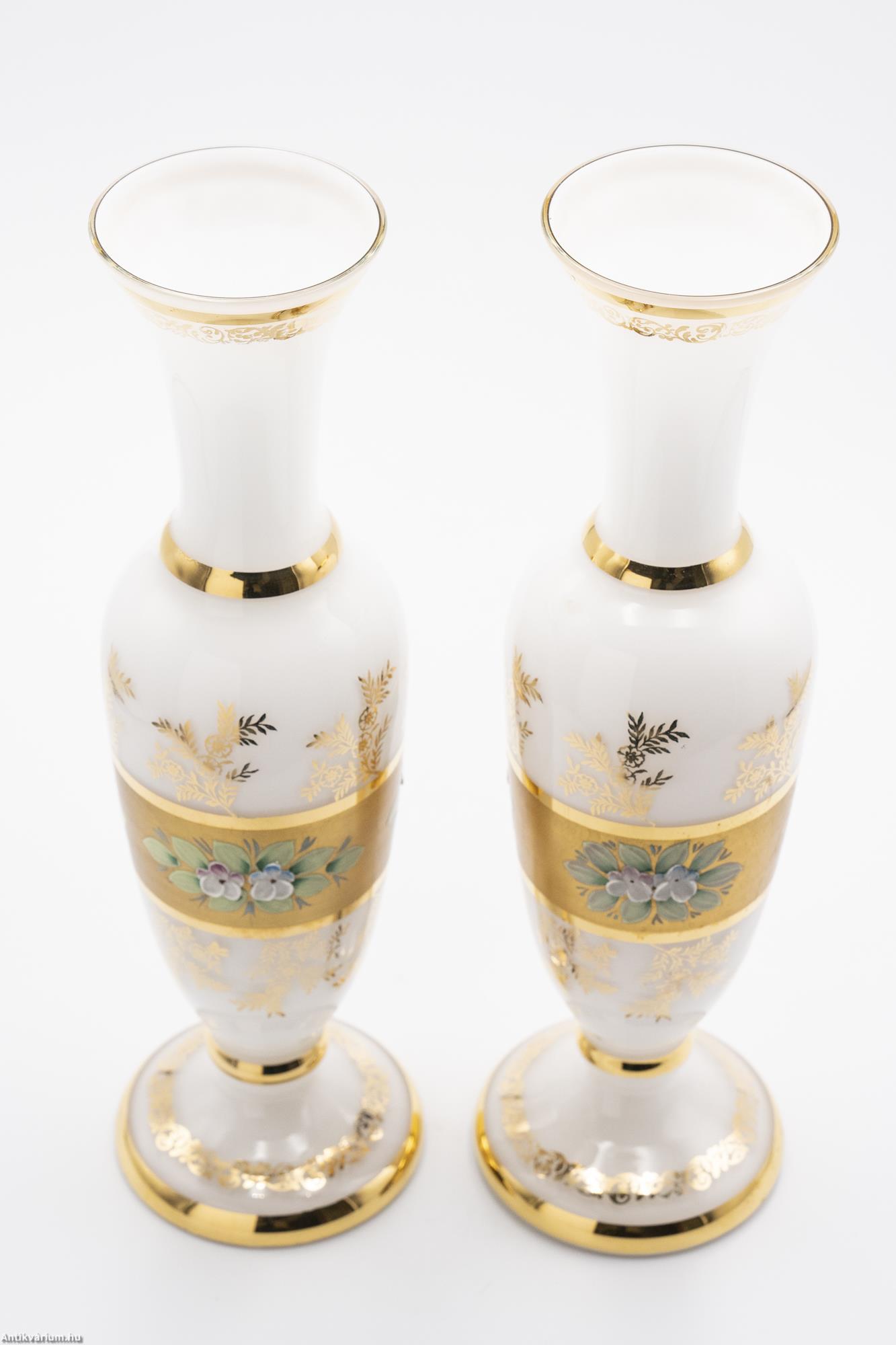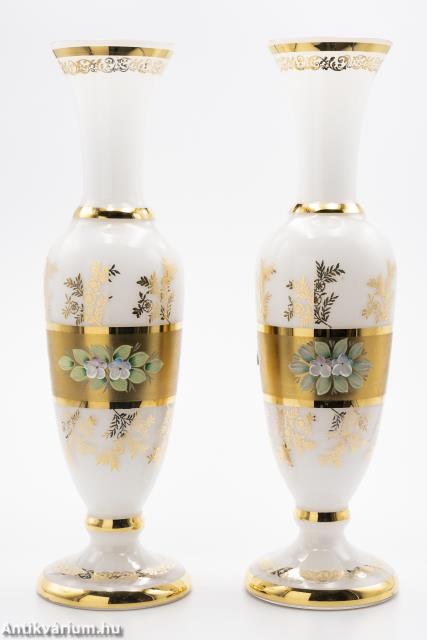 Hibátlan állapotú Murano üveg váza pár az 1940-es évekből. Fújt és kézzel formázott nagy méretű üveg dísztárgy pár. Kétrétegű üveg váza pár, amelynek belső fehér rétegét kívülről színtelen üvegréteg borítja. Az üveg vázák felülete arannyal festett valamint kézzel festett domború, a korra jellemző színes virágmotívumokkal díszített, amelyek kiemelik az üveg vázák finom megjelenését. A nyújtott alakú, többszörösen tagolt vázák kontrasztos alakját a felső, középső és alsó részen ismétlődően megjelenő arany kontúr festés hangsúlyozza. Kifinomult ízléssel és igényességgel megalkotott művészi üveg váza pár.
