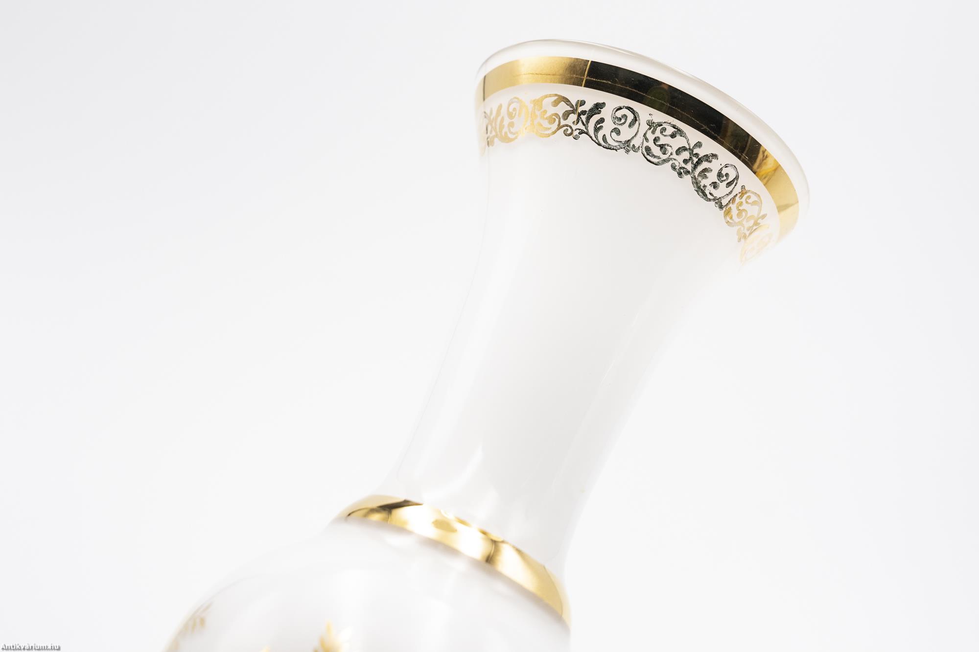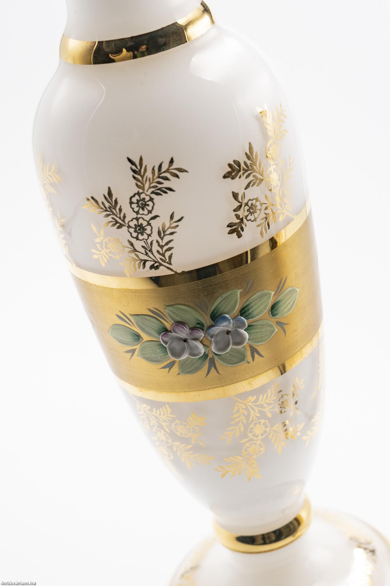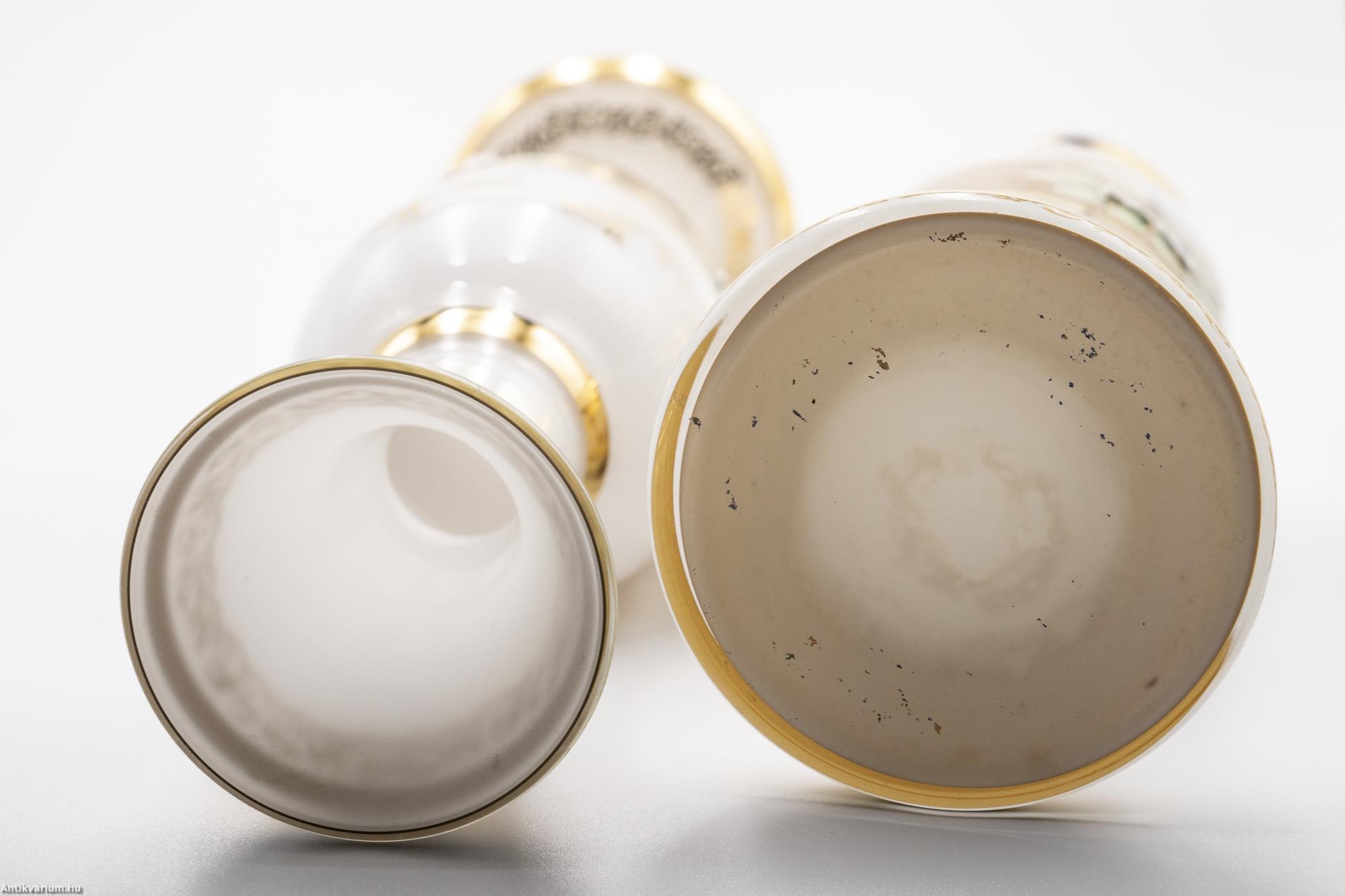 Hibátlan állapotú Murano üveg váza pár az 1940-es évekből. Fújt és kézzel formázott nagy méretű üveg dísztárgy pár. Kétrétegű üveg váza pár, amelynek belső fehér rétegét kívülről színtelen üvegréteg borítja. Az üveg vázák felülete arannyal festett valamint kézzel festett domború, a korra jellemző színes virágmotívumokkal díszített, amelyek kiemelik az üveg vázák finom megjelenését. A nyújtott alakú, többszörösen tagolt vázák kontrasztos alakját a felső, középső és alsó részen ismétlődően megjelenő arany kontúr festés hangsúlyozza. Kifinomult ízléssel és igényességgel megalkotott művészi üveg váza pár.