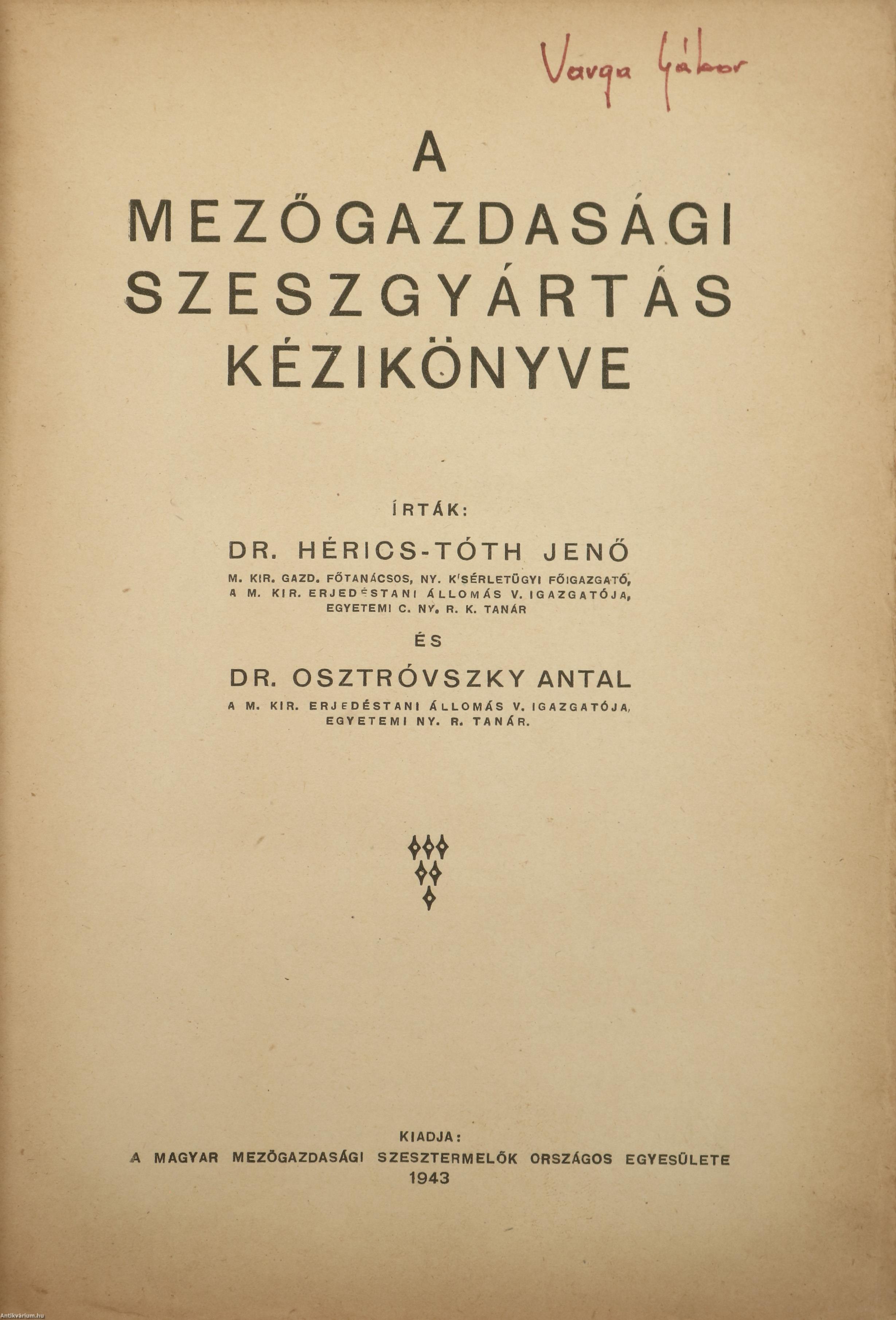Rédly Gyula által aláírt, Natter-Nád Miksa részére írt levélmelléklettel ellátott példány. Első kiadás. A mezőgazdasági szeszgyártás kézikönyve. Írták: Dr. Hérics-Tóth Jenő a m. kir. gazd. főtanácsos, ny. kisérletügyi főigazgató, a M. Kir. Erjedéstani Állomás V. igazgatója, egyetemi c. ny. r. k. tanár és Dr. Osztróvszky Antal a M. Kir. Erjedéstani Állomás V. igazgatója, egyetemi ny. r. tanár. 107 szöveg közti, fekete-fehér, feliratozott ábrával illusztrált, valamint előszóval, a felhasznált irodalmak jegyzékével, betűsoros tárgymutatóval és részletes tartalomjegyzékkel kiegészített kötet. A címlapon tollal írt tulajdonosi bejegyzés látható. Nyomtatta a "Pátria"-nyomda r.-t., Budapesten. Kiadói egészbőr kötésben lévő példány feliratozatlan címfedéllel és hátlappal, aranyozott feliratozású, sérült könyvgerinccel, mintás kiadói előzéklapokkal, hiánytalan állapotban.