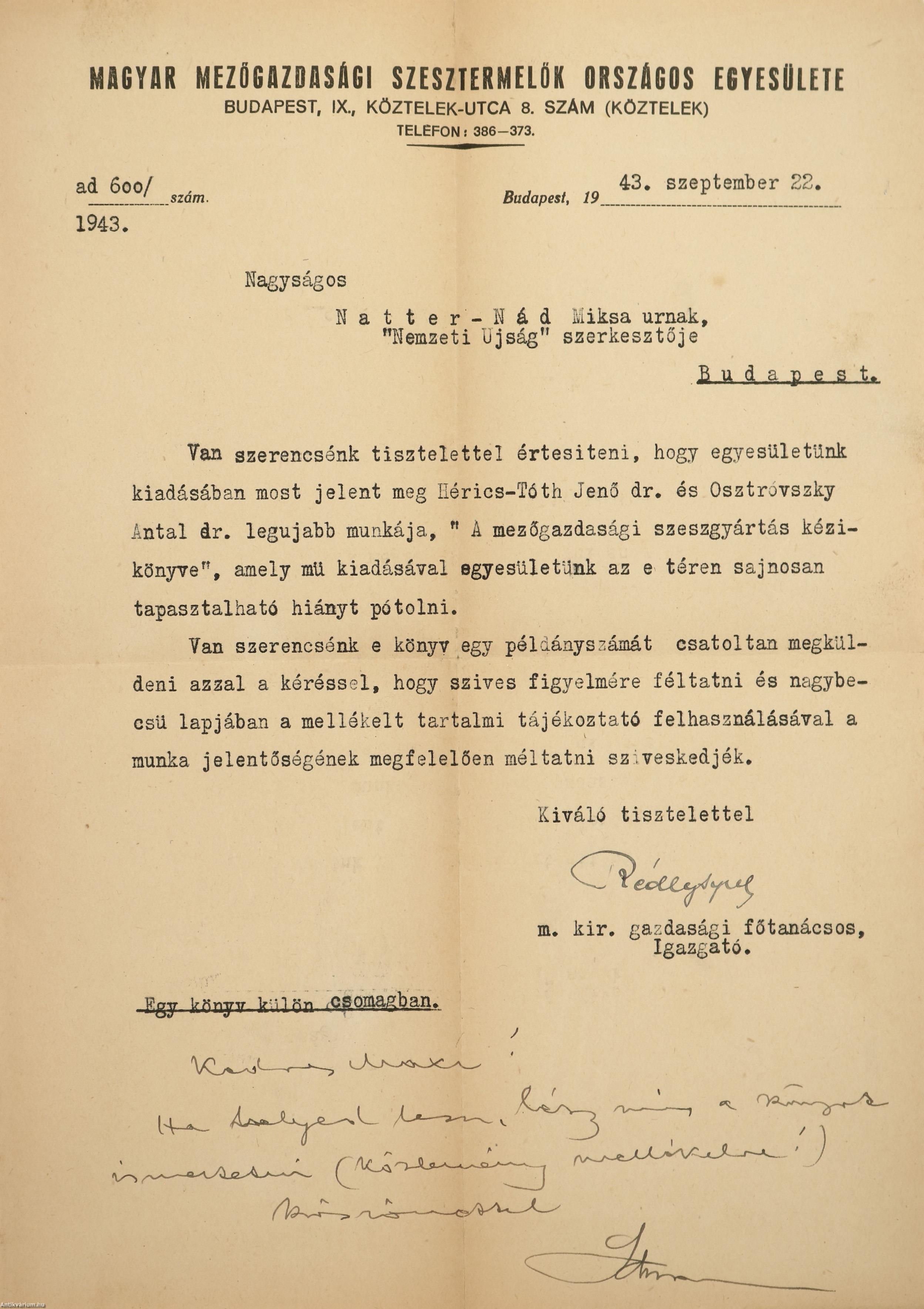 A Magyar Mezőgazdasági Szesztermelők Országos Egyesületének levele Natter-Nád Miksa újságíró részére. A levél végén Rédly Gyula m. kir. gazdasági főtanácsos, igazgató tollal írt, jól olvasható aláírása látható. A levél tárgya: Rédly felhívja a címzett figyelmét a most megjelent "A mezőgazdasági szeszgyártás kézikönyve" c. kötetre, amit csatoltan küld a levéllel. Kéri, hogy a nagyra becsült lapjában a könyvet méltassa. A levélben kért ismertető megjelent a Nemzeti Ujság 1943. okt. 12-i számában. Hajtogatott, ad 600/1943. iktató számmal és keltezéssel ellátott, hiánytalan állapotú levél, az alján tollal írt üzenettel.